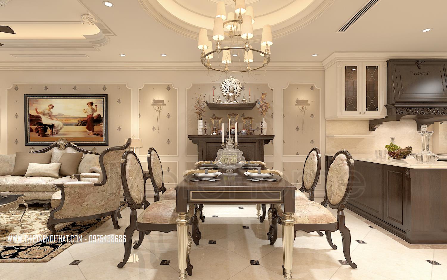 Đặt cạnh bàn ăn tân cổ điển, các kiến trúc sư khéo léo đưa bàn thờ đặt trang trọng ở vị trí giữa cạnh tường vừa để tạo bầu không khí ấm cúng các thành viên luôn được gần gũi bên tổ tiên trong mỗi bữa cơm gia đình vừa giúp tiết kiệm không gian trong căn nhà. Sang bên cạnh phòng ăn chính là phòng bếp với thiết kế các tủ bếp màu gỗ đồng màu với màu bàn ăn và bàn thờ giúp tạo sự kết nối rất tinh tế với cả căn nhà.