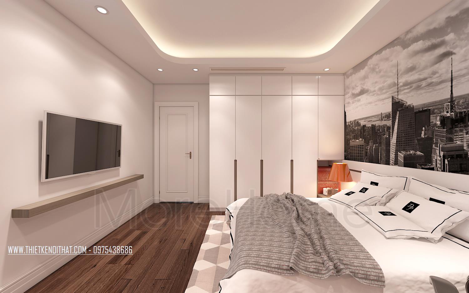 Trong thiết kế nội thất phòng ngủ Master lấy tông màu trắng đen làm tông màu chủ đạo và bức tranh treo tường đen trắng tạo cảm giác hiện đại, thanh lịch cho căn phòng. Giải pháp đèn hắt trần cũng là một chi tiết thú vị giúp căn phòng càng sành điệu hơn gia chủ tùy ý hiệu chỉnh màu sắc theo ý thích của mình. Bên cạnh đó một vài chi tiết nhỏ lại như chiếc đèn ngủ màu cam, chiếc ghế đơn màu đỏ và chiếc đèn cách điệu cũng là một điểm nhấn màu sắc khiến cho căn phòng trở nên sống động mà không bị chìm vào u buồn của đen và trắng.