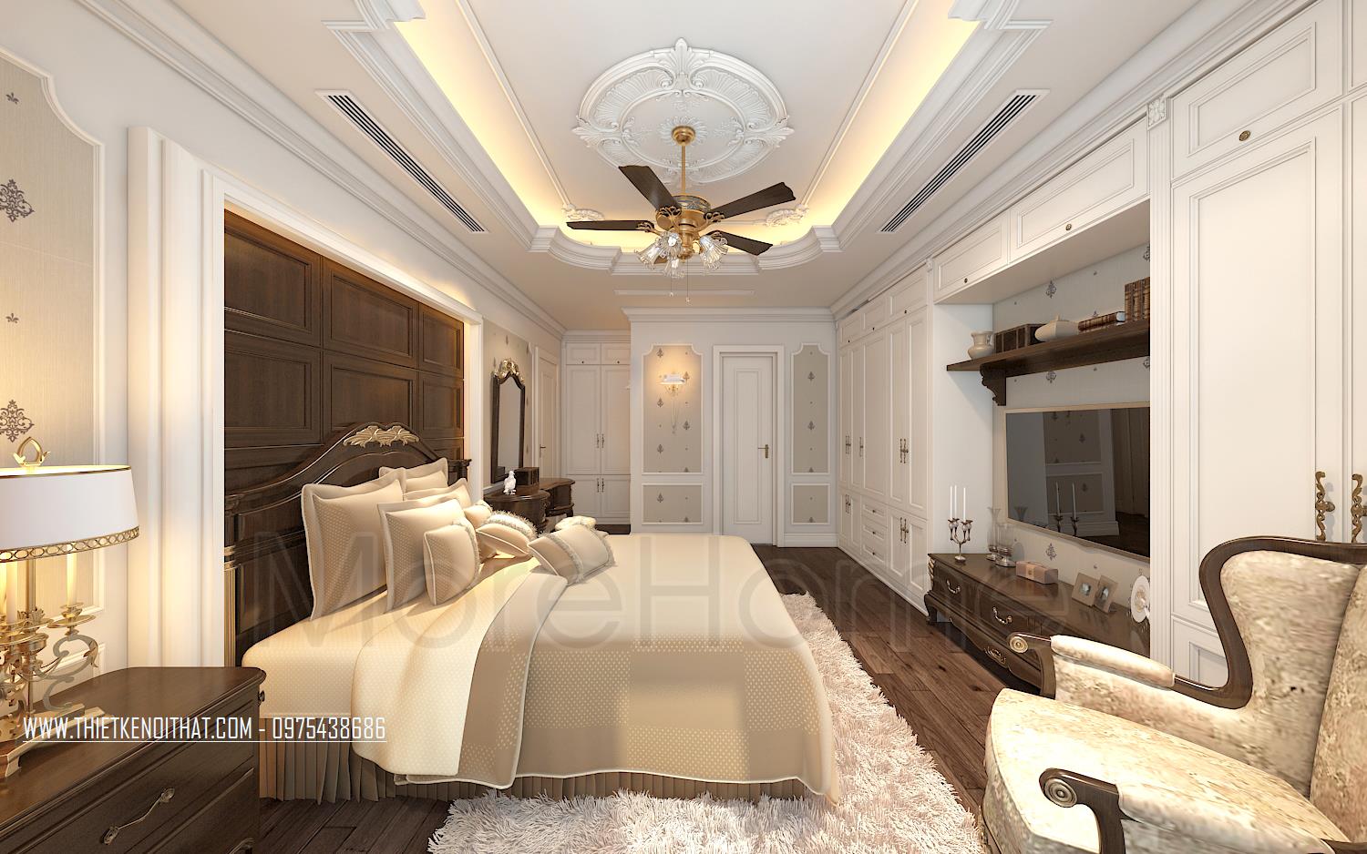 Sang đến thiết kế nội thất phòng ngủ chính của bố mẹ lại là sự kết nối của gam màu cổ điển giữa trắng và vàng gold tạo cảm giác vương giả đến từ các chi tiết rèm cửa, và giường mang phong cách quý tộc. Chiếc ghế tựa giải trí cùng kiểu thiết kế với ghế sofa phòng khách cũng giúp căn phòng mang dáng dấp quý tộc châu Âu lịch lãm xưa kia. Ngoài ra chiếc thảm lông trắng dưới giường cũng phần nào tôn thêm sự quý phái cho căn phòng.
