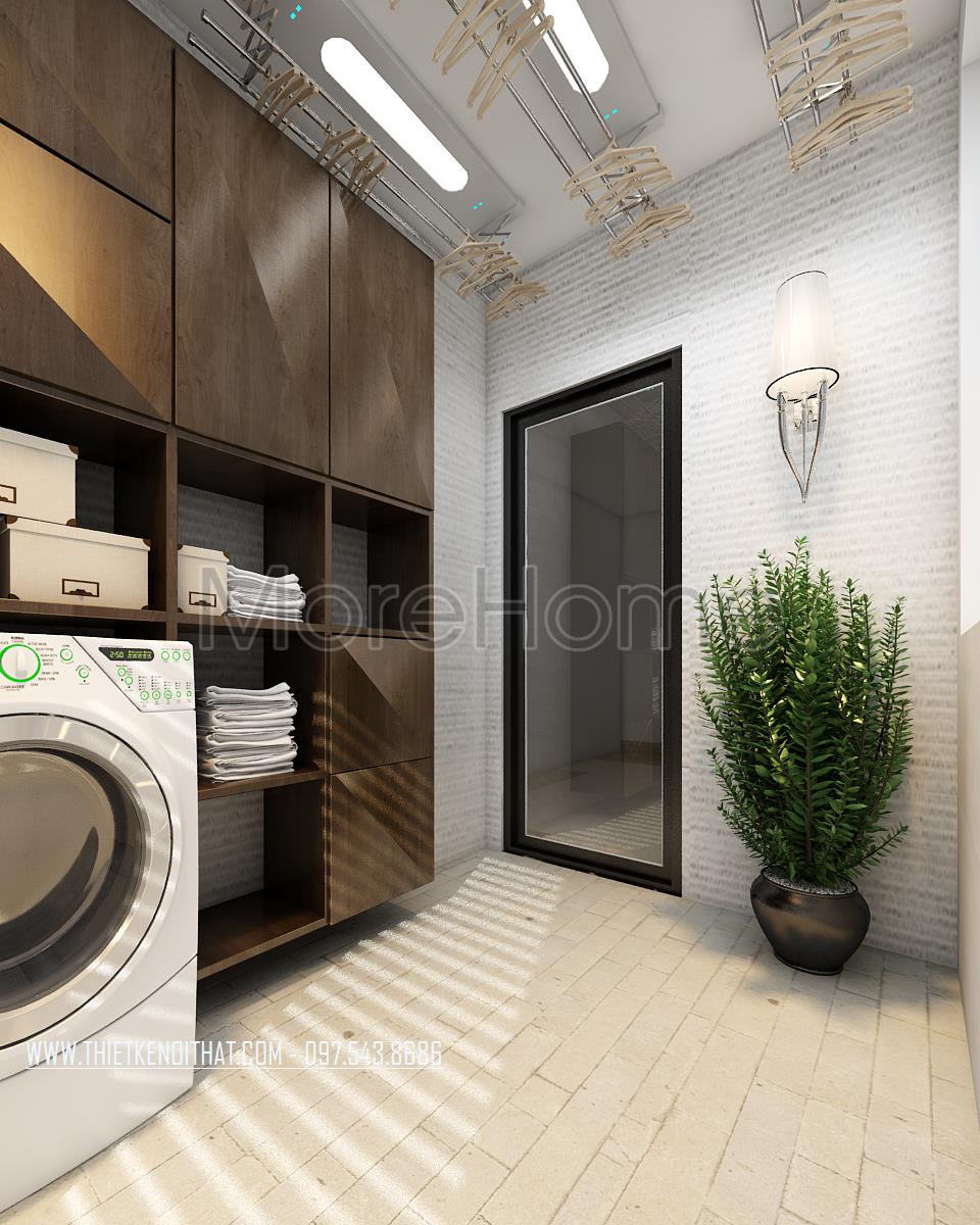 Một trong những góc khuất của hầu hết các căn nhà chính là khu ban công, với các căn hộ nhỏ, có khi ban công còn được tận dụng làm kho vì vậy rất mất thẩm mỹ. Tuy nhiên với thiết kế này, kiến trúc sư đã khéo léo thay áo cho khu vực này, biến nó thành một khu giặt giũ và phơi phóng tiện lợi. Tủ gỗ với các ngăn thoáng rộng được sắp đặt có chủ đích đảm bảo tính công năng và mang lại sự gọn gàng cho không gian sống.