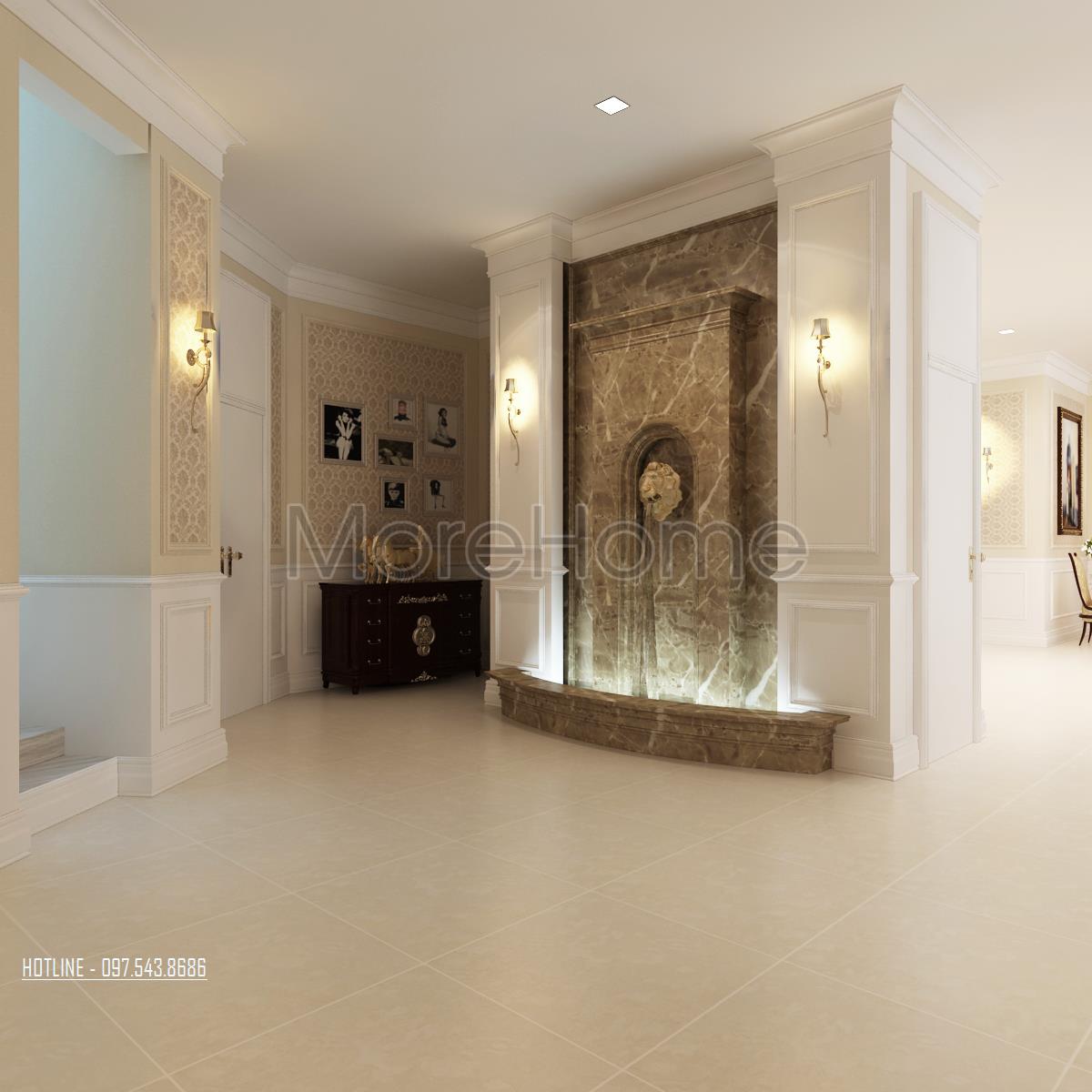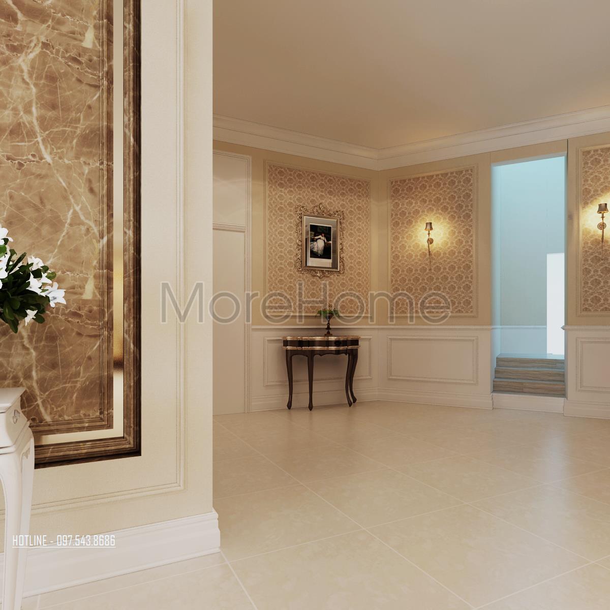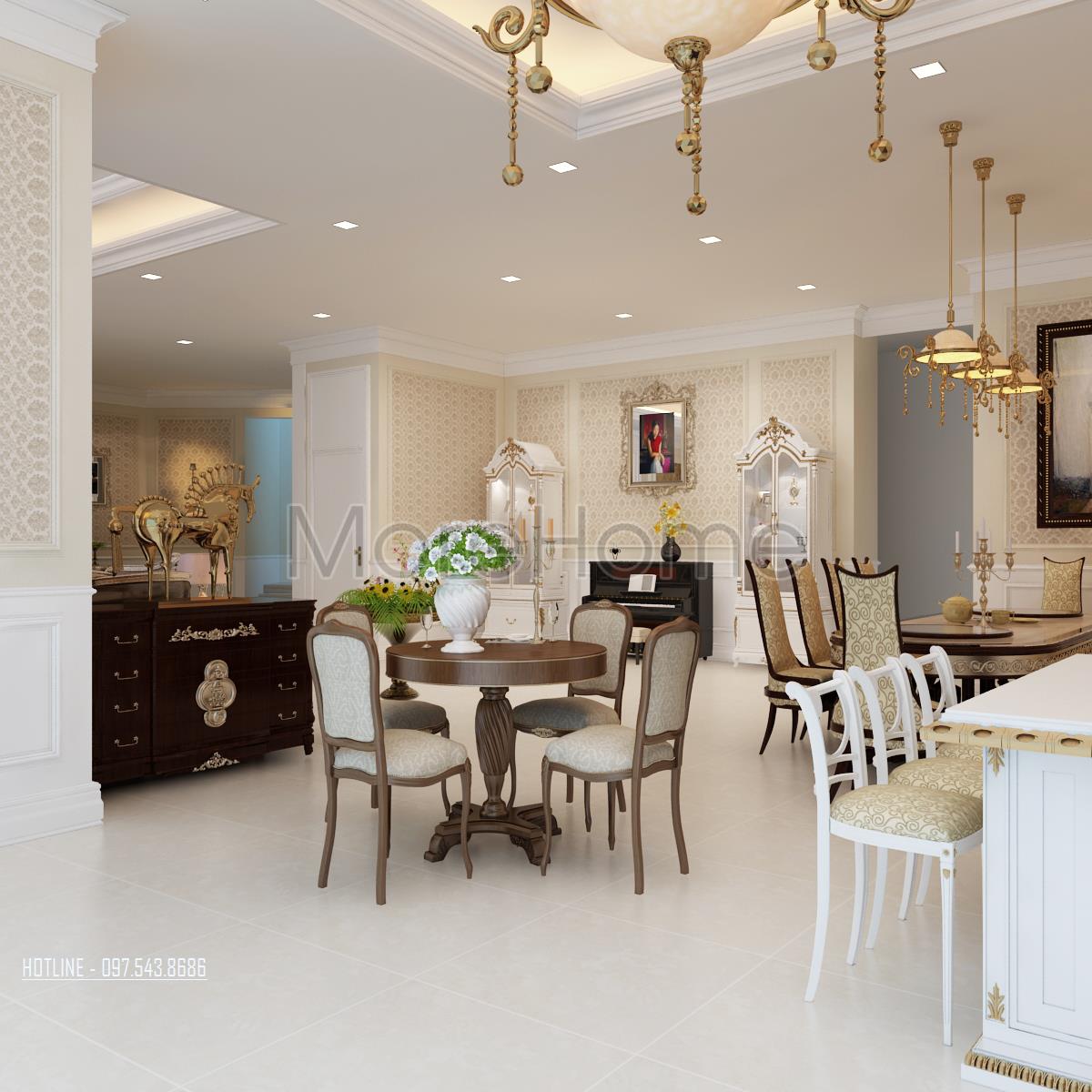 Diện tích khu sinh hoạt chung thiết kế chi tiết với một phòng khách, khu phòng ăn và bếp; ngoài ra là các diện tích đa năng. Thiết kế nội thất phòng khách tân cổ điển tạo ấn tượng với vẻ đẹp quý phái và sang trọng.