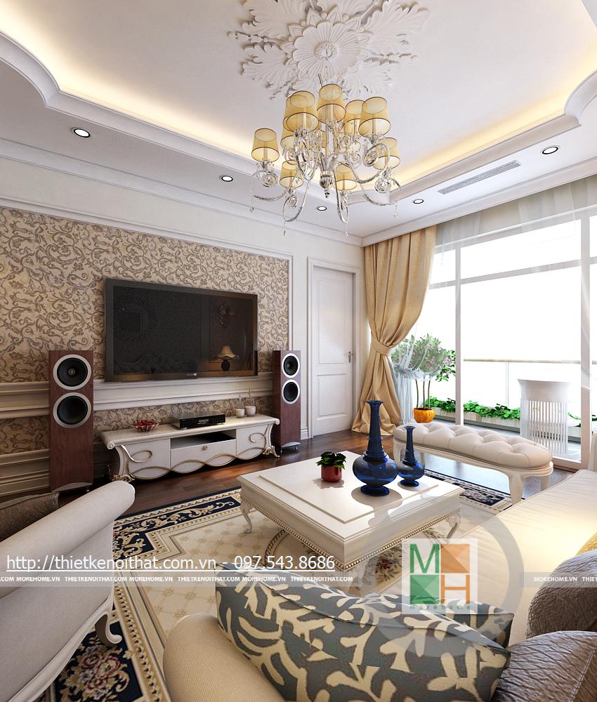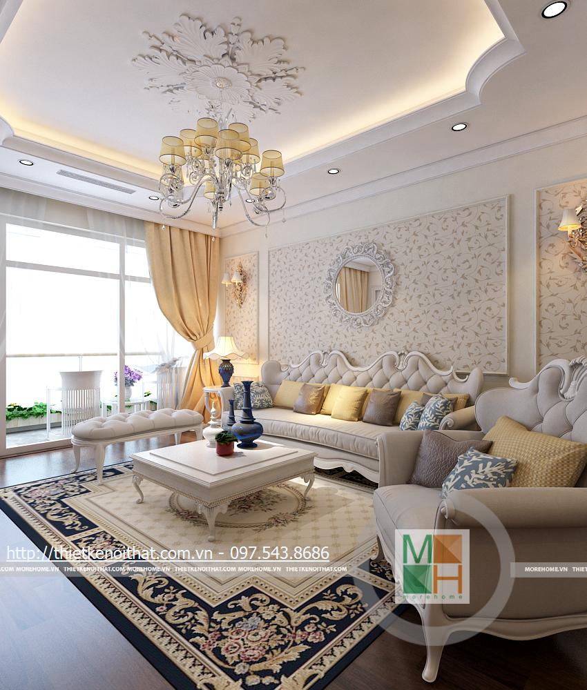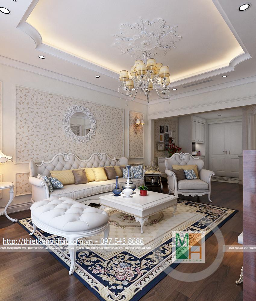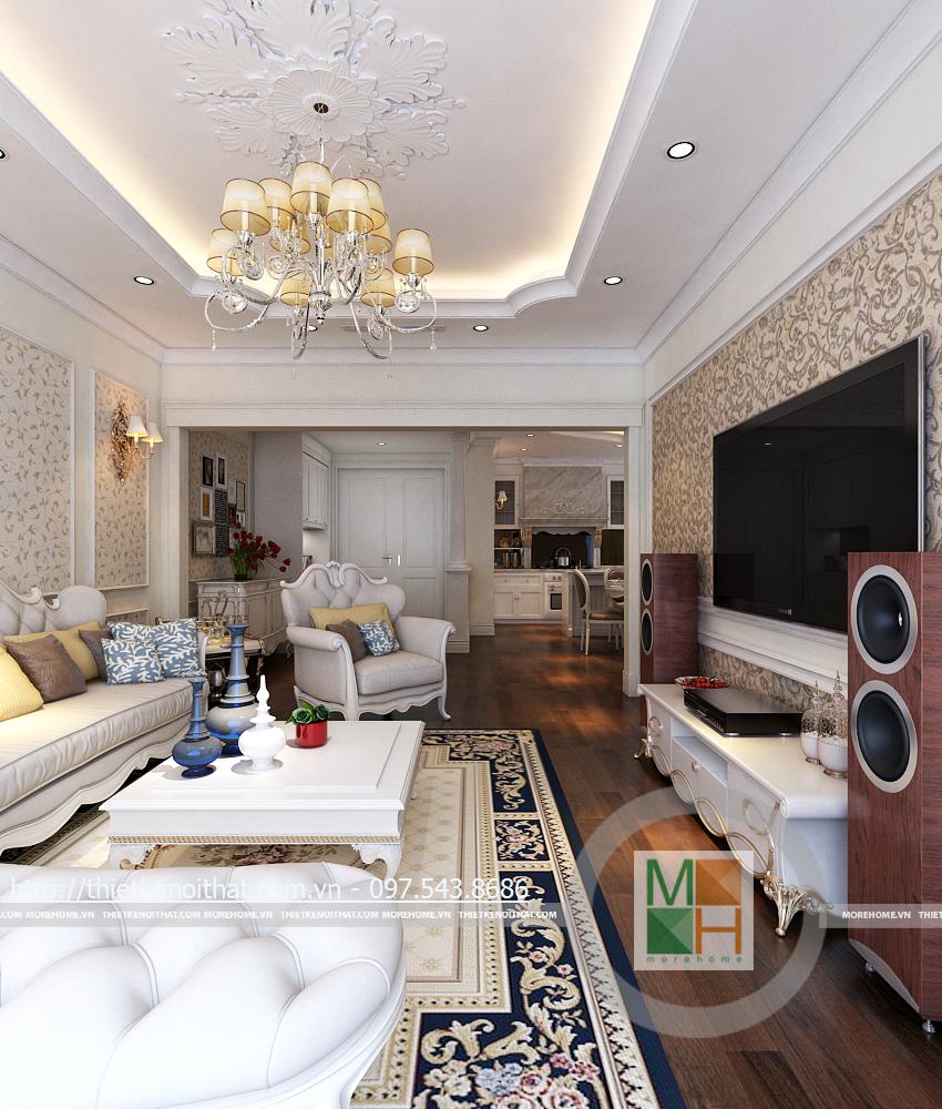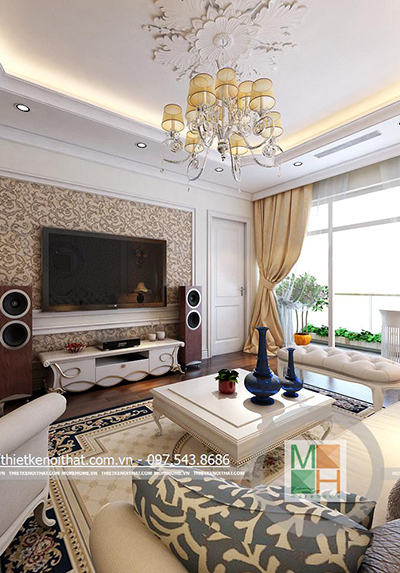 Phòng khách với nội thất tiện nghi và hiện đại. Nổi bật trong phòng là bộ sô pha lớn, màu sắc sang trọng, các đường nét mềm mại cùng hoa văn tinh tế là nét đặc trưng cho phong cách tân cổ điển. Đối diện với bộ sô pha là chiếc TV hai bên là hai chiếc loa lớn. Thảm trải trong phòng cũng mang đậm phong cách cổ điển nhờ họa tiết trang trí cùng màu sắc hài hòa. Toàn bộ sàn nhà được ốp gỗ tự nhiên. Hệ thống chiếu sáng trong phòng bao gồm đèn chùm, đèn mắt trâu và đèn âm trần tạo ánh sáng đầy màu sắc cho không gian phòng khách. Cửa sổ lớn hướng ra bên ngoài đem lại ánh sáng tự nhiên cho toàn bộ căn nhà. Logia phòng khách được trồng nhiều cây xanh, ngoài ra còn có một bộ bàn ghế nhỏ để gia chủ có thể nghỉ ngơi thư giãn mỗi buổi sáng.