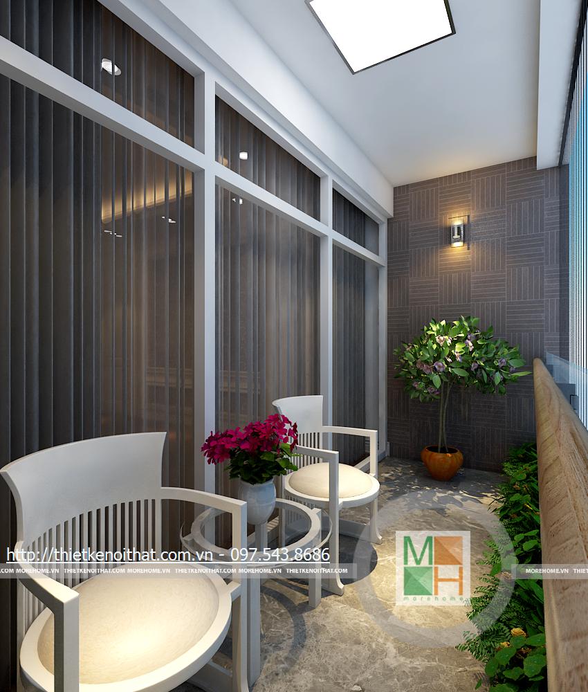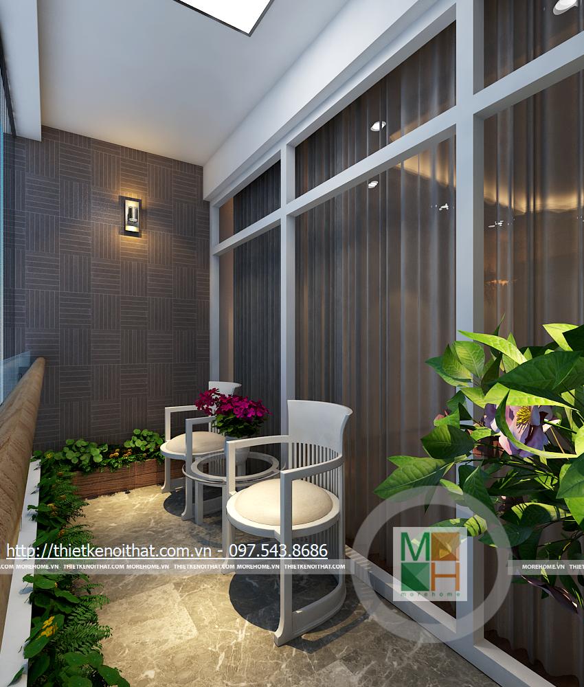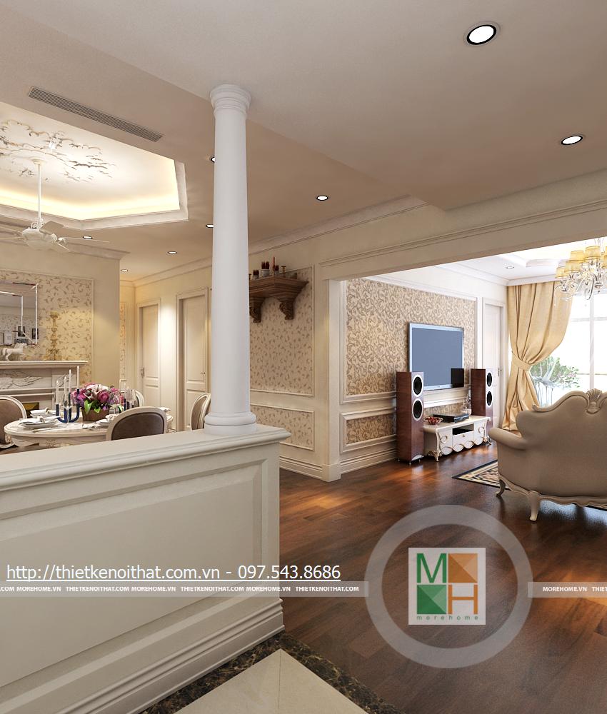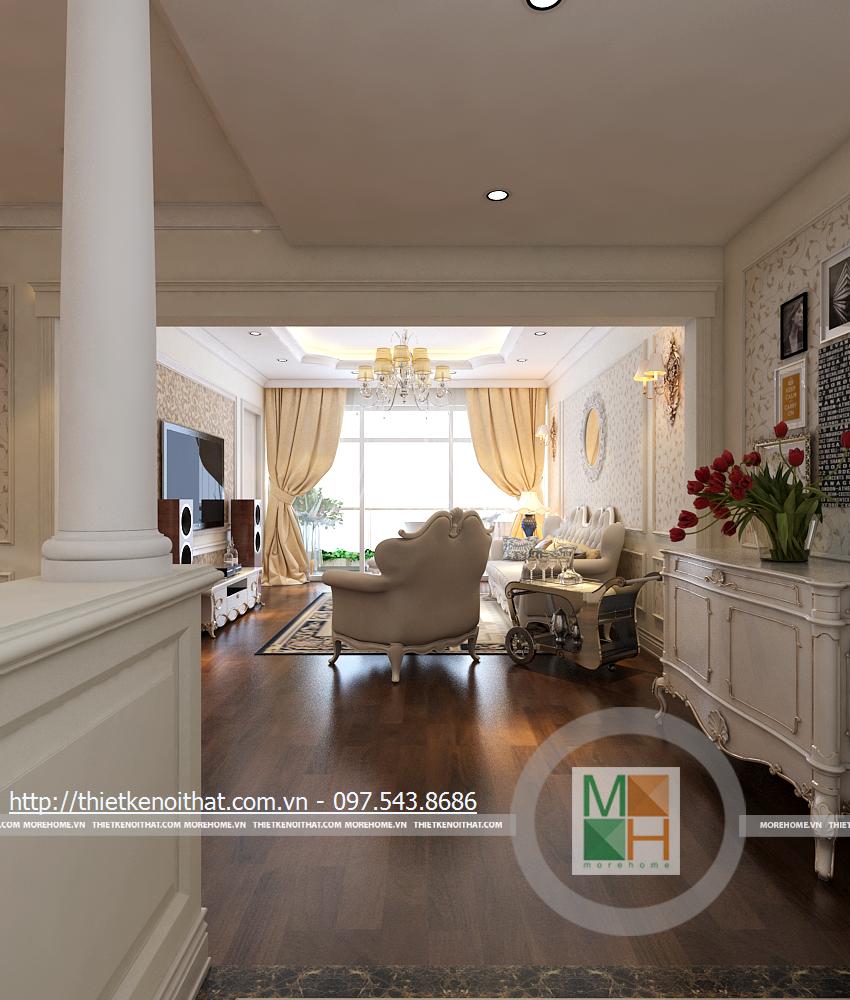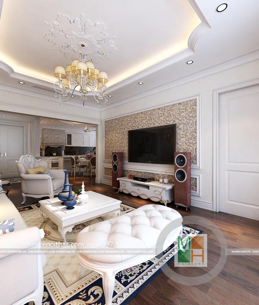 Phòng khách với nội thất tiện nghi và hiện đại. Nổi bật trong phòng là bộ sô pha lớn, màu sắc sang trọng, các đường nét mềm mại cùng hoa văn tinh tế là nét đặc trưng cho phong cách tân cổ điển. Đối diện với bộ sô pha là chiếc TV hai bên là hai chiếc loa lớn. Thảm trải trong phòng cũng mang đậm phong cách cổ điển nhờ họa tiết trang trí cùng màu sắc hài hòa. Toàn bộ sàn nhà được ốp gỗ tự nhiên. Hệ thống chiếu sáng trong phòng bao gồm đèn chùm, đèn mắt trâu và đèn âm trần tạo ánh sáng đầy màu sắc cho không gian phòng khách. Cửa sổ lớn hướng ra bên ngoài đem lại ánh sáng tự nhiên cho toàn bộ căn nhà. Logia phòng khách được trồng nhiều cây xanh, ngoài ra còn có một bộ bàn ghế nhỏ để gia chủ có thể nghỉ ngơi thư giãn mỗi buổi sáng.