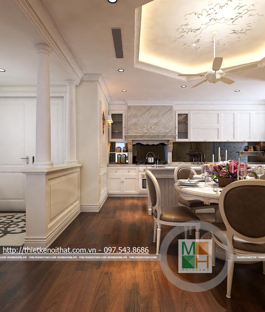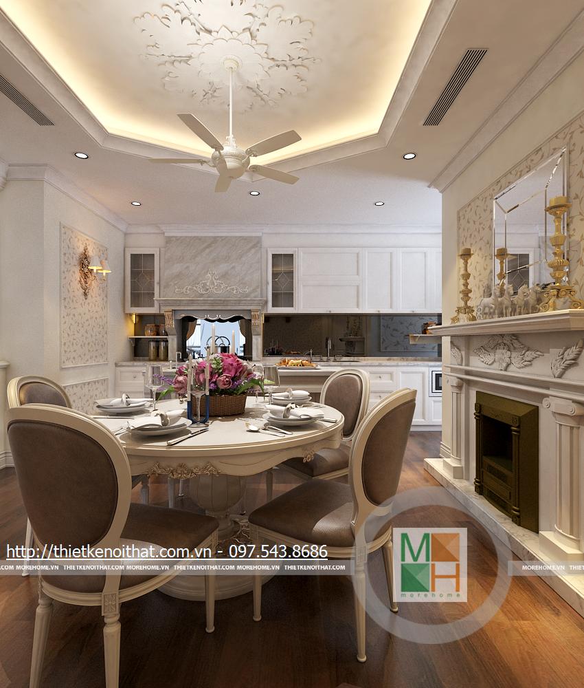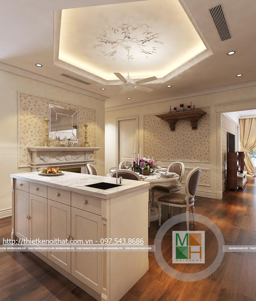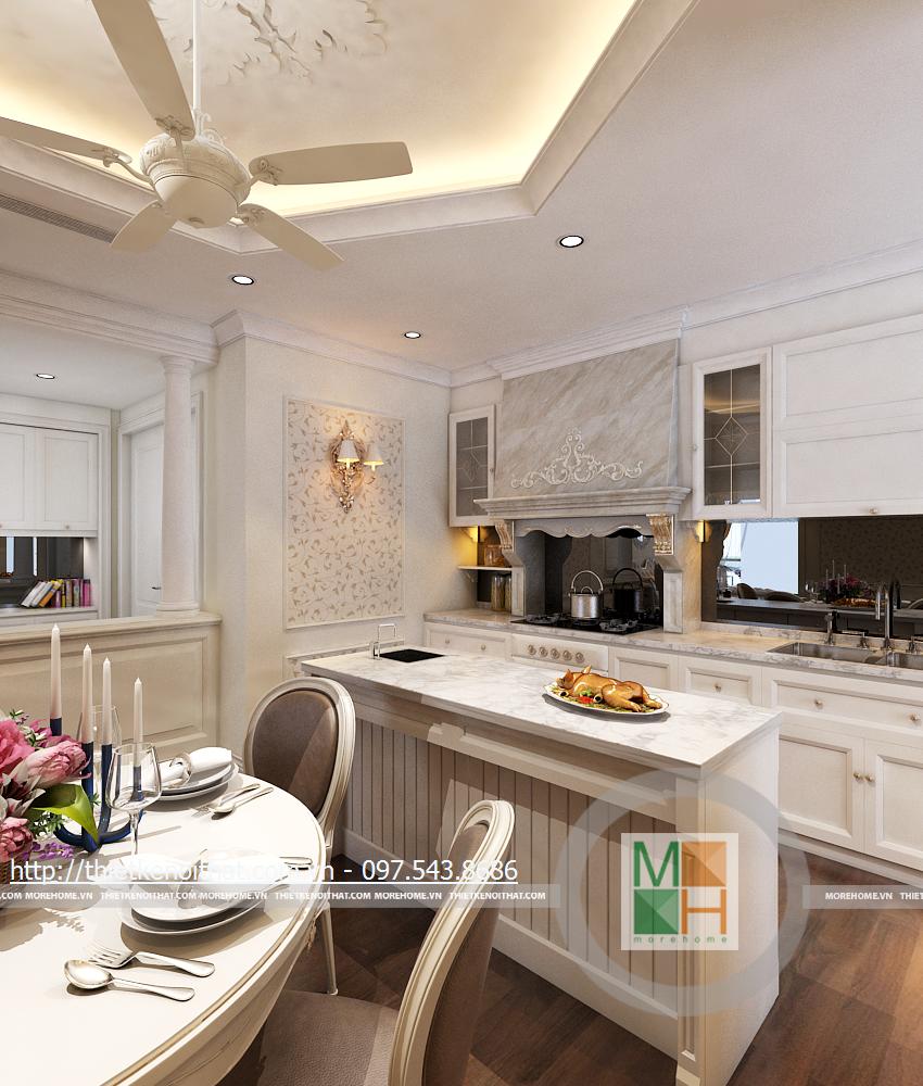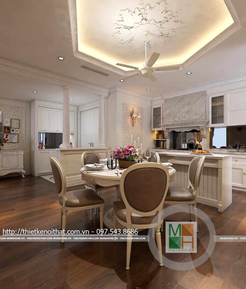 Không gian phòng ăn dường như ấm cúng và thân mật hơn nhờ cách bố trí bàn thờ đặt trong phòng. Bộ bàn ăn được thiết kế tối giản tiết kiệm diện tích căn phòng. Khu vực nấu ăn được trang bị các thiết bị hiện đại và tiện nghi. Mặt bàn nấu ăn được ốp đá cẩm thạch, bên dưới là hệ thống các ngăn tủ mọi kích cỡ để có thể chứa được nhiều đồ cần thiết. Vẻ sang trọng của căn phòng còn được tôn thêm bởi các phù điêu trang trí trên trần và tường nhà cùng hệ thống ánh sáng tạo màu sắc.