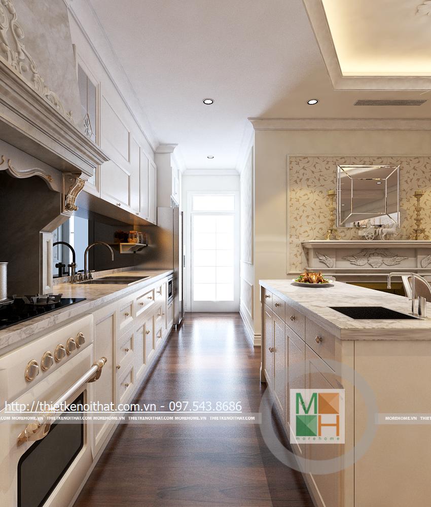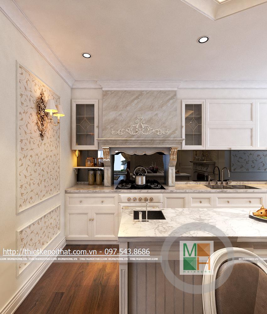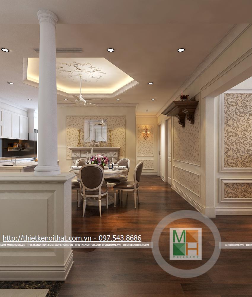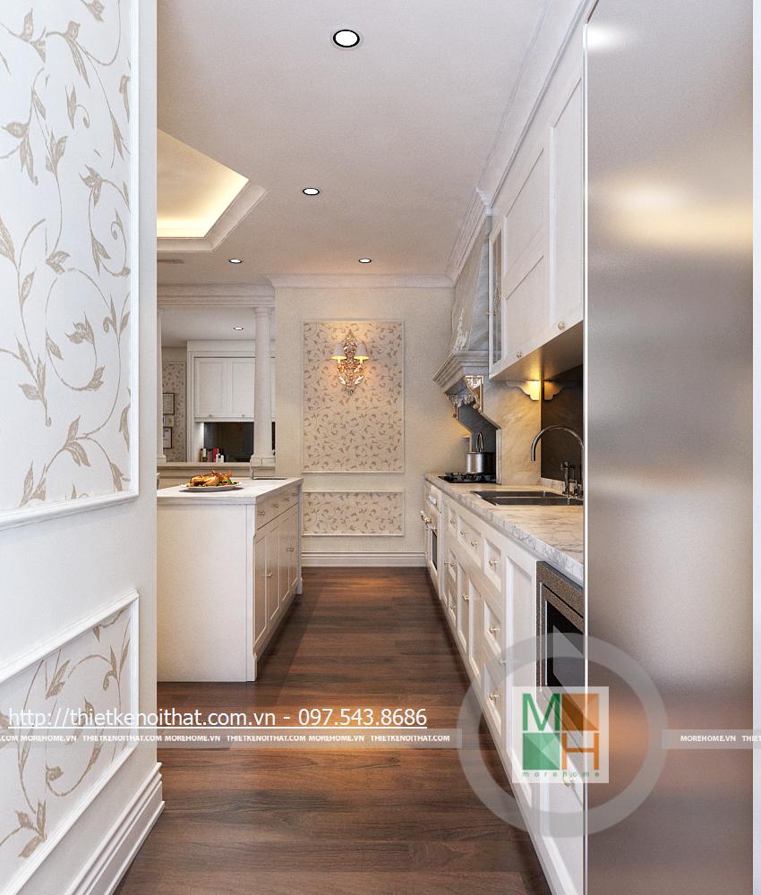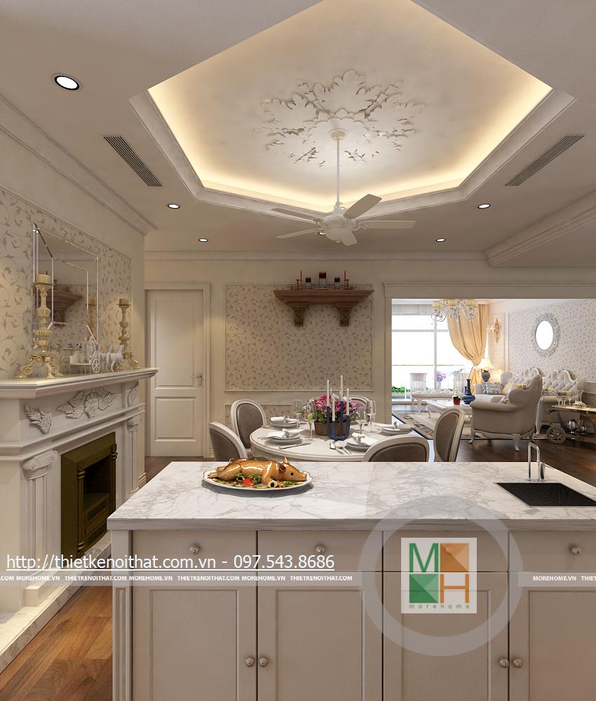 Không gian phòng ăn dường như ấm cúng và thân mật hơn nhờ cách bố trí bàn thờ đặt trong phòng. Bộ bàn ăn được thiết kế tối giản tiết kiệm diện tích căn phòng. Khu vực nấu ăn được trang bị các thiết bị hiện đại và tiện nghi. Mặt bàn nấu ăn được ốp đá cẩm thạch, bên dưới là hệ thống các ngăn tủ mọi kích cỡ để có thể chứa được nhiều đồ cần thiết. Vẻ sang trọng của căn phòng còn được tôn thêm bởi các phù điêu trang trí trên trần và tường nhà cùng hệ thống ánh sáng tạo màu sắc.