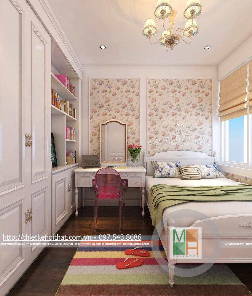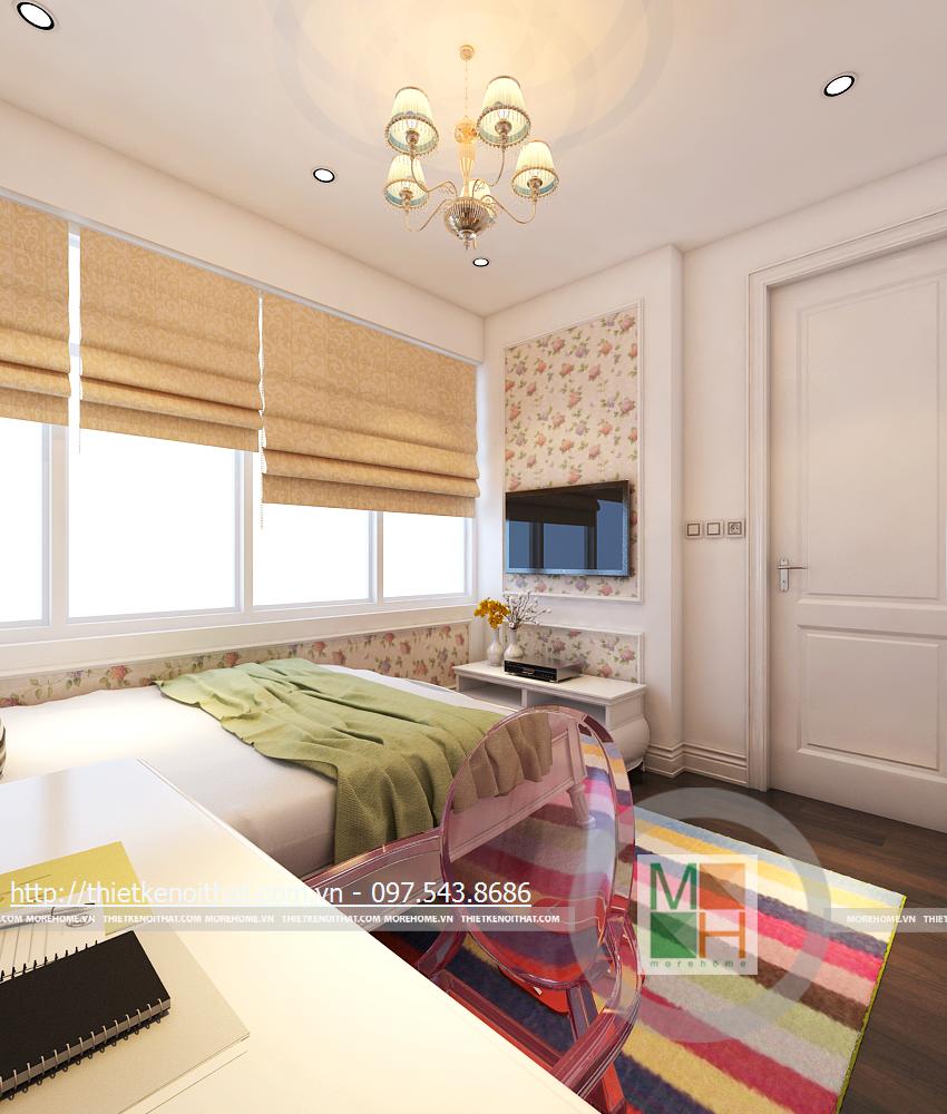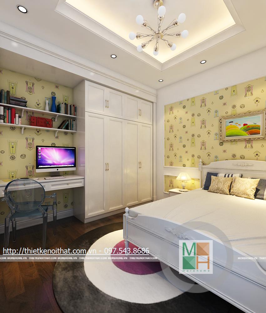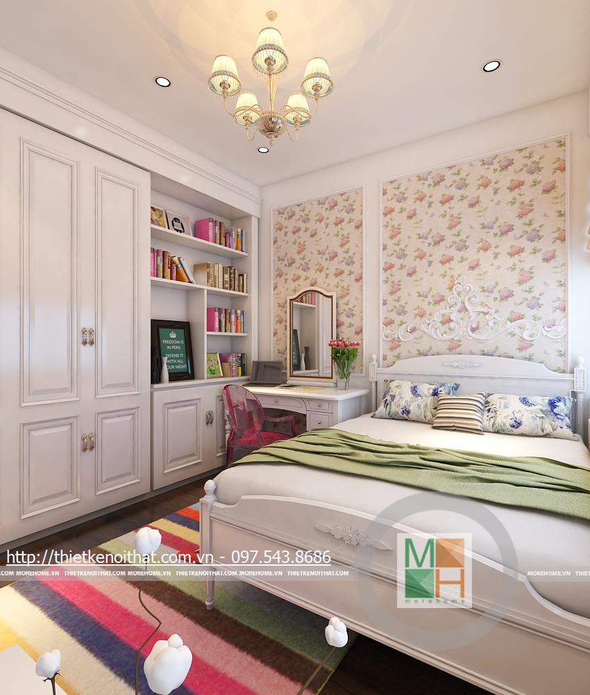Phòng ngủ con gái được thiết kế đầy nữ tính và trẻ trung. Màu sắc trong phòng hài hòa và đa dạng. Bên cạnh giường ngủ là cửa sổ lớn tạo không khí thoáng đãng và ánh sáng tự nhiên cho phòng. Hệ thống chiếu sáng cho phòng là đèn chùm cùng đèn mắt trâu. Tủ đồ cùng kệ sách được kê ốp sát tường tiết kiệm diện tích trong phòng.