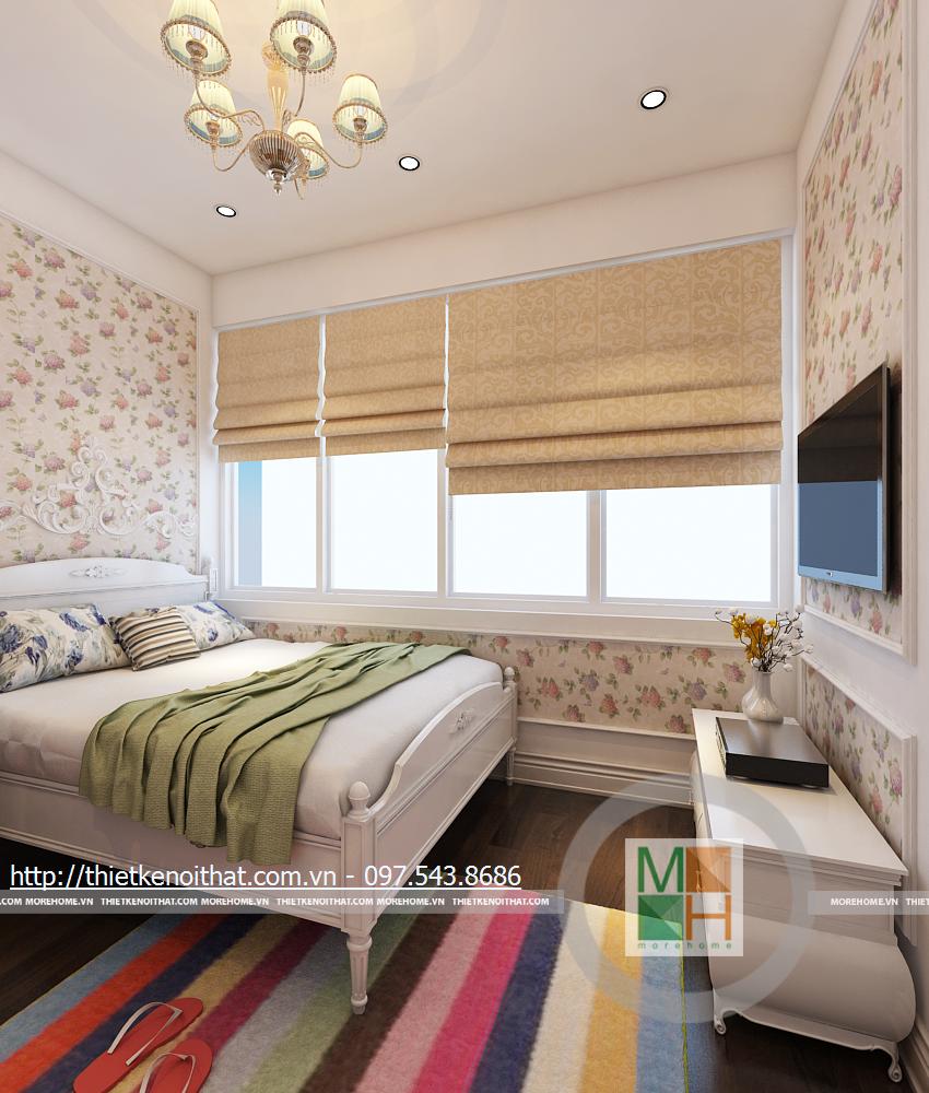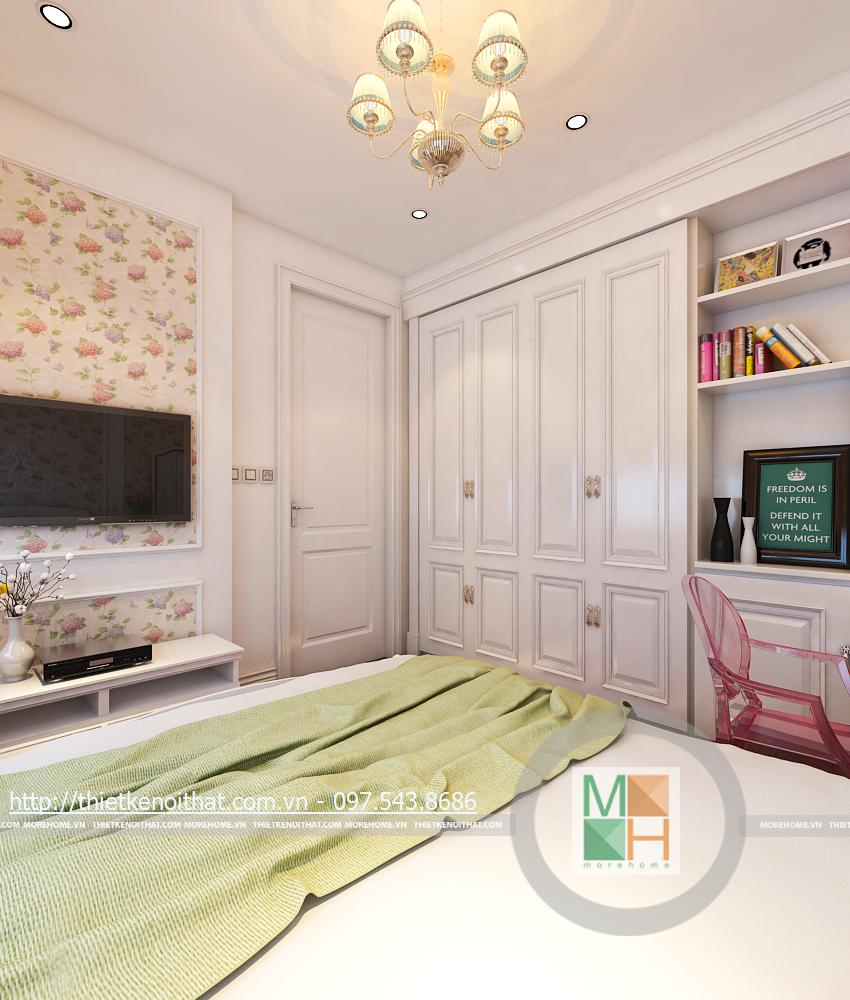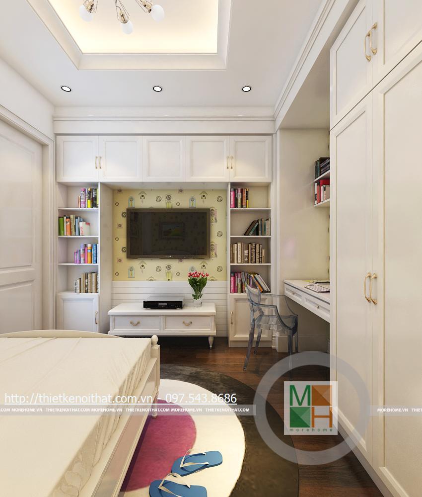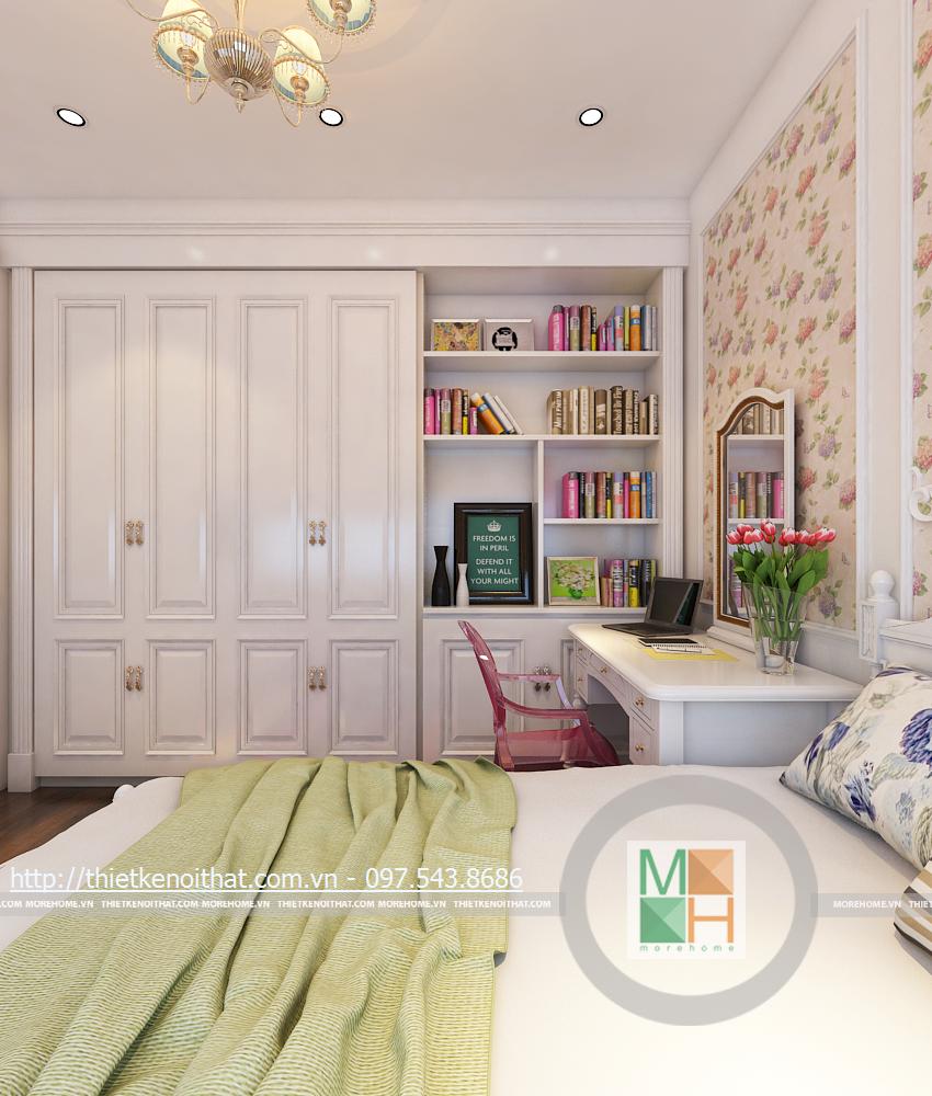 Phòng ngủ con gái được thiết kế đầy nữ tính và trẻ trung. Màu sắc trong phòng hài hòa và đa dạng. Bên cạnh giường ngủ là cửa sổ lớn tạo không khí thoáng đãng và ánh sáng tự nhiên cho phòng. Hệ thống chiếu sáng cho phòng là đèn chùm cùng đèn mắt trâu. Tủ đồ cùng kệ sách được kê ốp sát tường tiết kiệm diện tích trong phòng.