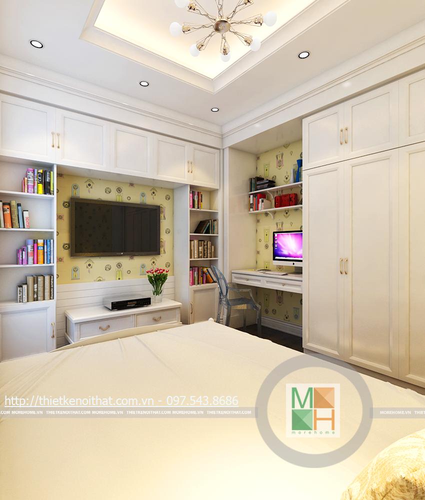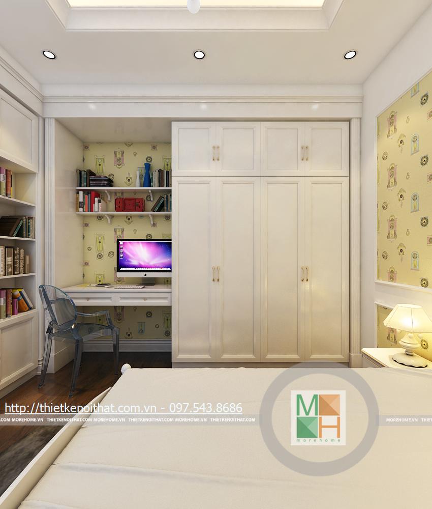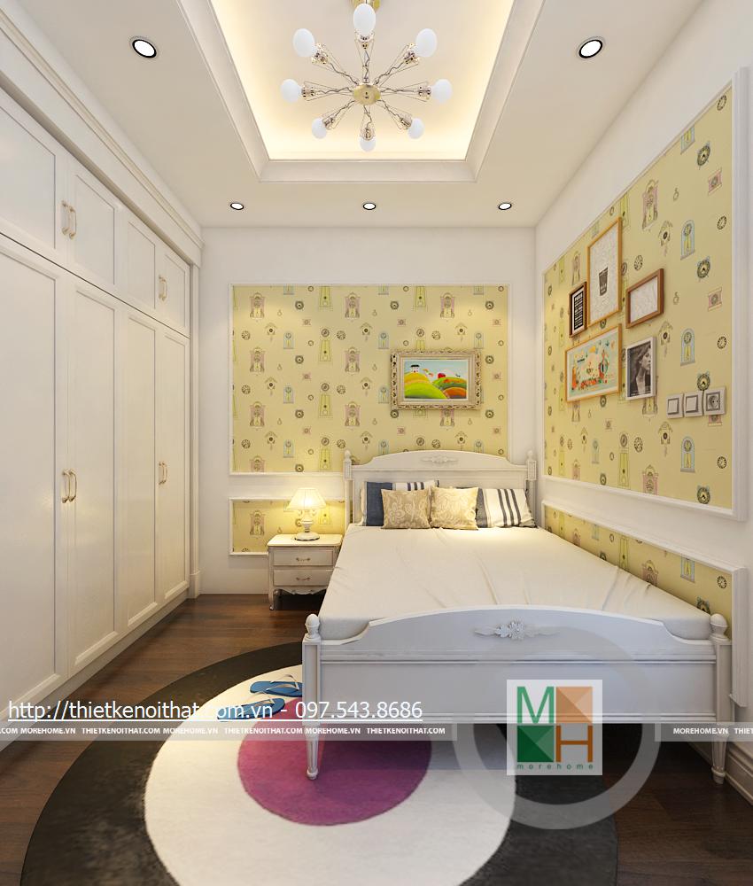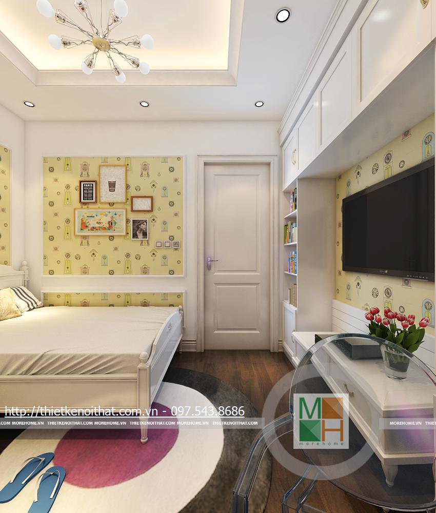Phòng ngủ con trai với thiết kế mạnh mẽ đơn giản. Màu sắc chủ đạo trong phòng là màu trắng, điểm vào đó là màu vàng của giấy gián tường với những họa tiết trang trí tinh nghịch. Kẹ sách và TV được đặt đối diện với giường ngủ. Phía bên trái giường ngủ là tủ đồ và bàn học. Các chi tiết trang trí cùng nội thất đều được thiết kế tối giản và sắp xếp phù hợp với diện tích không gian phòng.