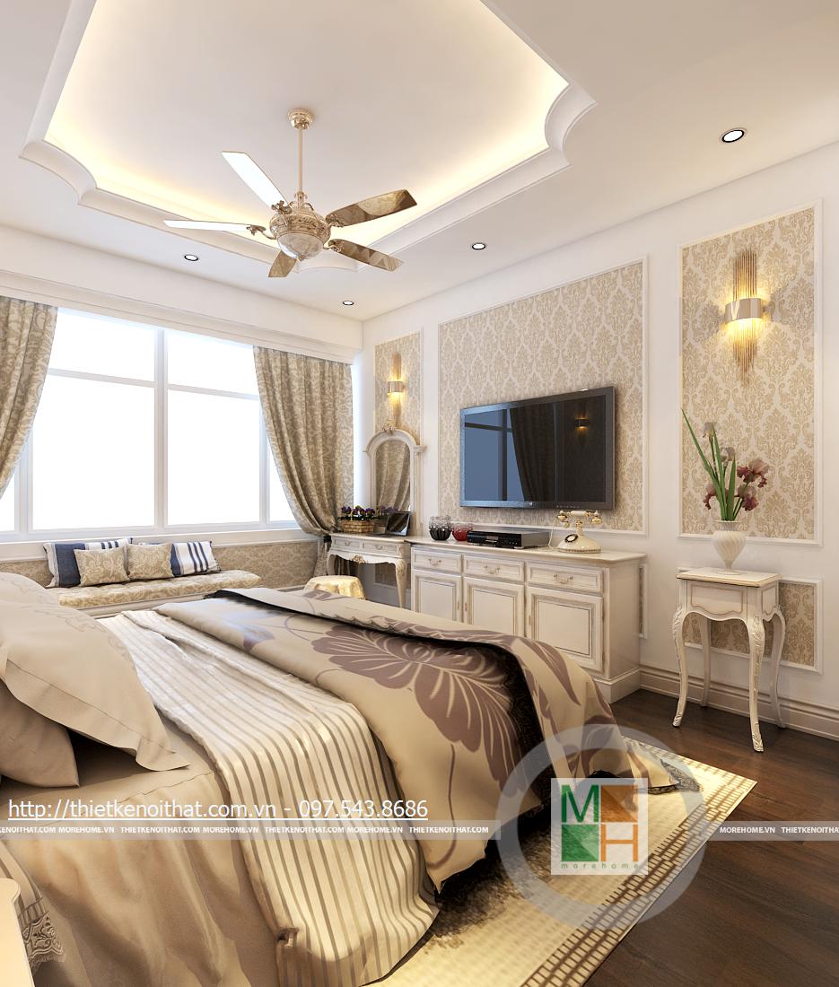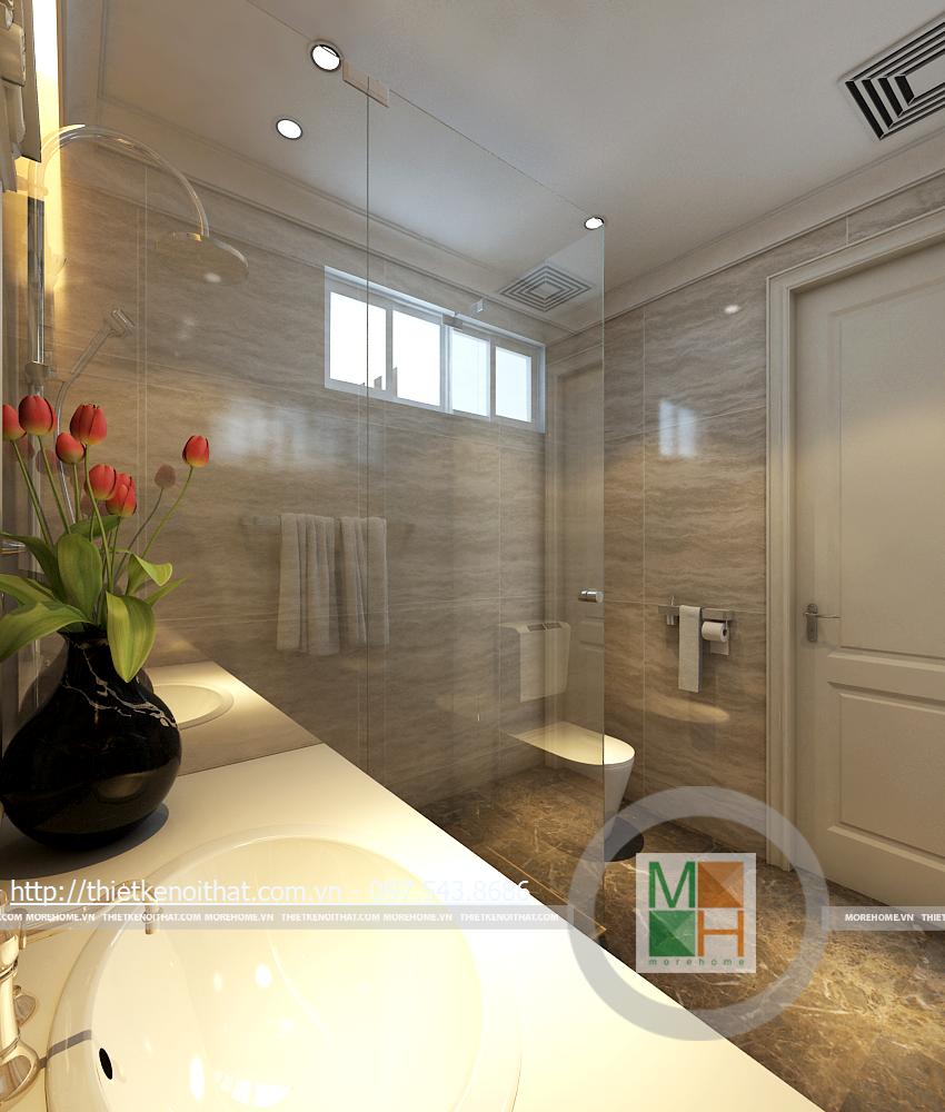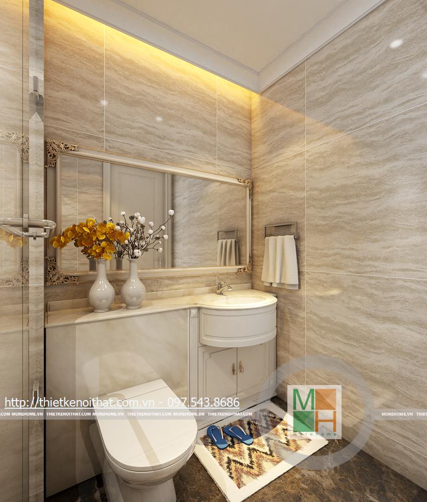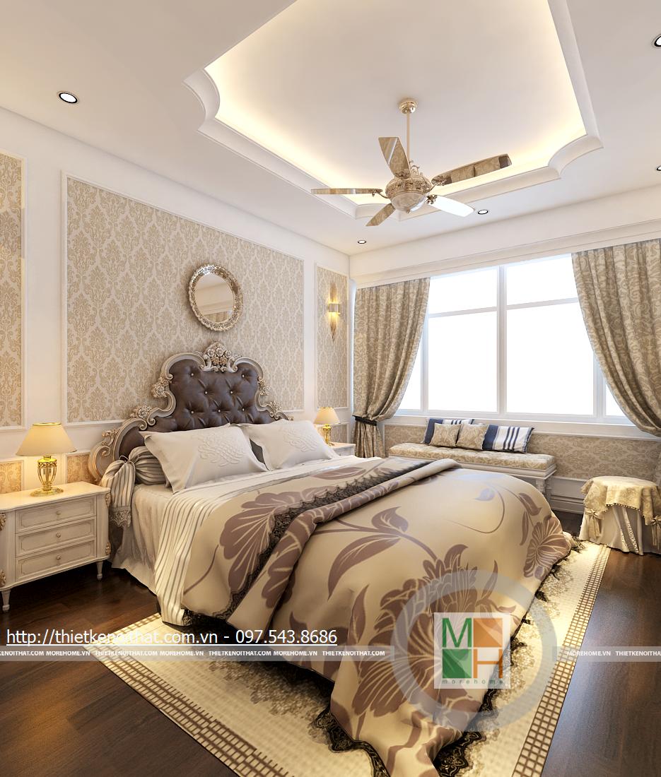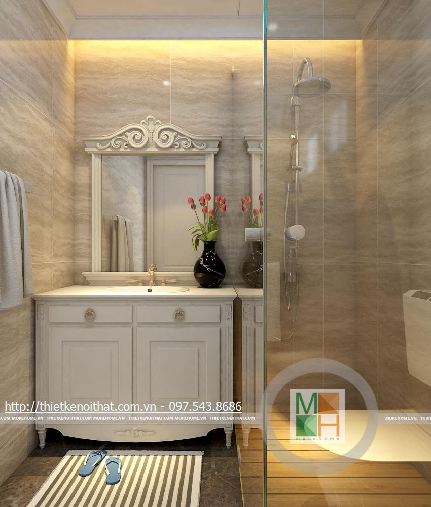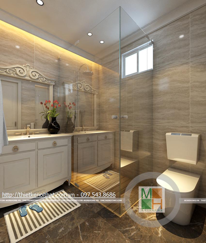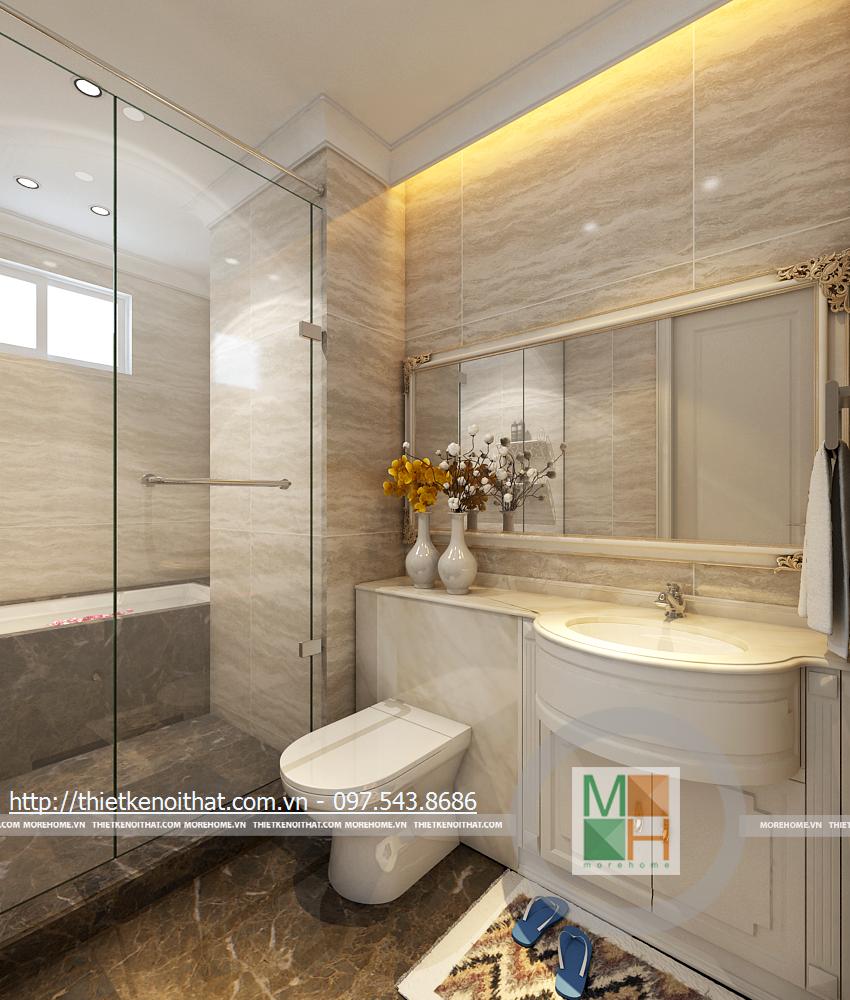Phòng ngủ master mang đậm phong cách Tây Âu. Phong cách này thể hiện ở các đường nét mềm mại trên nội thất cùng các họa tiết trang trí cổ điển. Bên cạnh giường ngủ được đặt một chiếc ghế băng nhỏ để gia chủ có thể thư giãn, đọc sách báo hoặc uống cà phê vào mỗi buổi sáng. Hệ thống cửa sổ lớn mang không khí thiên nhiên cho toàn bộ căn phòng. TV và bàn trang điểm được đặt đối diện với giường ngủ. Nét sang trọng của căn phòng còn được thể hiện ở màu vàng sâm panh của giấy gián tường cùng cách sắp xếp và bố trí nội thất. WC master với nội thất đầy đủ và tiện nghi, không gian bên trong thoải mái và sạch sẽ. Toàn bộ tường trong phòng được ốp đá tự nhiên. Bồn tắm lớn ngăn cách với bên ngoài bằng một lớp kính dày. Bên ngoài được đặt một tủ nhỏ kiêm kệ để gia chủ có thể để đồ dùng tiện lợi.