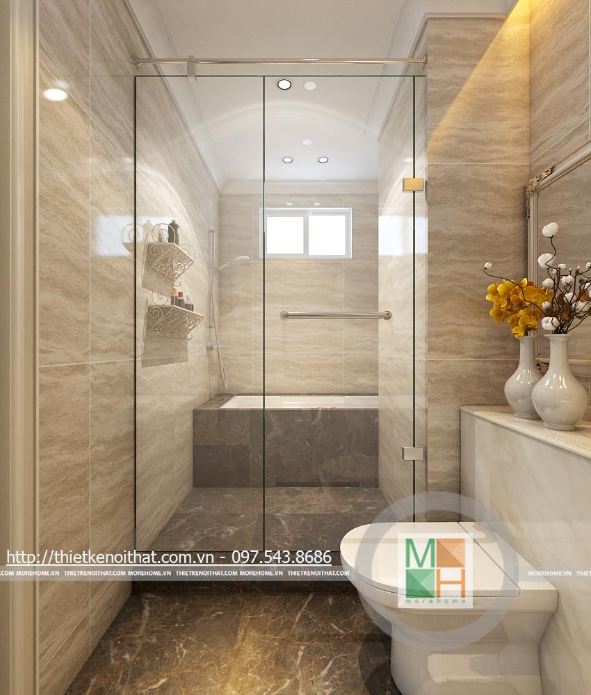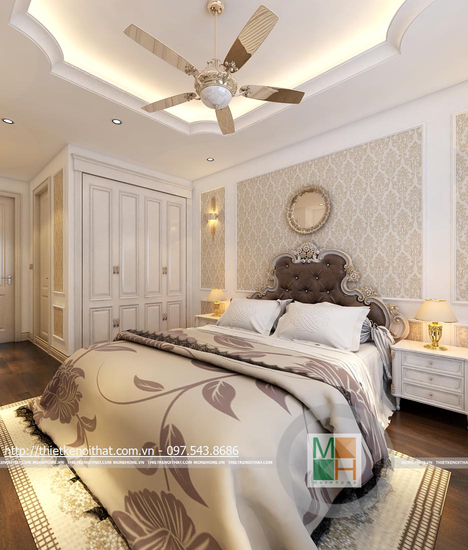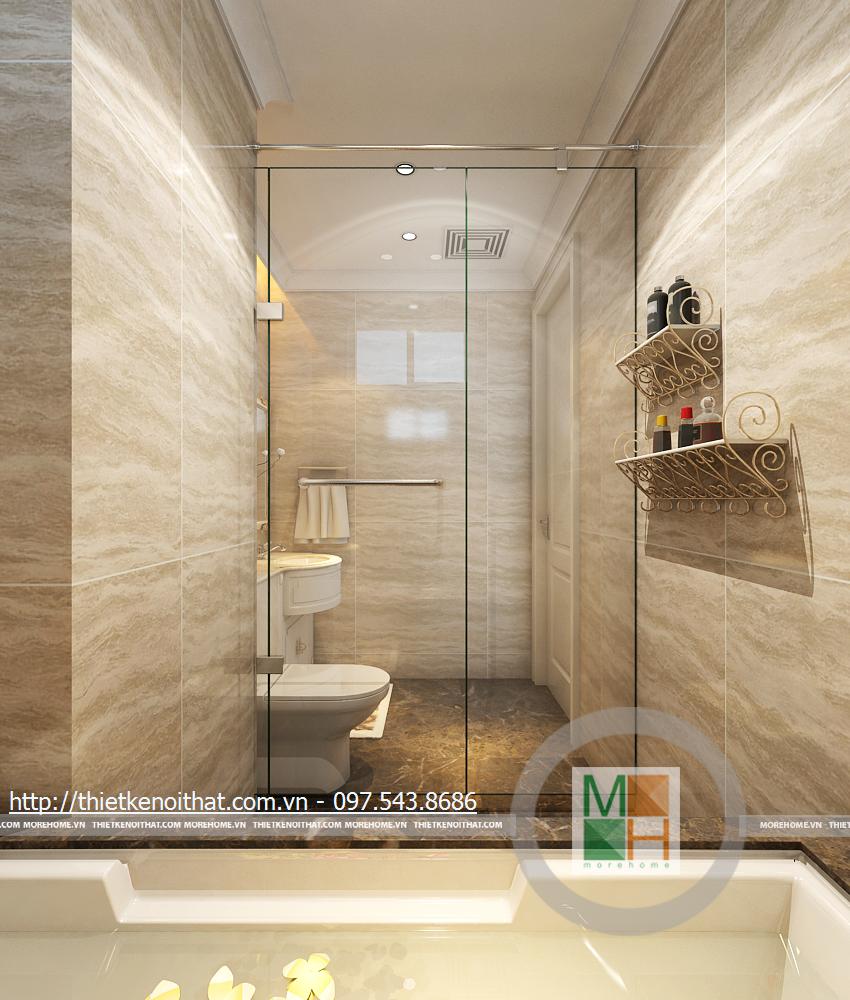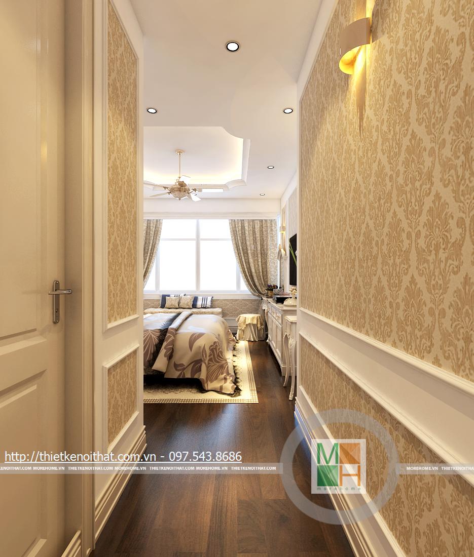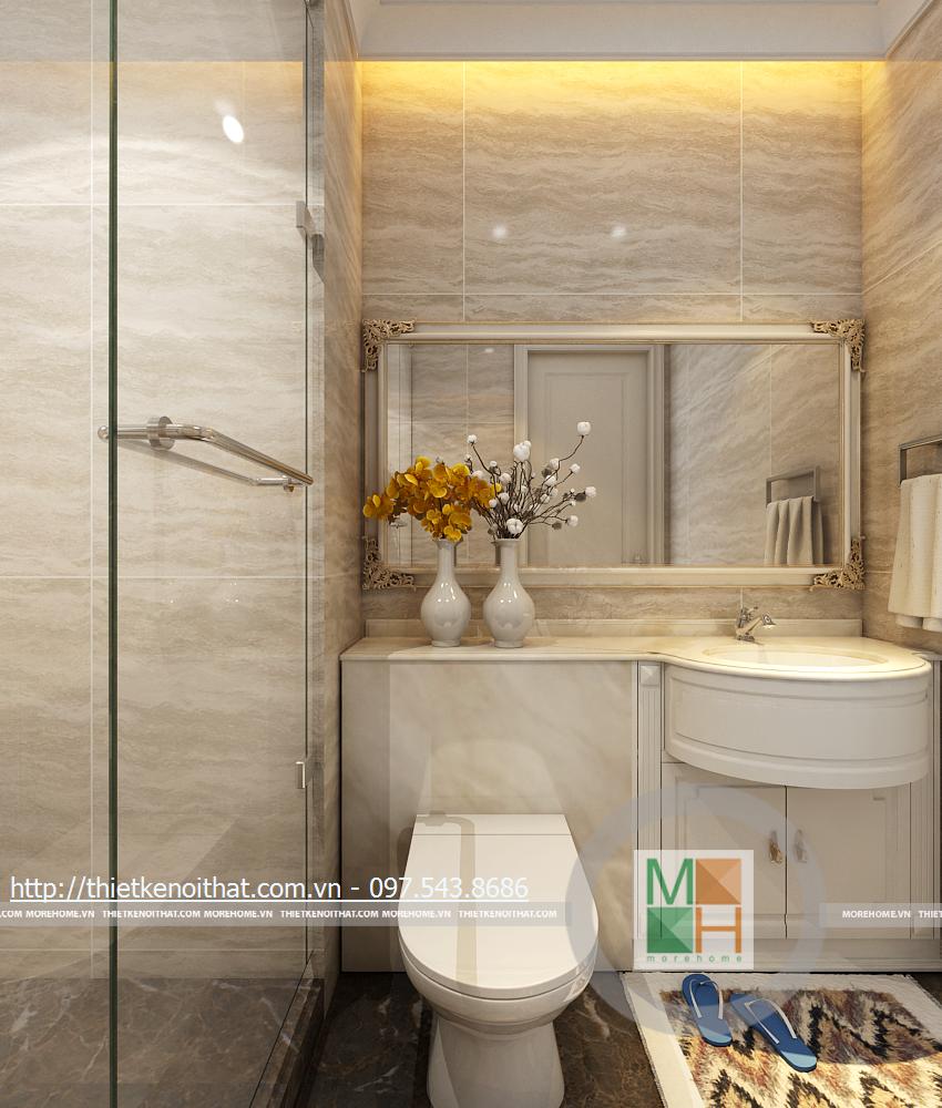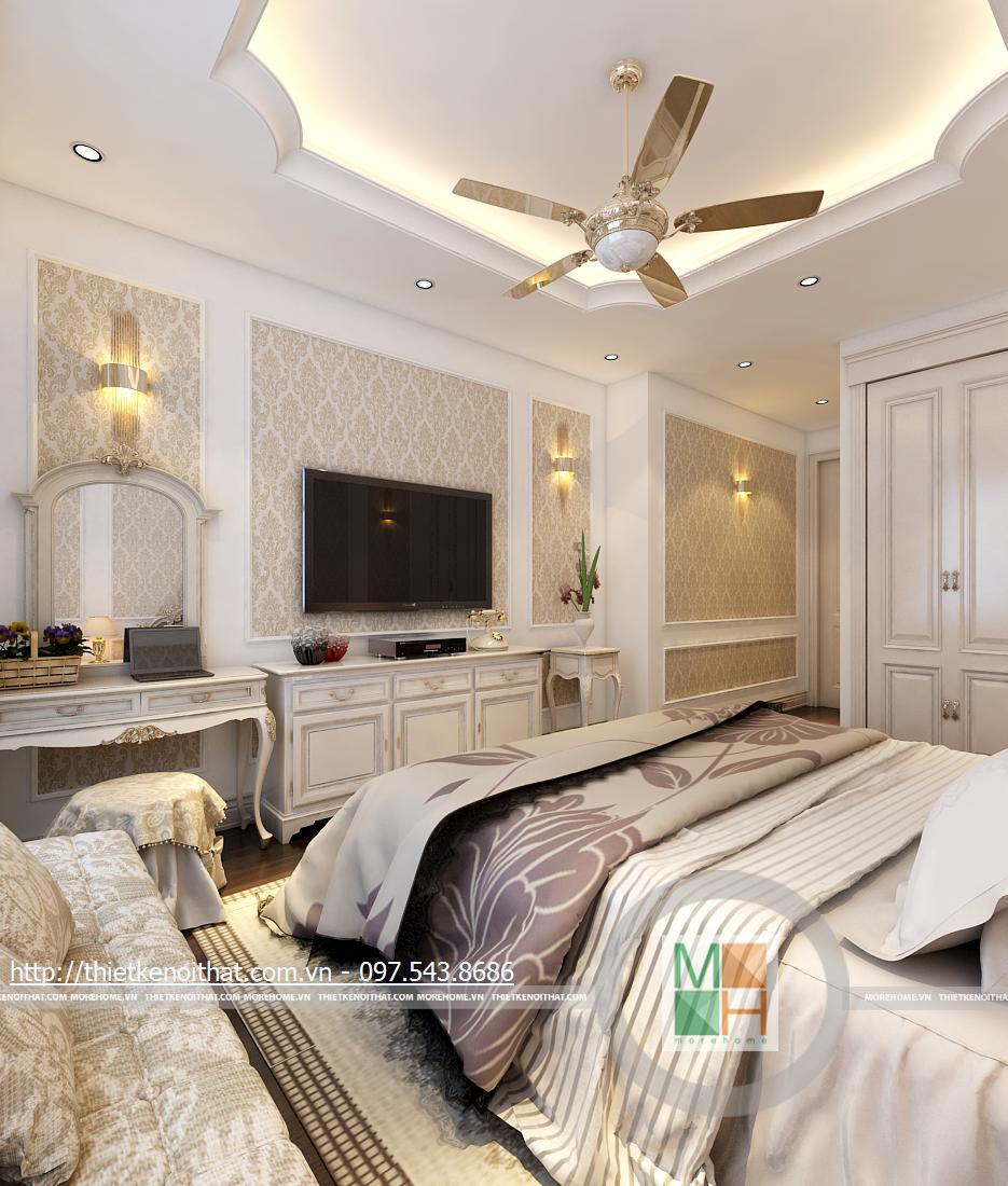 Phòng ngủ master mang đậm phong cách Tây Âu. Phong cách này thể hiện ở các đường nét mềm mại trên nội thất cùng các họa tiết trang trí cổ điển. Bên cạnh giường ngủ được đặt một chiếc ghế băng nhỏ để gia chủ có thể thư giãn, đọc sách báo hoặc uống cà phê vào mỗi buổi sáng. Hệ thống cửa sổ lớn mang không khí thiên nhiên cho toàn bộ căn phòng. TV và bàn trang điểm được đặt đối diện với giường ngủ. Nét sang trọng của căn phòng còn được thể hiện ở màu vàng sâm panh của giấy gián tường cùng cách sắp xếp và bố trí nội thất. WC master với nội thất đầy đủ và tiện nghi, không gian bên trong thoải mái và sạch sẽ. Toàn bộ tường trong phòng được ốp đá tự nhiên. Bồn tắm lớn ngăn cách với bên ngoài bằng một lớp kính dày. Bên ngoài được đặt một tủ nhỏ kiêm kệ để gia chủ có thể để đồ dùng tiện lợi.