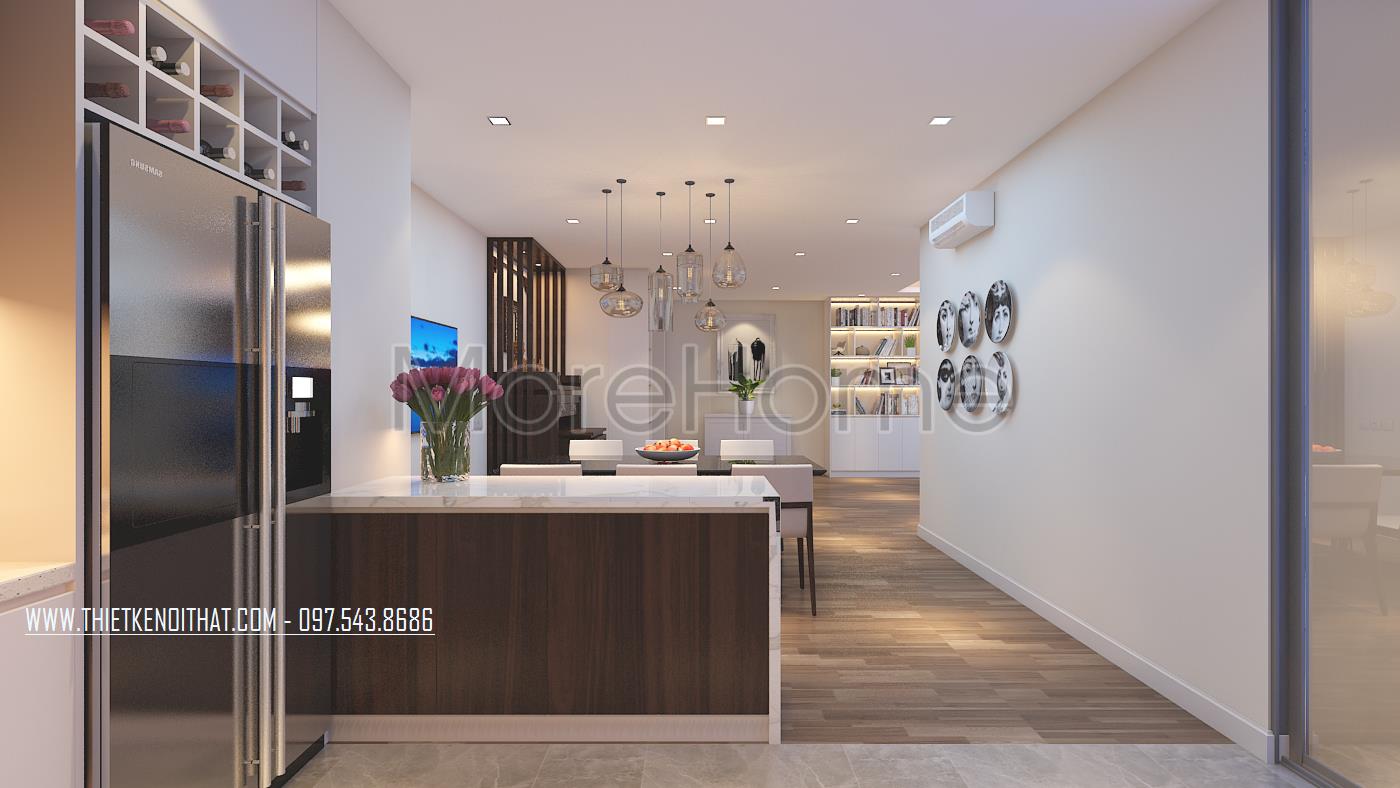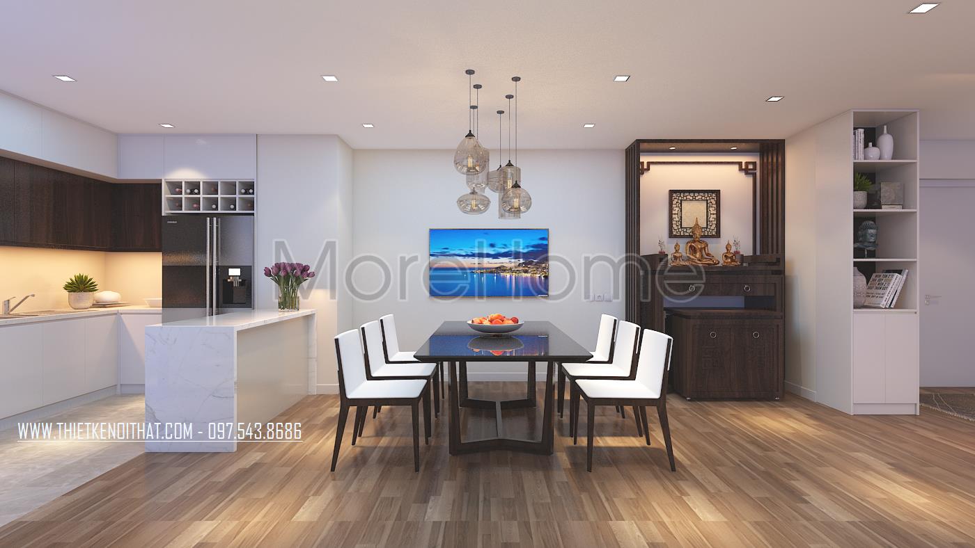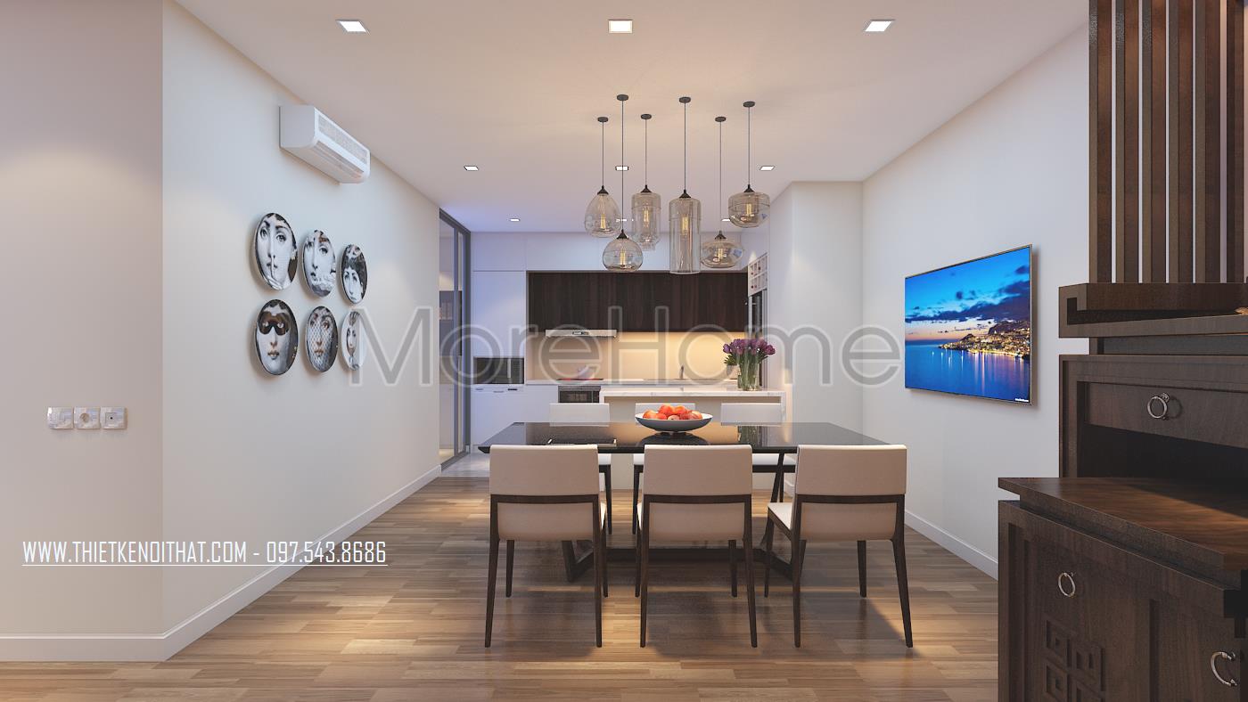Thiết kế nội thất khu bàn ăn không quá đi sâu vào chi tiết mà quan tâm hơn đến tính công năng và sự tiện nghi cho gia đình. Bàn ăn nhỏ được đặt giữa bàn tạo sự linh hoạt cho các hoạt động của các thành viên trong gia đình. Thiết kế mặt bàn ăn sử dụng chất liệu kính cường lực dễ dàng trong việc lau chùi và vệ sinh. Để tránh sự đơn điệu trong thiết kế, kiến trúc sư đã khéo léo đặt một vài vật dụng trang trí với các tone màu lạ mắt mang lại ấn tượng và sự hài hòa trong thiết kế.