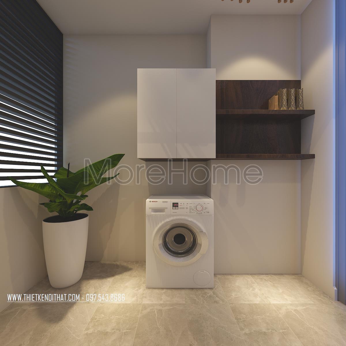 Không gian giặt giũ và phơi đồ được thiết kế riêng biệt. Các thiết kế thanh gỗ ngang đơn giản được tận dụng làm tủ đồ giúp tăng tính tiện nghi cho không gian. Thiết kế xanh điểm xuyết mang lại sự cân bằng về màu sắc và tạo hiệu ứng cảm xúc tích cực cho gia chủ.