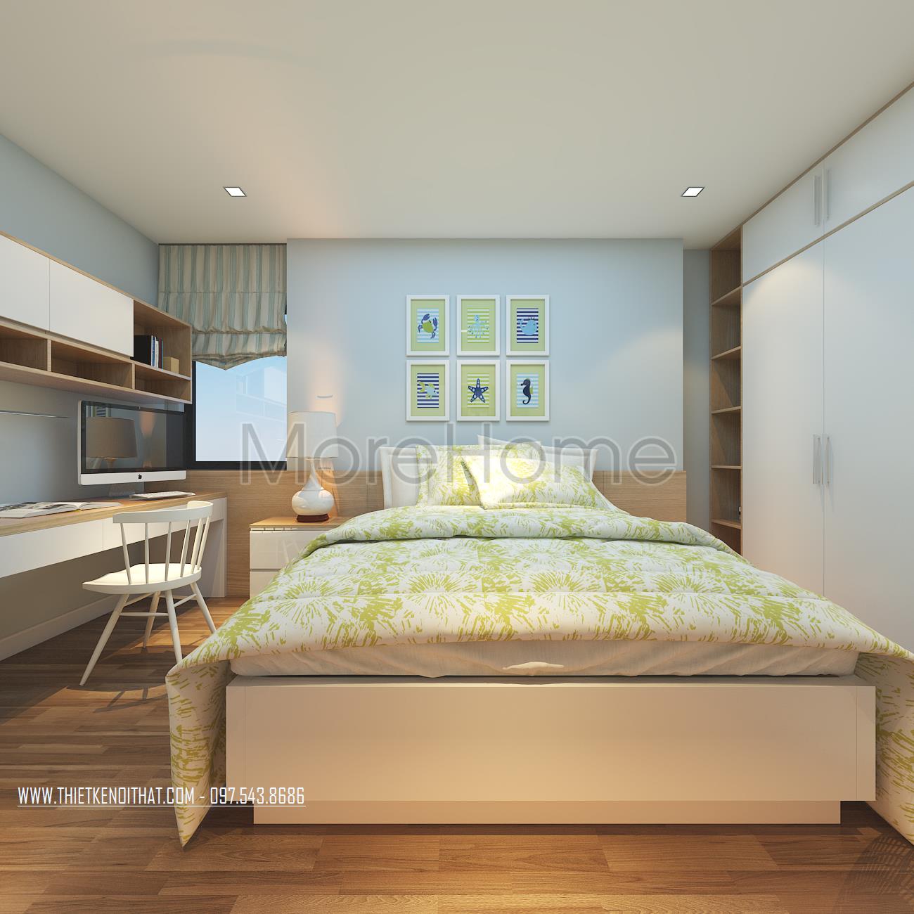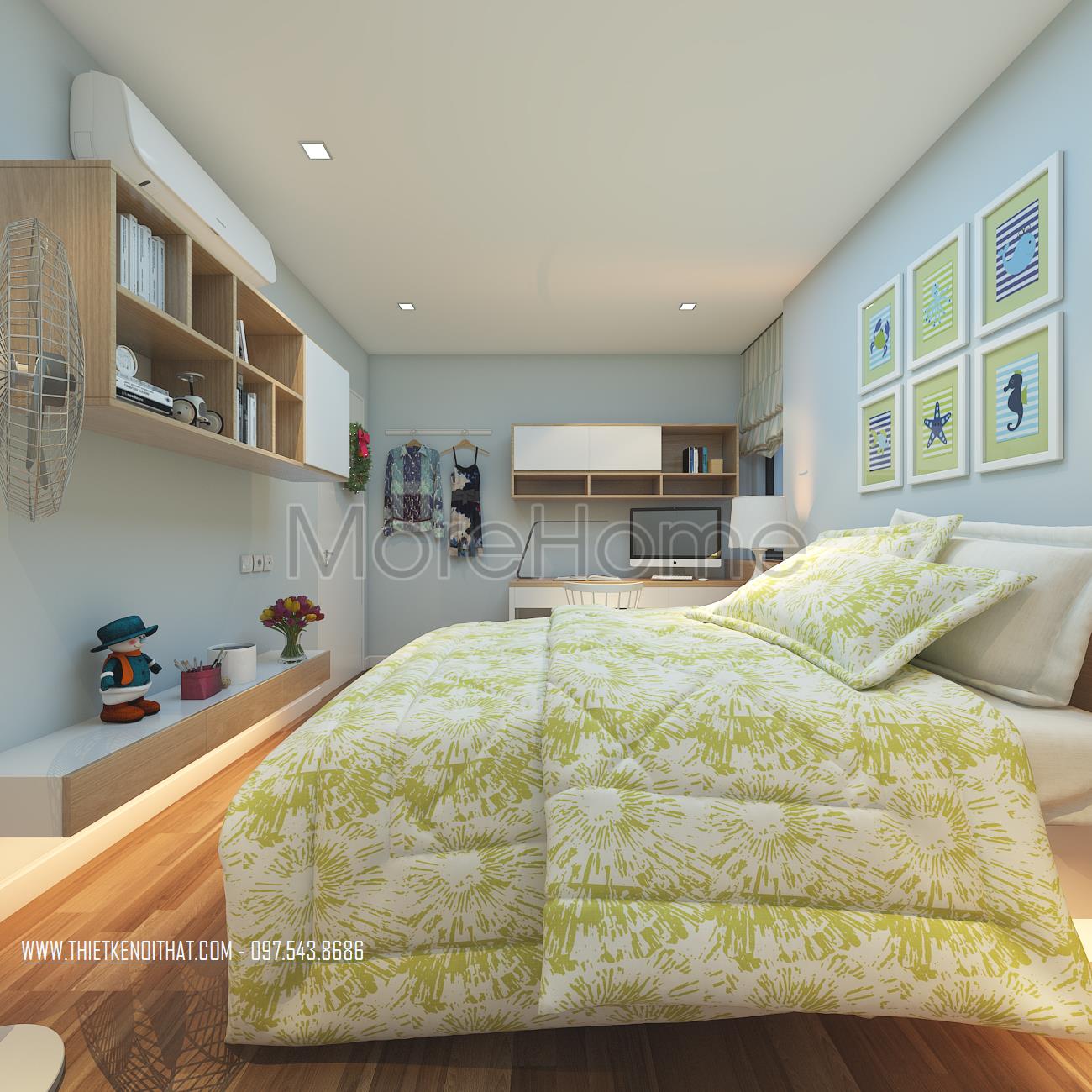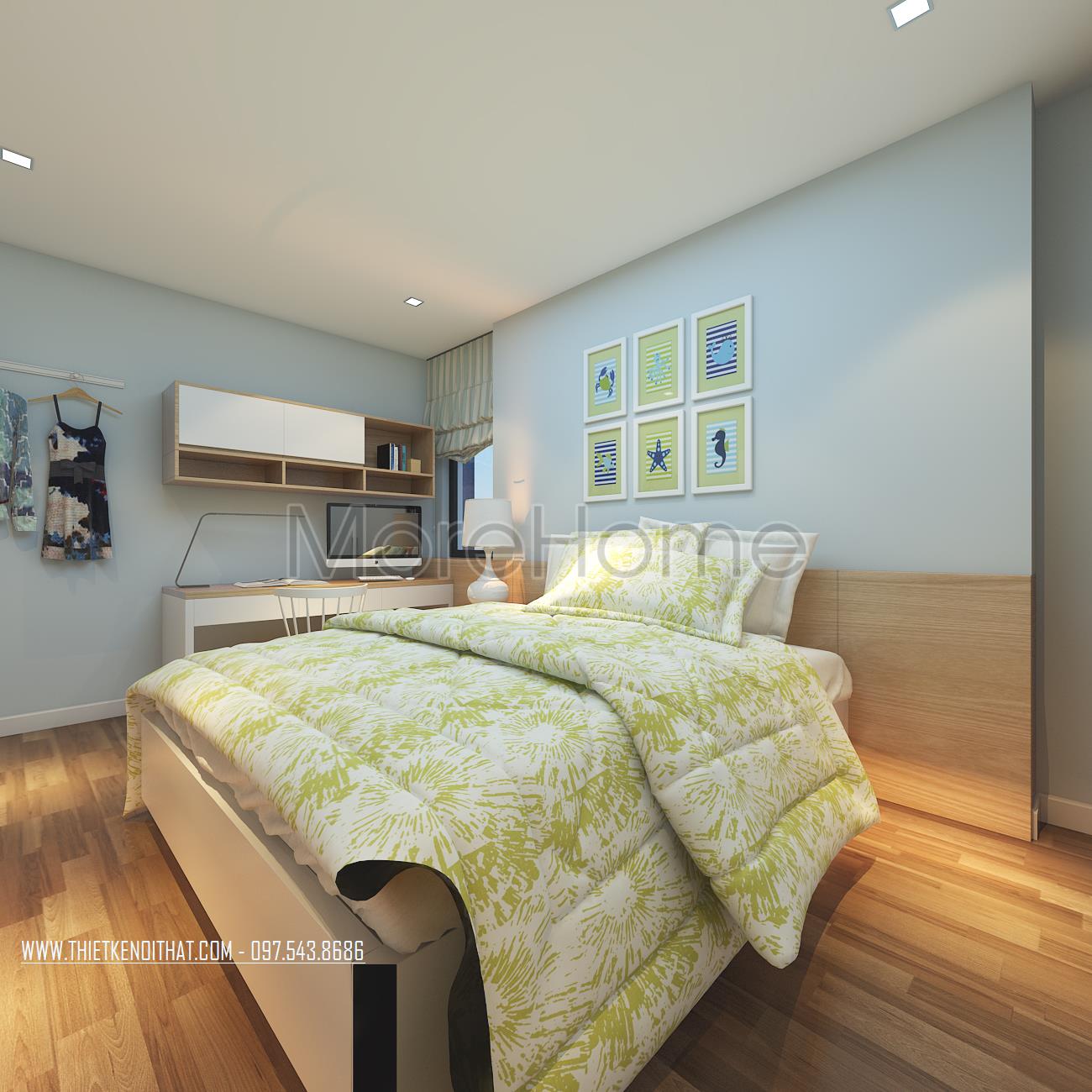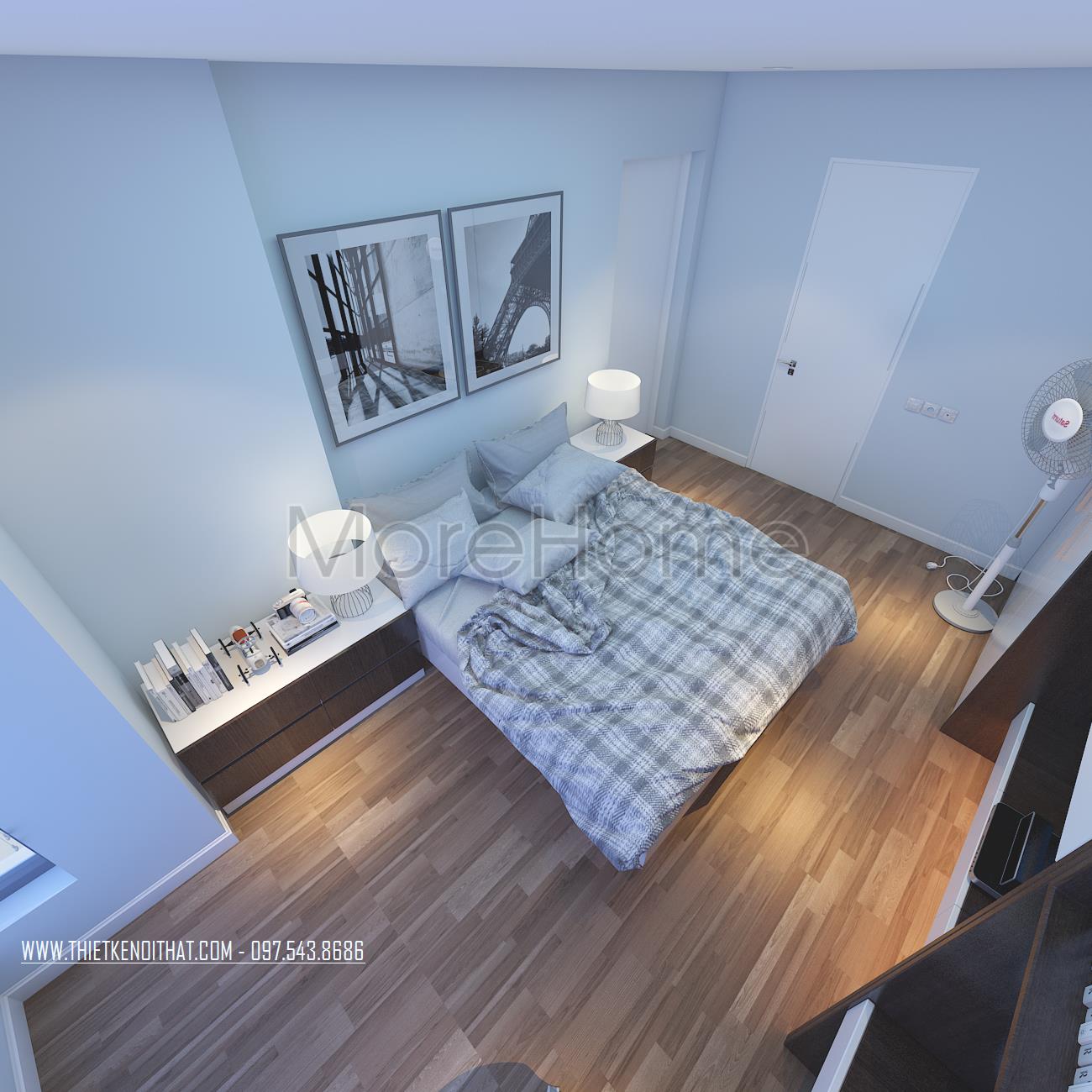 Cuối cùng là thiết kế nội thất không gian phòng ngủ sử dụng các tone màu vàng và xanh pastel làm điểm nhấn theo nét cá tính và sở thích của từng thành viên. Các vật liệu nhẹ như gỗ tự nhiên và kính cường lực được sử dụng để tránh cảm giác nặng nề và tăng độ thoáng cho không gian.