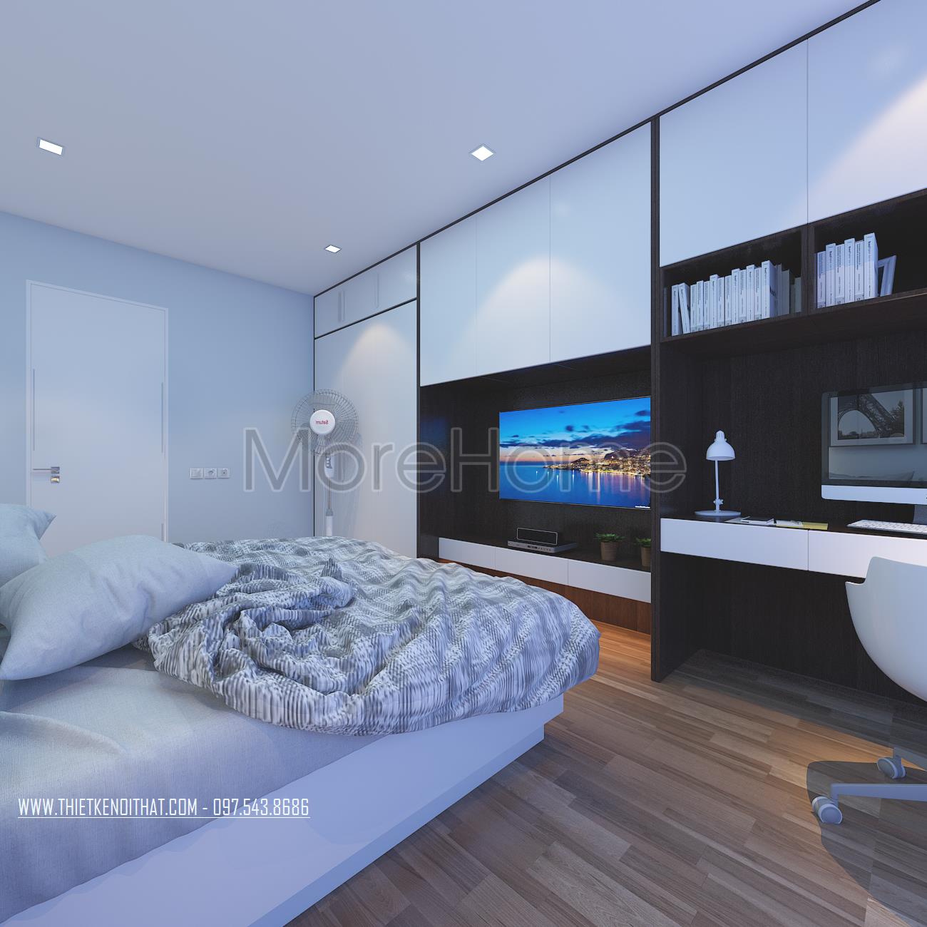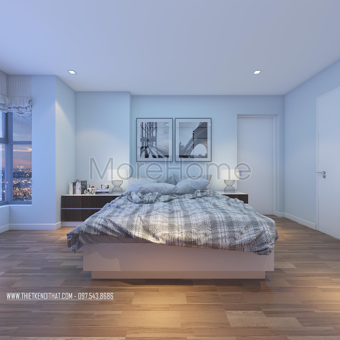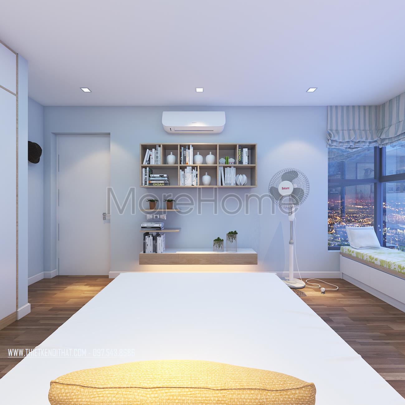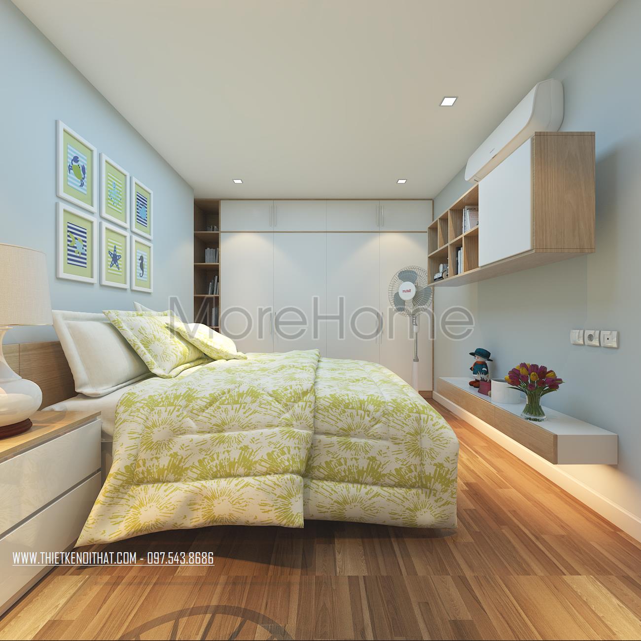 Cuối cùng là thiết kế nội thất không gian phòng ngủ sử dụng các tone màu vàng và xanh pastel làm điểm nhấn theo nét cá tính và sở thích của từng thành viên. Các vật liệu nhẹ như gỗ tự nhiên và kính cường lực được sử dụng để tránh cảm giác nặng nề và tăng độ thoáng cho không gian.