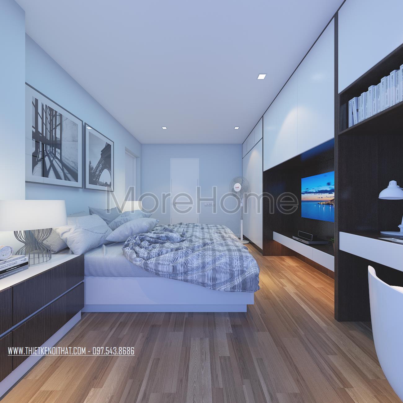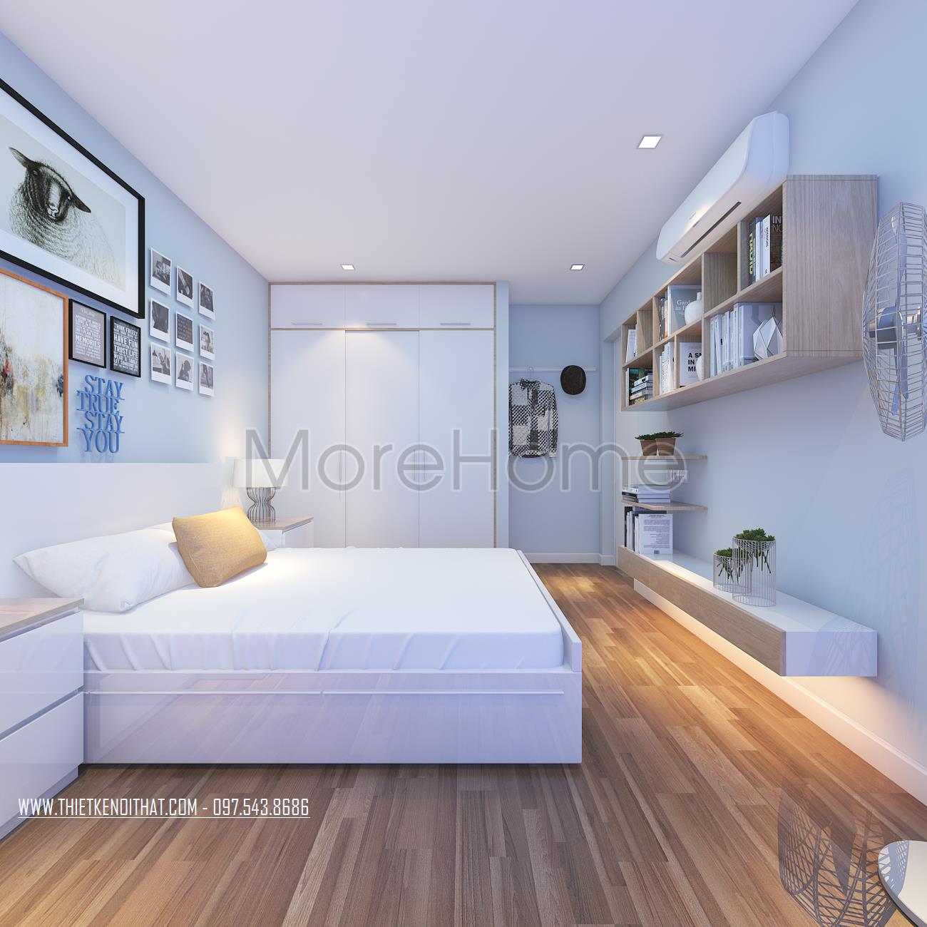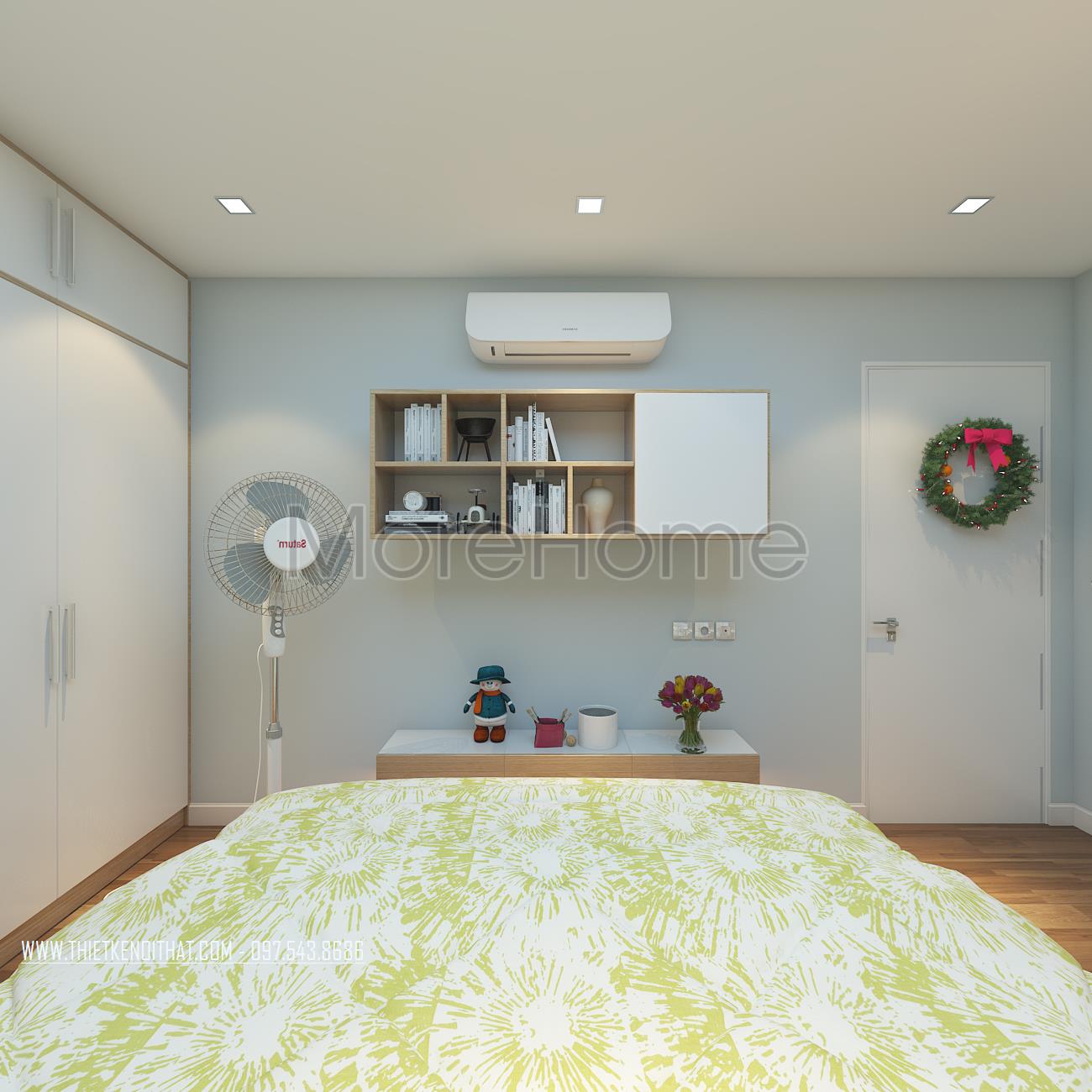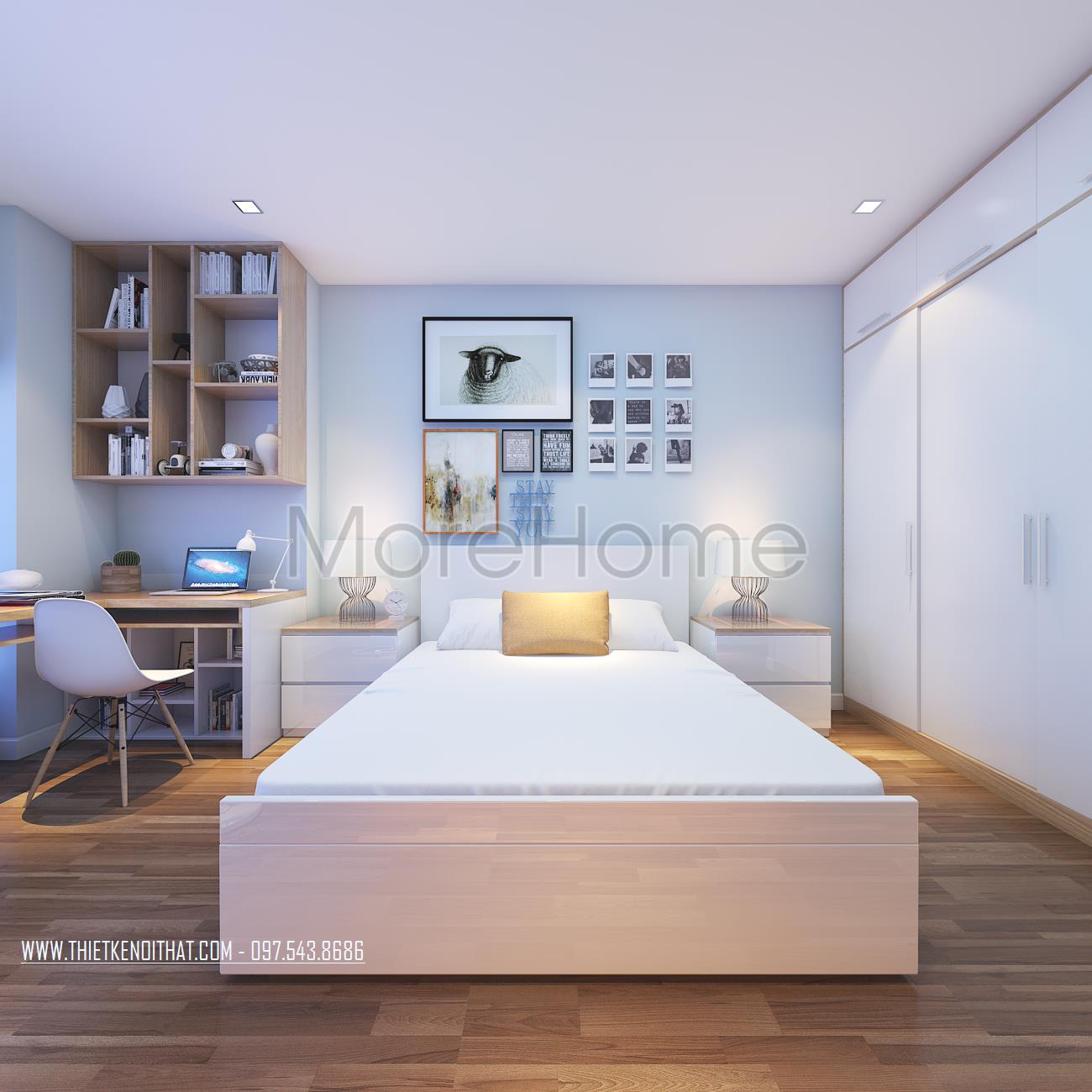 Cuối cùng là thiết kế nội thất không gian phòng ngủ sử dụng các tone màu vàng và xanh pastel làm điểm nhấn theo nét cá tính và sở thích của từng thành viên. Các vật liệu nhẹ như gỗ tự nhiên và kính cường lực được sử dụng để tránh cảm giác nặng nề và tăng độ thoáng cho không gian.