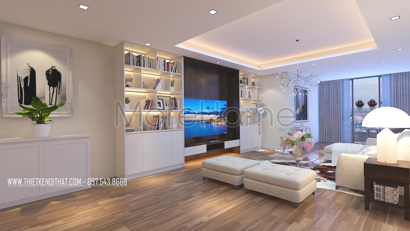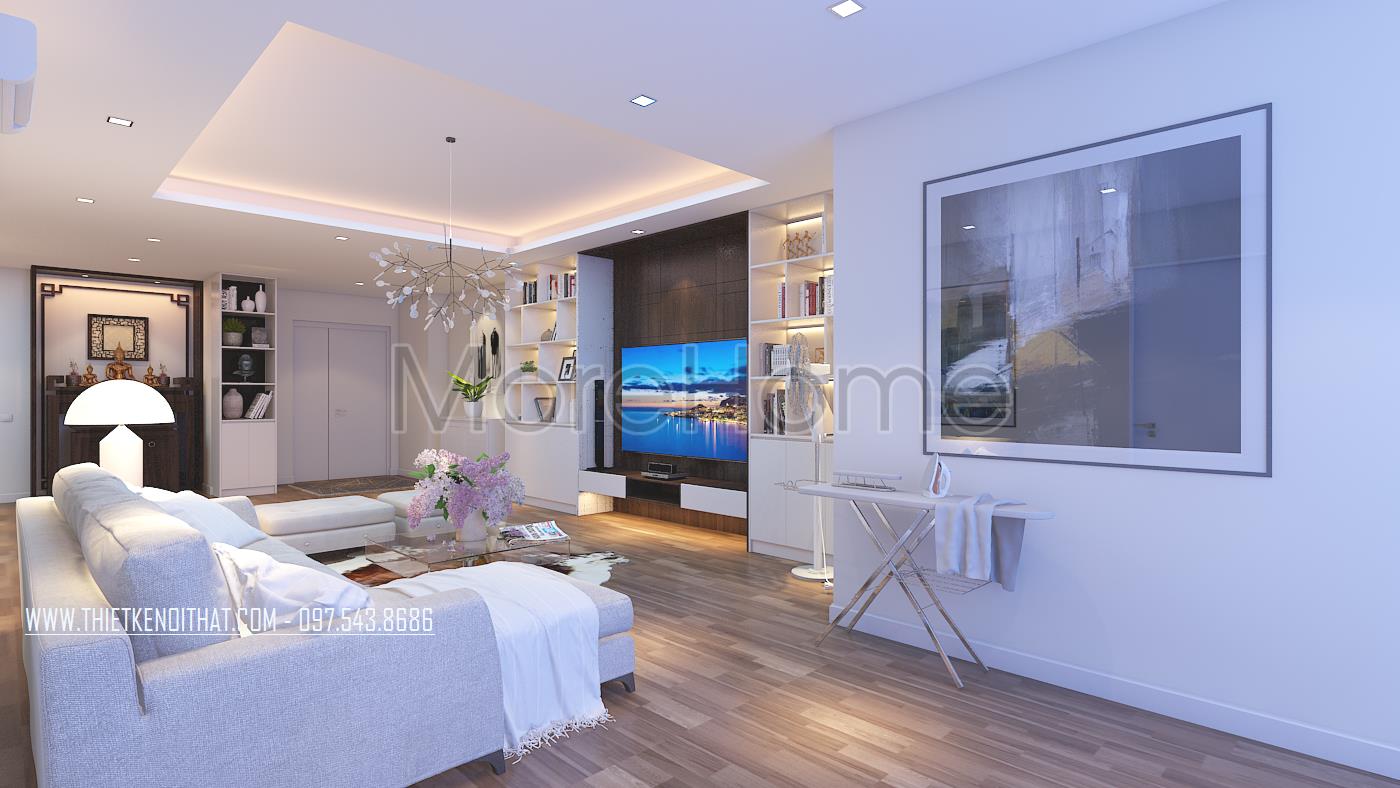 Thiết kế nội thất phòng khách hiện đại sử dụng tone màu sáng mang đến cảm giác bình yên và thư thái cho gia chủ. Một trong những điểm nhấn của căn phòng này chính là thiết kế mảng tường khác biệt. Với thiết kế chủ đạo là sắc trắng, thiết kế có thể gây ra cảm giác đơn điệu và nhàm chán, làm ảnh hưởng đến tính thẩm mỹ của căn nhà. Chính vì vậy mà thiết kế mảng tường đặc biệt kết hợp tủ sách âm tường là một sự kết hợp khéo léo và ấn tượng vừa đảm bảo tính công năng lại tăng sự sáng tạo cho không gian sống. Ngoài ra, với thiết kế này, kiến trúc sư đã tiết kiệm được đáng kể không gian cho hoạt động vui chơi của cả gia đình.