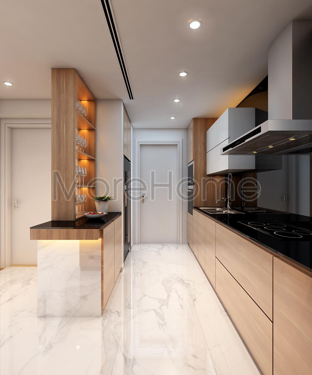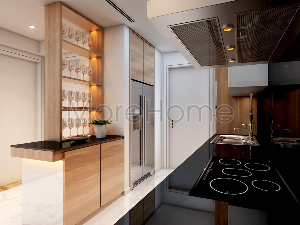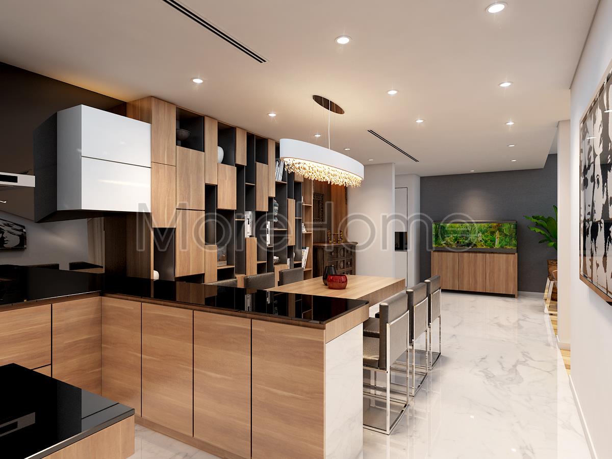 Không gian bếp được thiết kế liền kề không tạo vách ngăn tường thô cứng mà chỉ giữ một kệ bếp nhẹ nhàng với chiều cao vừa phải vừa đảm bảo tính rõ ràng trong thiết kế lại không làm ảnh hưởng đến tầm quan sát của gia chủ.
