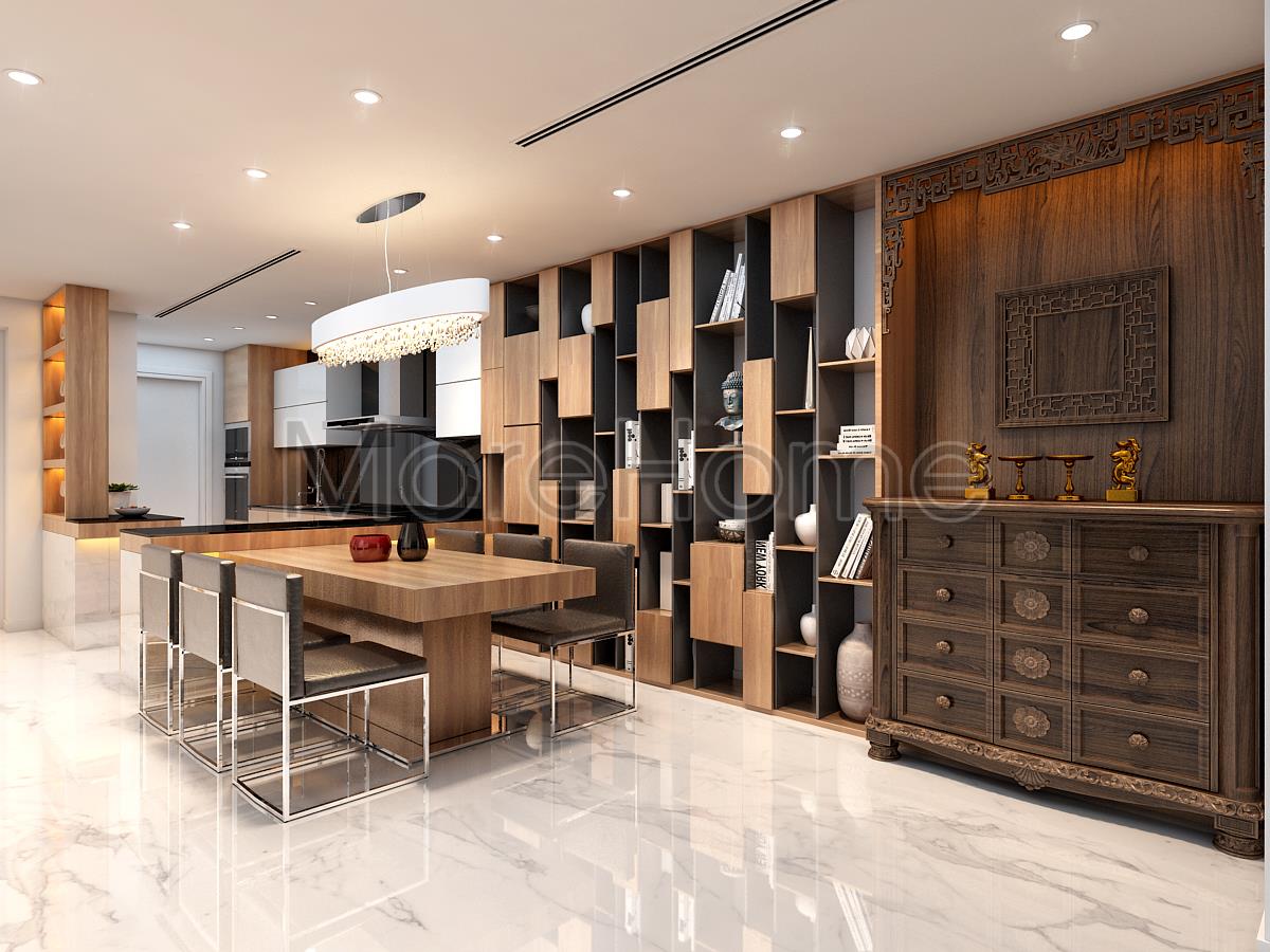 Thiết kế nội thất phòng ăn hiện đại gây ấn tượng bởi vẻ đẹp hiện đại và sự ngăn nắp, gọn gàng. Bàn ăn được thiết kế đơn giản, không quá trọng các chi tiết trang trí cầu kỳ hay các màu sắc nổi trội mà thay vào đó là thiết kế đường nét rõ ràng với tone màu nâu sáng, tạo sự đồng nhất và liền mạch trong thiết kế. Điểm nhấn đáng chú ý nhất của không gian bàn ăn chính là thiết kế tủ gỗ ấm tường kết hợp kệ trang trí. Với thiết kế trẻ trung phá cách, kiến trúc sư đã khéo léo giữ được nét hiện đại trong thiết kế mà vẫn đảm bảo tính tiện nghi và linh hoạt cho không gian.