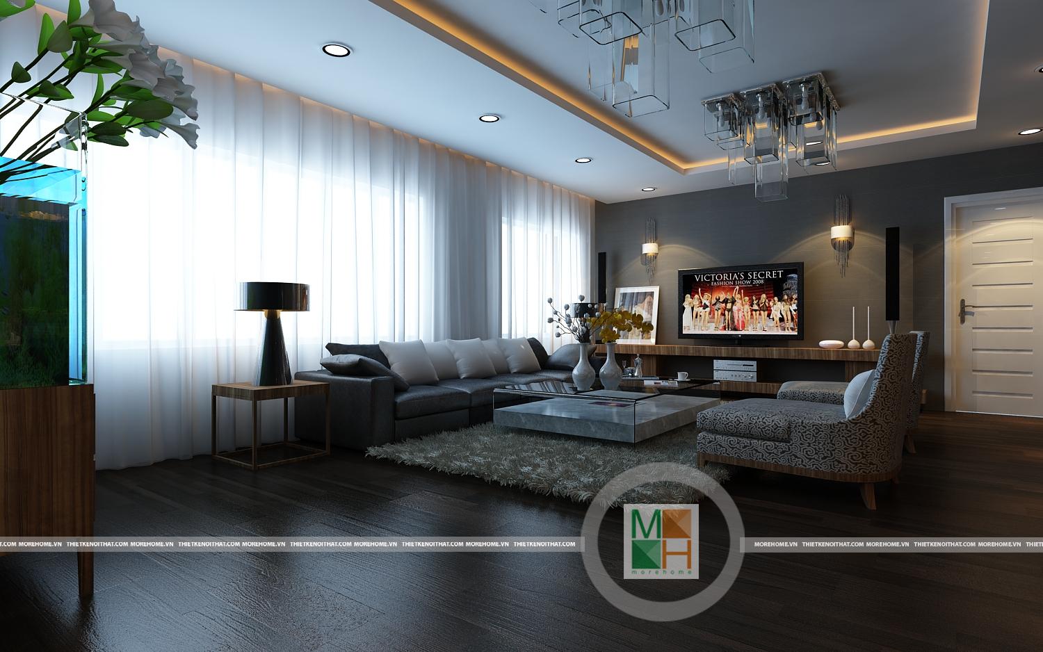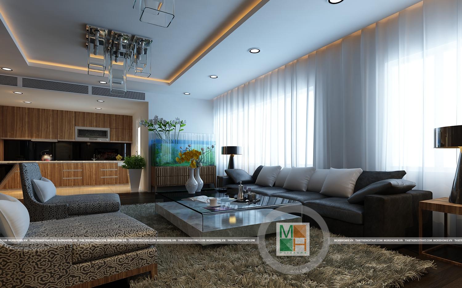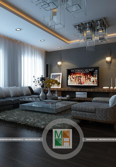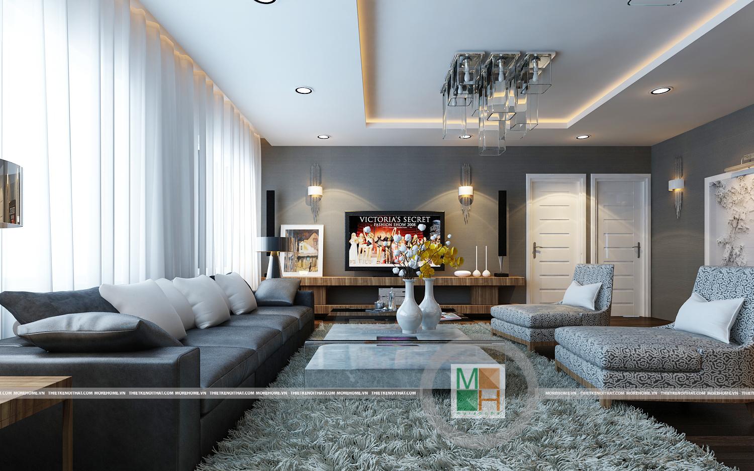 Phòng khách được thiết kế với tông màu chủ đạo là trắng và xám mang đến không gian sống trang nhã và hiện đại. Sofa được thiết kế với đường nét hiện đại, tinh tế. Khác biệt lớn nhất của thiết kế này với các thiết kế chung cư khác có lẽ là ở diện tích khá rộng, không bị chia cắt bởi các bức tường thô, cứng. Chính vì vậy mà không gian được mở khá rộng tạo độ thoáng cho căn phòng. Ánh sáng tự nhiên từ khung cửa rộng được tận dụng tối đa làm tăng tính thẩm mỹ và giúp gia chủ tiết kiệm lượng lớn điện năng dùng cho chiếu sáng. Màu sắc được điểm xuyết nhẹ nhàng làm xóa đơn sự đơn điệu và nhàm chán.