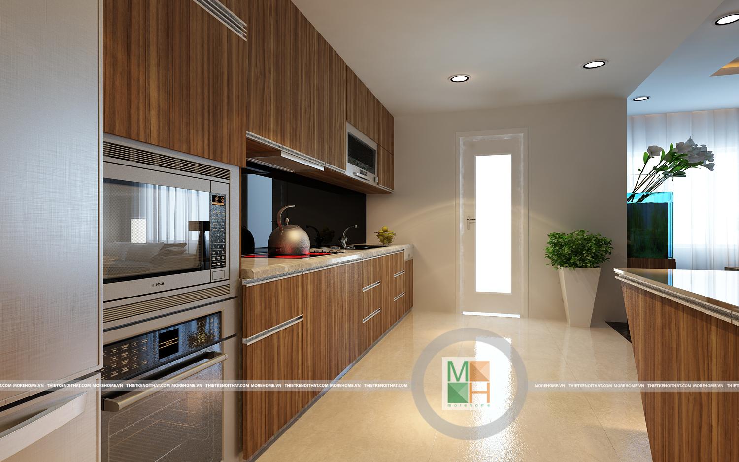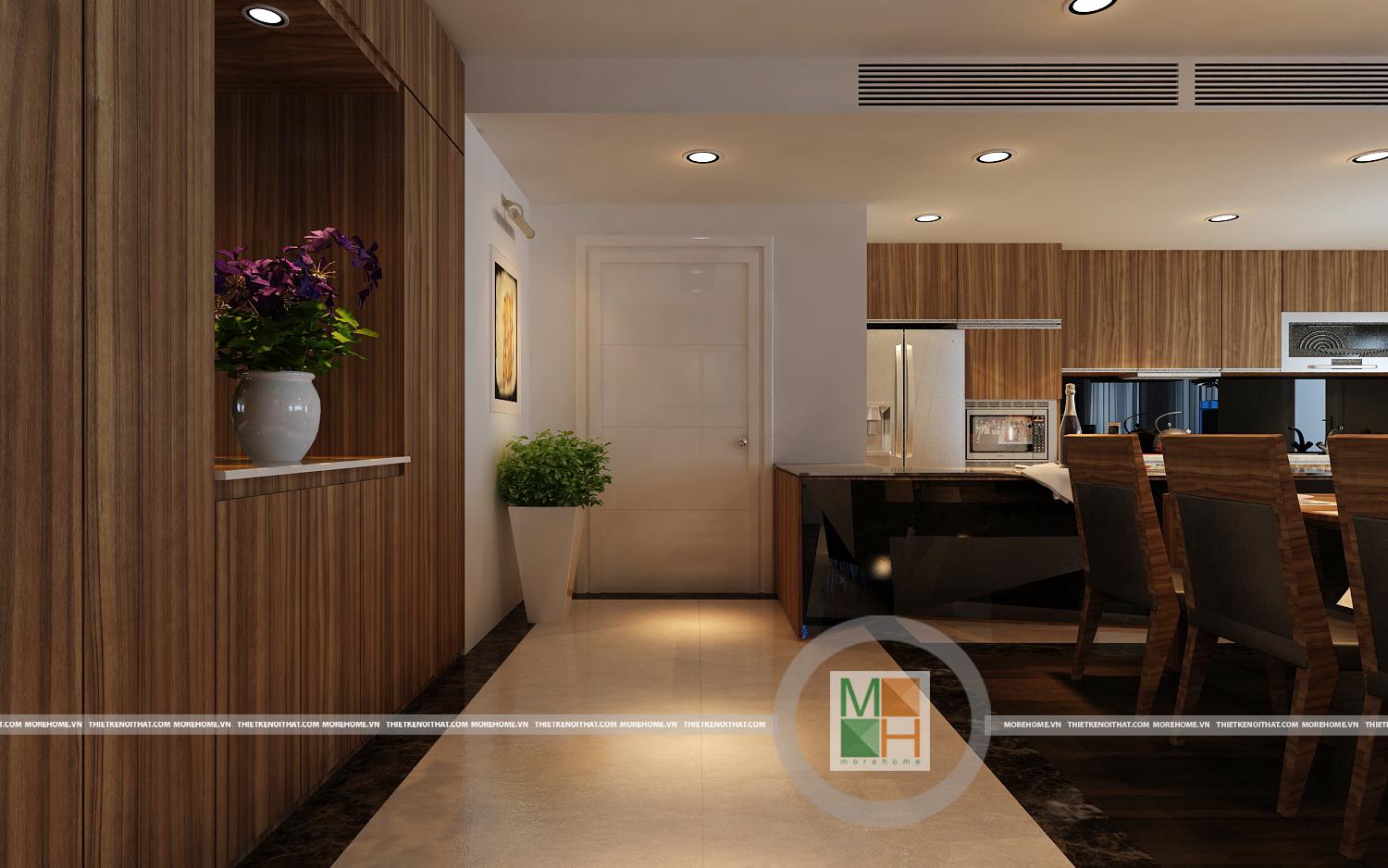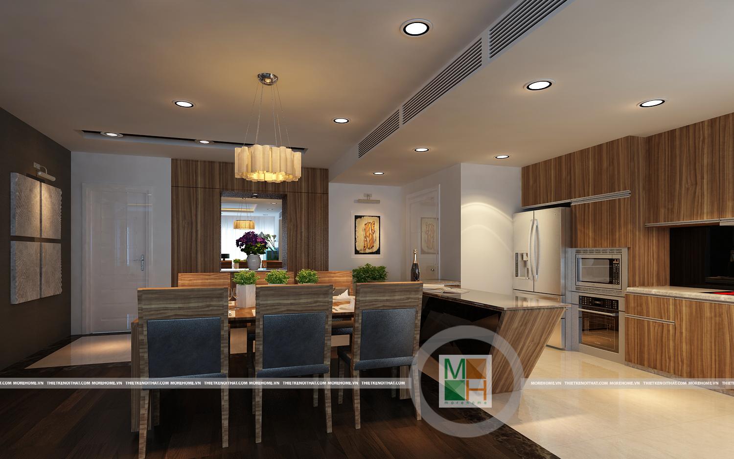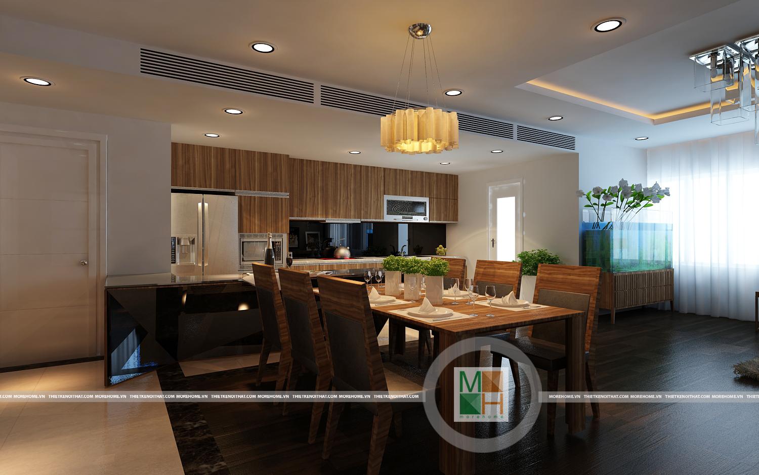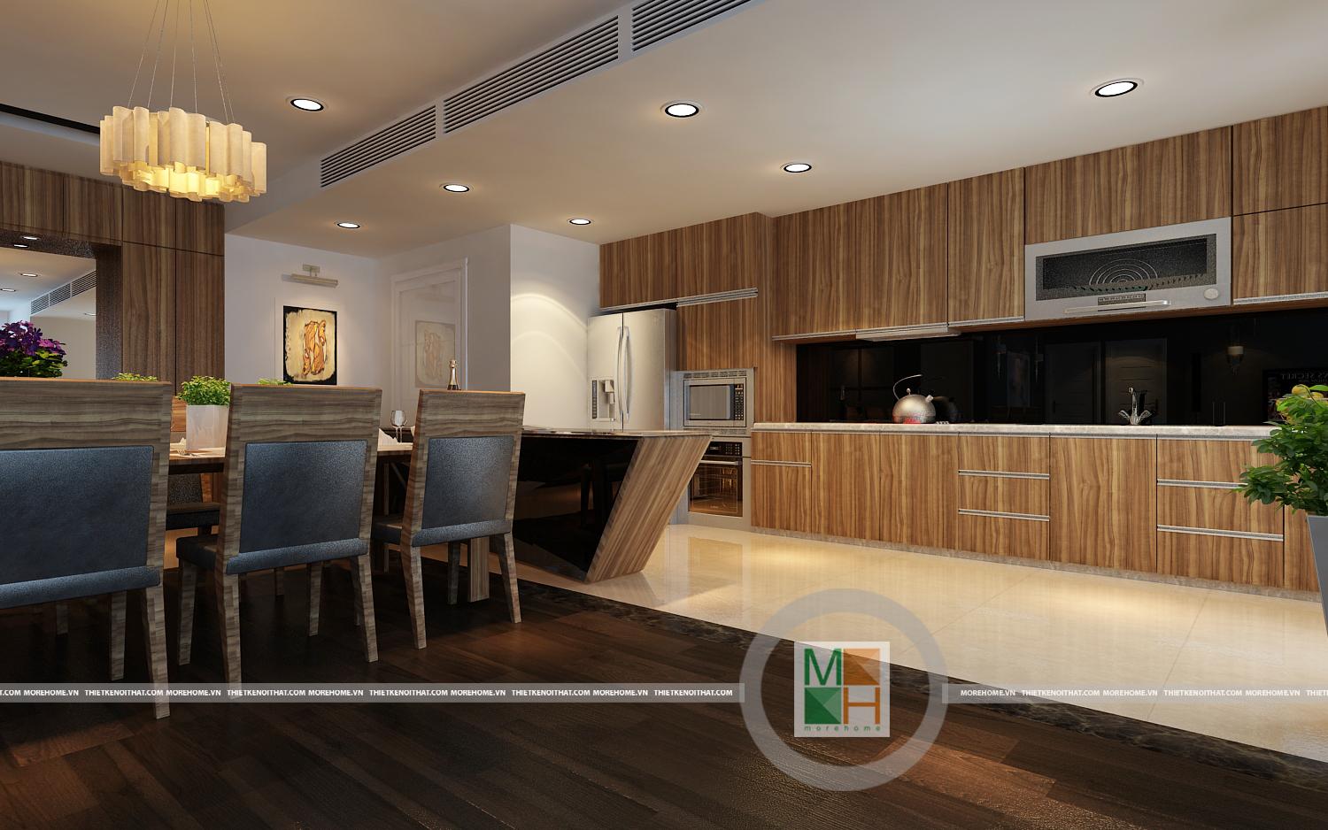 Thiết kế phòng bếp và bàn ăn liền kề với hệ thống tủ kệ veneer giả gỗ mang đến sự thân thiện và gần gũi. Các vật dụng trang trí được lựa chọn đều là những sản phẩm sáng tạo độc đáo mang đến sự hiện đại và tinh tế cho toàn bộ không gian sinh hoạt chung của cả gia đình.