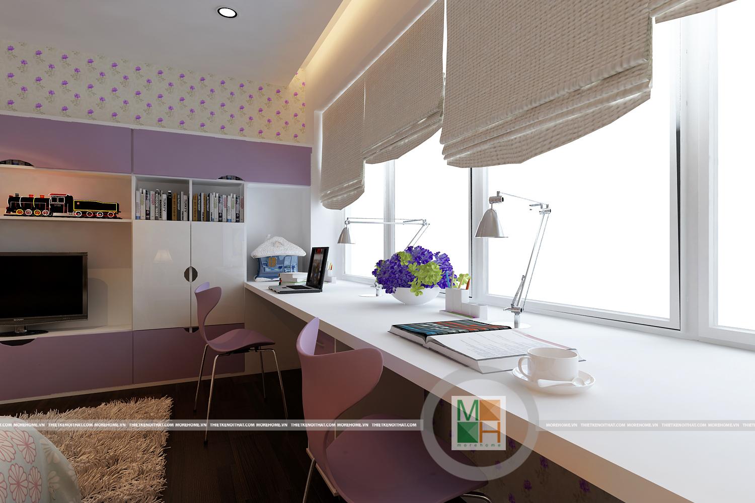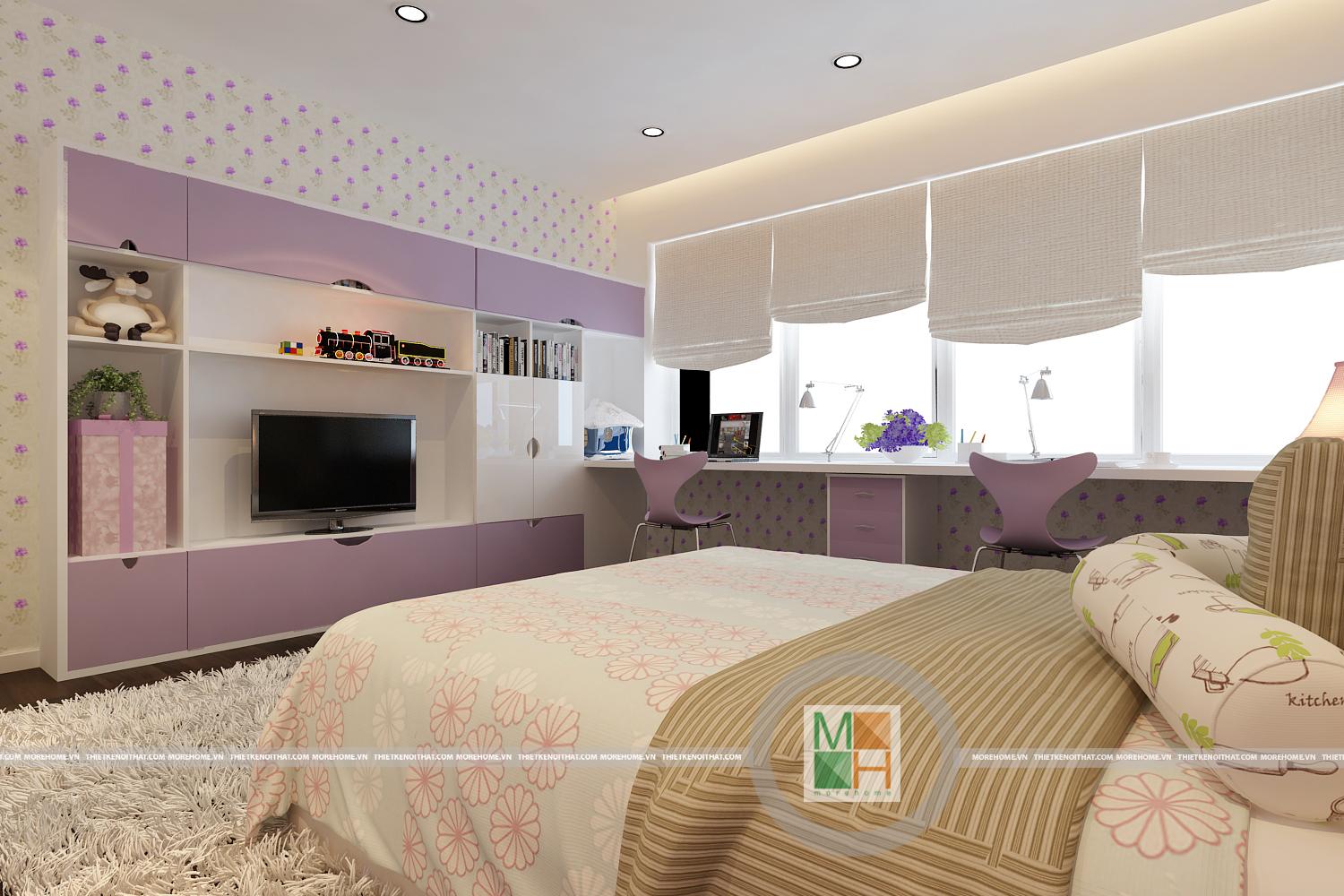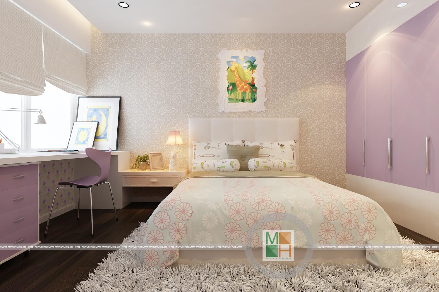 Thiết kế căn phòng ngủ thứ hai với sự kết hợp hài hòa các tông màu đơn sắc. Ánh sáng tự nhiên được sử dụng tối đa từ khung cửa sổ tạo độ thoáng cho căn phòng. Hệ thống tủ đựng đồ thiết kế hợp lý gần như đồng nhất với tường mang đến tiện nghi cho căn phòng và tiết kiệm tối đa diện tích sử dụng.