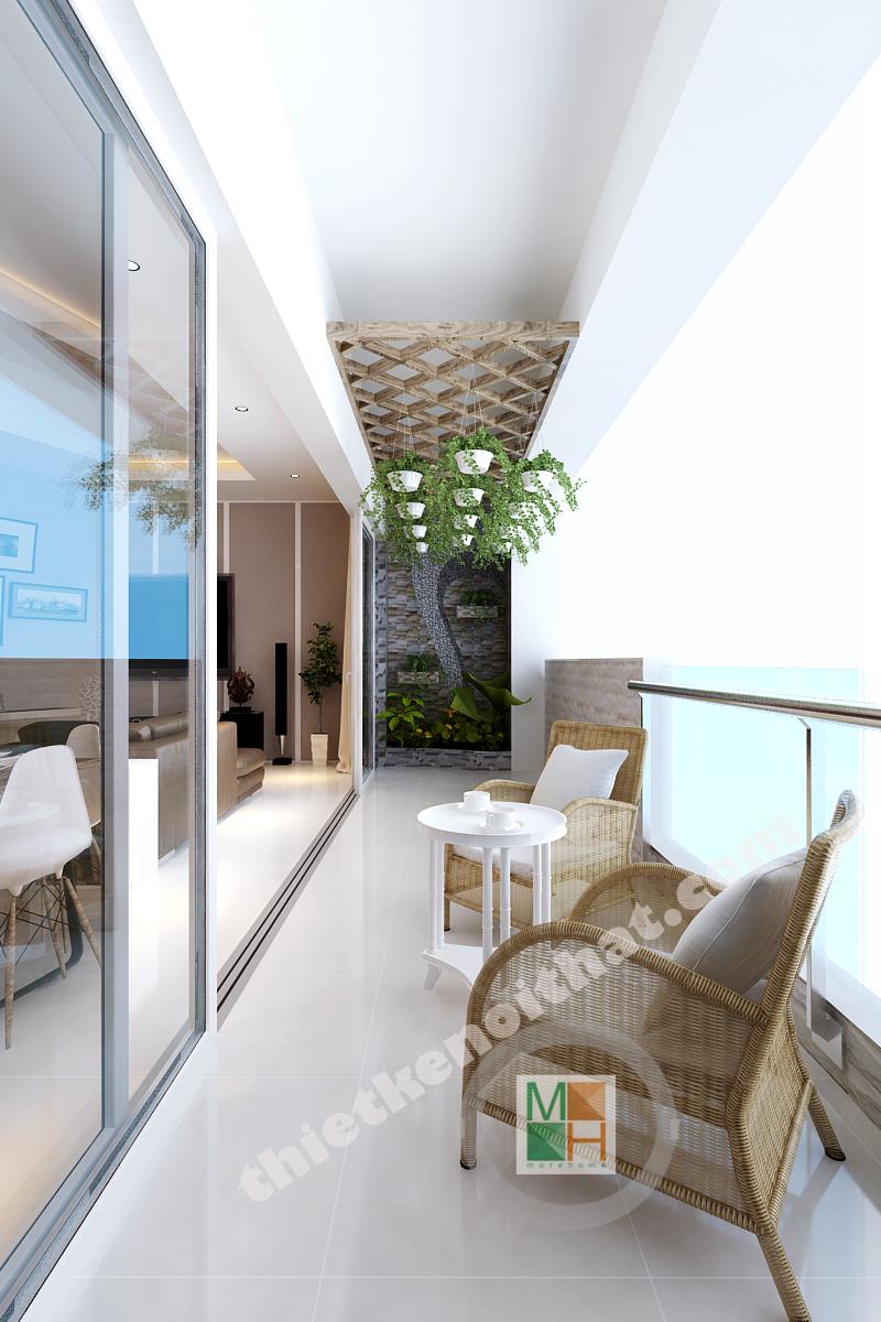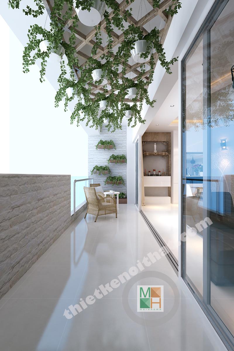 Ban công là một trong những thiết kế mang đến sự hài hòa và cân bằng cho toàn bộ không gian sinh hoạt chung phía trong nhà. Thiết kế ban công mở với điểm nhấn là màu xanh hoa lá và khu vườn treo độc đáo tạo thành một quán bar nhẹ nhàng, thư giãn cho gia chủ sau một ngày làm việc dài, mệt mỏi.