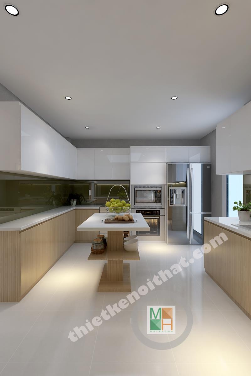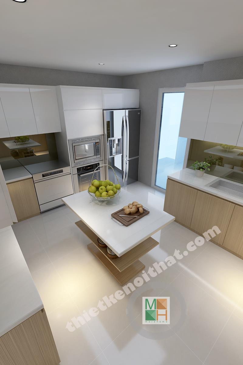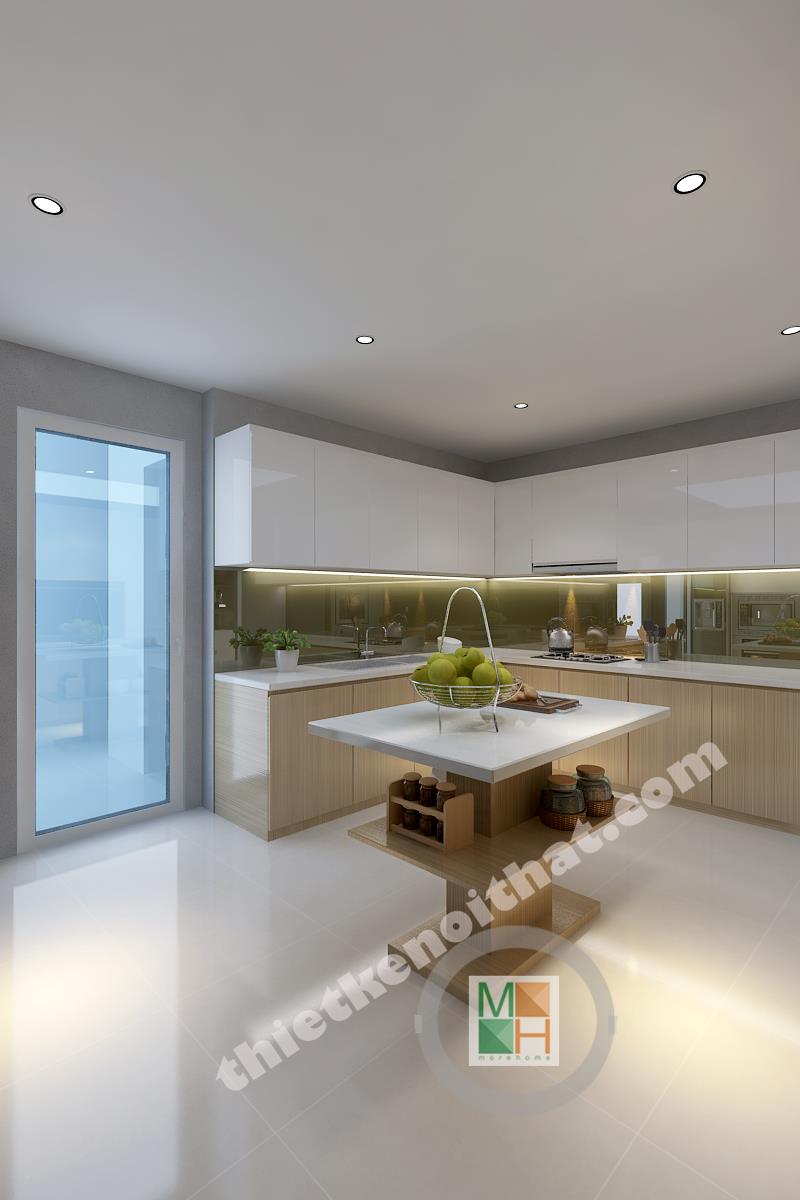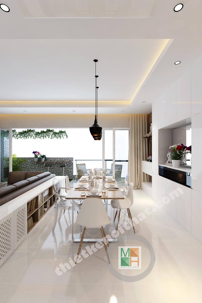 Thiết kế nội thất bàn ăn liền kề với phòng khách tạo không gian liền mạch giúp tăng tính tiện nghi cho không gian đa năng, linh hoạt. Bàn ăn dạng cách tân kéo dài hướng ra ban công, ánh sáng tự nhiên có điều kiện tràn vào căn nhà và mang lại hứng khởi cho các thành viên cho gia đình. Bên cạnh đó, thiết kế tủ gỗ âm tường kết hợp với gương phản chiếu giúp tăng chiều sâu cho căn phòng.