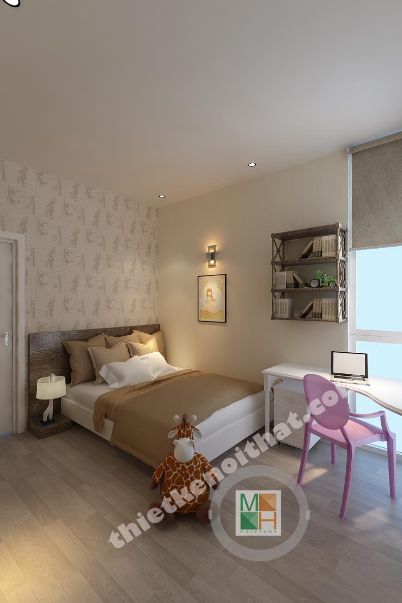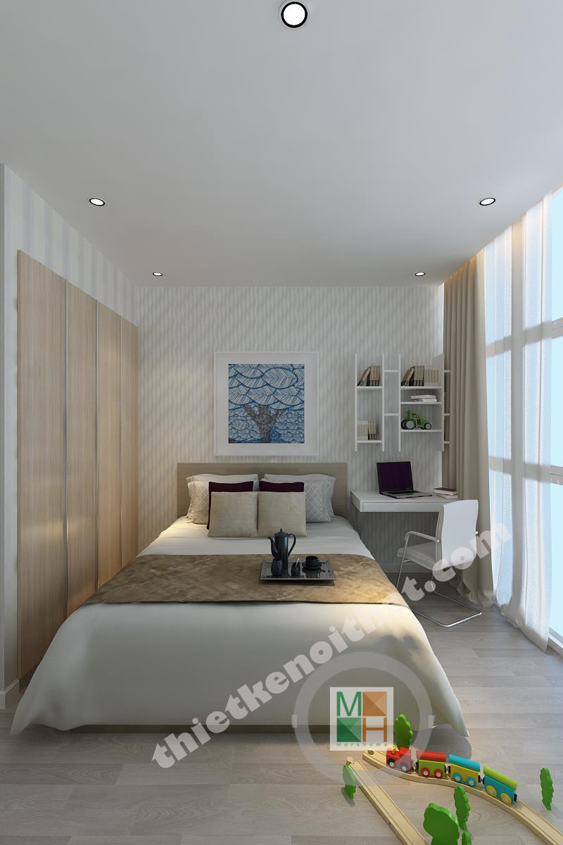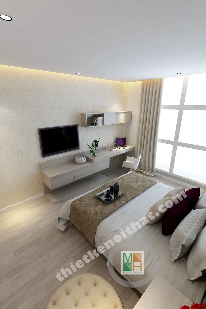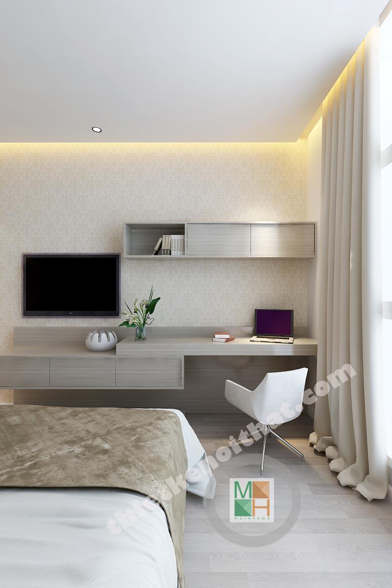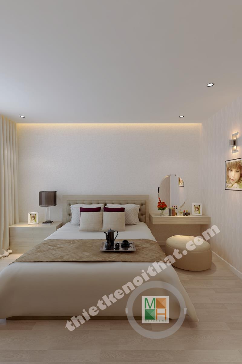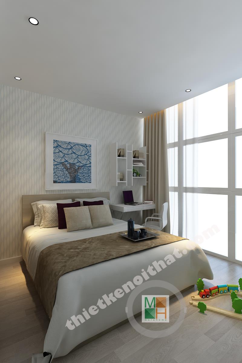 Thiết kế nội thất phòng ngủ hiện đại sử dụng tone màu be làm chủ đạo mang đến cho gia chủ cảm giác thân thuộc và gần gũi. Thiết kế giường đơn giản, không quá nặng về chi tiết vì vậy tránh được cảm giác rườm rà và rối mắt. Bên cạnh đó, các thiết kế nhẹ nhàng tủ gỗ hay bàn trang điểm sử dụng thanh ngang nhẹ nhàng giúp tiết kiệm không gian sinh hoạt và tạo độ thoáng cho căn phòng. Bốn bức tường thô cứngđược thay thế bằng khung tường kính rộng mang lại độ mở cho không gian và tránh được sự bí bách trong không gian tù túng.