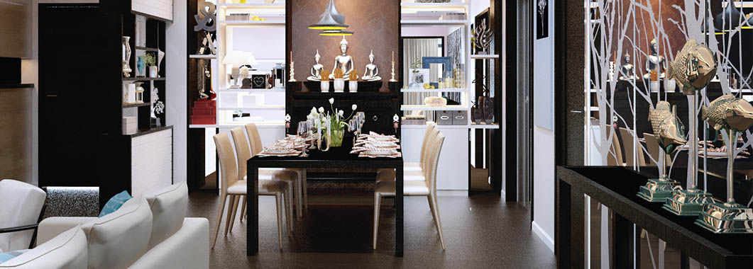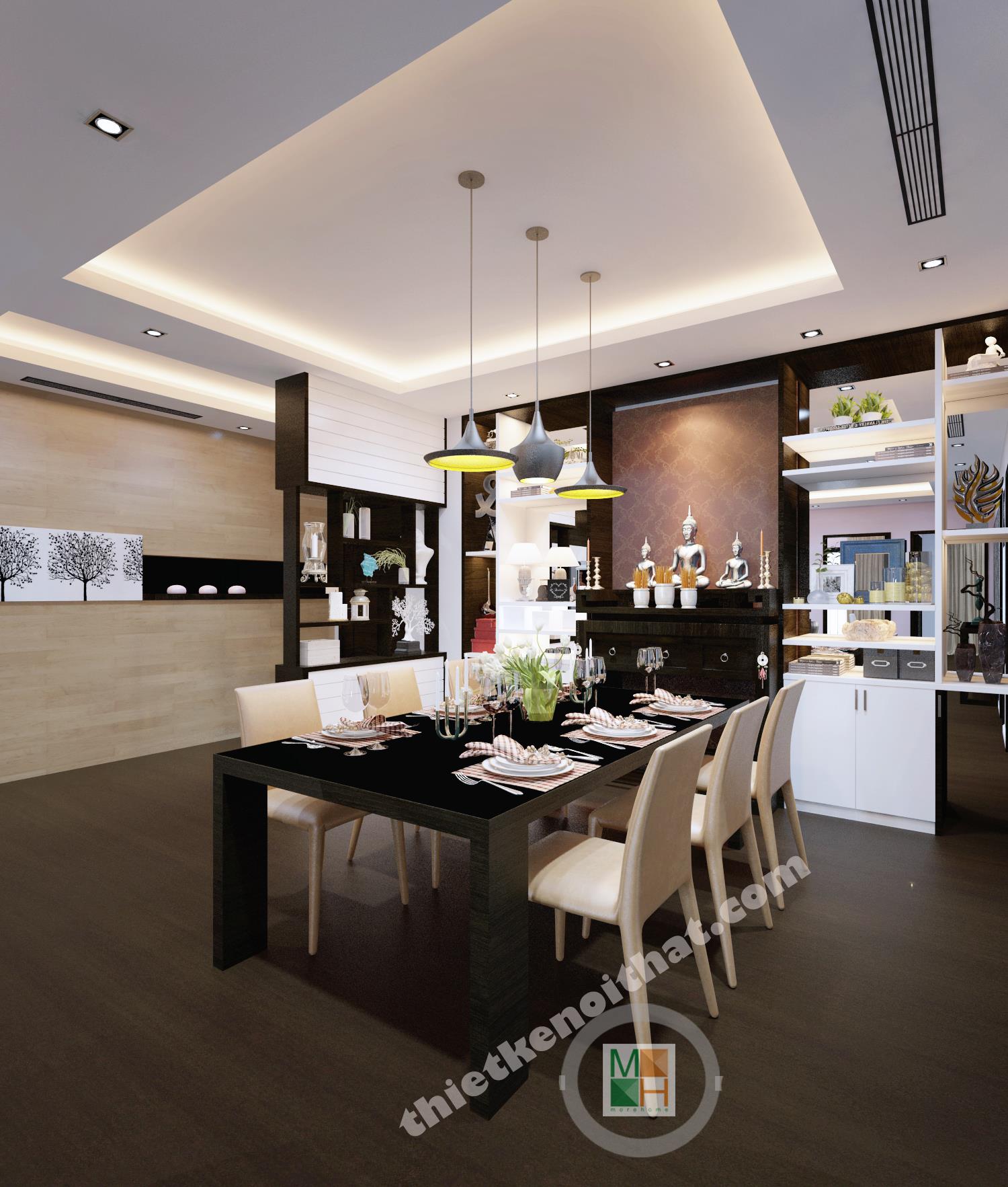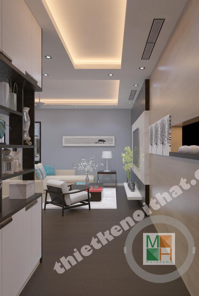 Gian khách – bếp được thiết kế thành một tổ hợp trong một không gian chung và không bị ngăn cách, giúp tổ hợp này càng trở nên rộng thoáng hơn. Nội thất khu khách – bếp được thiết kế nội thất hiện đại và có cá tính riêng. Sự tương phản được thể hiện rõ nét giữa màu nâu đen và màu trắng. Với hai màu chủ đạo này, căn phòng trở nên mạnh mẽ hơn, cá tính hơn. Khu tiếp khách được đặt sô pha màu kem đơn giản nhưng lại rất sang trọng, kết hợp cùng với bàn thấp ít chi tiết. Phòng không sử dụng đèn chùm mà chỉ sử dụng đèn hắt trần và đèn mắt trâu vô cùng đơn giản. Khu vực bếp được thiết kế gọn gàng với các chi tiết trang trí nội thất sang trọng phù hợp với không gian dành cho chủ nhà đã lớn tuổi với bàn ăn đơn giản và đối diện là bàn thờ phật. Kệ đặt đồ trang trí hoặc rượu đồng thời cũng là để tôn thêm nét đẹp cho căn phòng. Gian khách còn có một góc nhỏ để làm góc đọc sách.