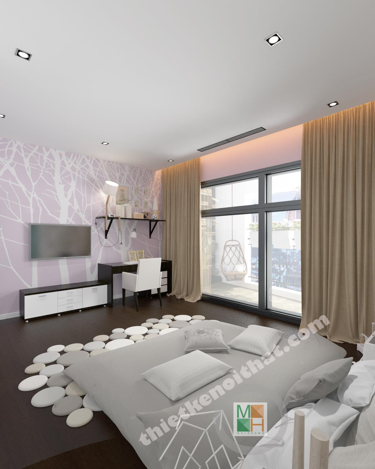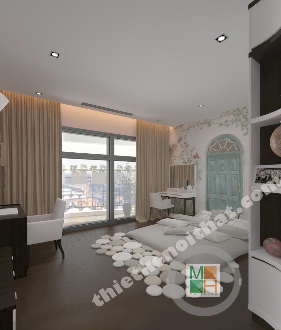 Phòng ngủ của con gái có chung một lối thiết kế và phối màu với gian khách bếp với màu trắng và nâu đen nổi bật. Tuy nhiên ở đây màu trắng là màu chủ đạo và màu nâu là điểm nhấn. Những viền nâu gỗ trên tủ đồ đã giúp màu trắng của chiếc tủ không còn nhàm chán. Sự phối hợp giữa màu trắng và nâu gỗ cũng được thể hiện ở bàn làm việc. Tuy nhiên những nét nhẹ nhàng nữ tính dành cho con gái vẫn được thể hiện rõ nét ở các chi tiết giường đệm, chăn ga gối hay là những chi tiết trang trí trên tường. Điểm khá đặc biệt ở đây là nhà thiết kế đã không sử dụng giường cho căn phòng mà chỉ dùng đệm lớn và đặt lên trên những tấm mút tròn rất mới mẻ và hiện đại. Bàn trang điểm được đặt ở cạnh giường là một thiết kế đúng và phù hợp với phòng của con gái. Ánh sáng của căn phòng được lấy từ khung cửa kính lớn và điều chỉnh bằng rèm. Hệ thống chiếu sáng được loại bỏ đèn chùm để giảm chi tiết và được lắp đèn mắt trâu âm trần để căn phòng giữ được nét hiện đại và năng động vốn có.