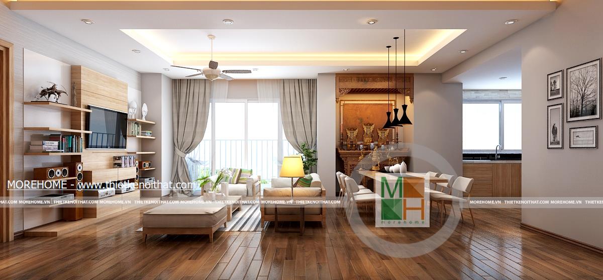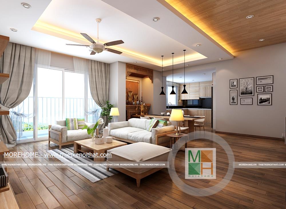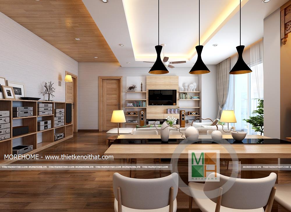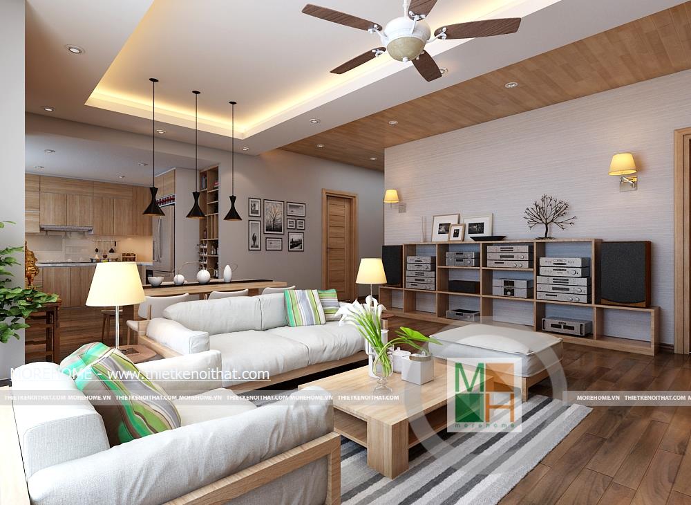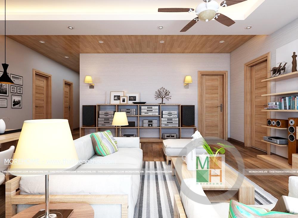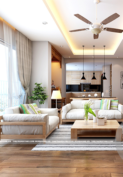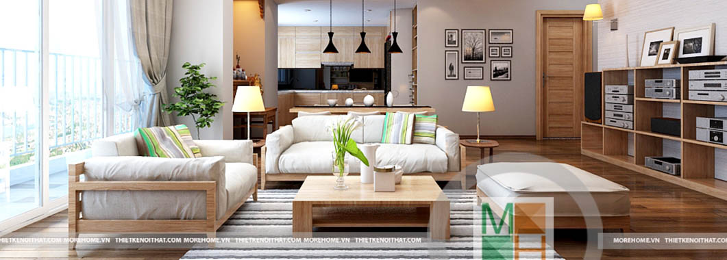 Không gian sinh hoạt chung bao gồm phòng khách, bếp và bàn ăn được đặt nối tiếp nhau để tạo sự gắn kết giữa các thành viên trong gia đình. Ở không gian tiếp khách, sự kết hợp giữa khung ghế gỗ và những tấm nệm trắng đem lại sự êm ái, sang trọng. Hệ thống cửa lùa ngăn phòng khách với ban công mang ánh sáng vào cho không gian phía trong, tạo sự thông thoáng và làm nổi bật màu sắc của nội thất gỗ. Những kệ đồ ở trong phòng không những tiện lợi để lưu trữ đồ mà còn giúp bạn trang trí cho những mảng tường trắng nhàm chán.