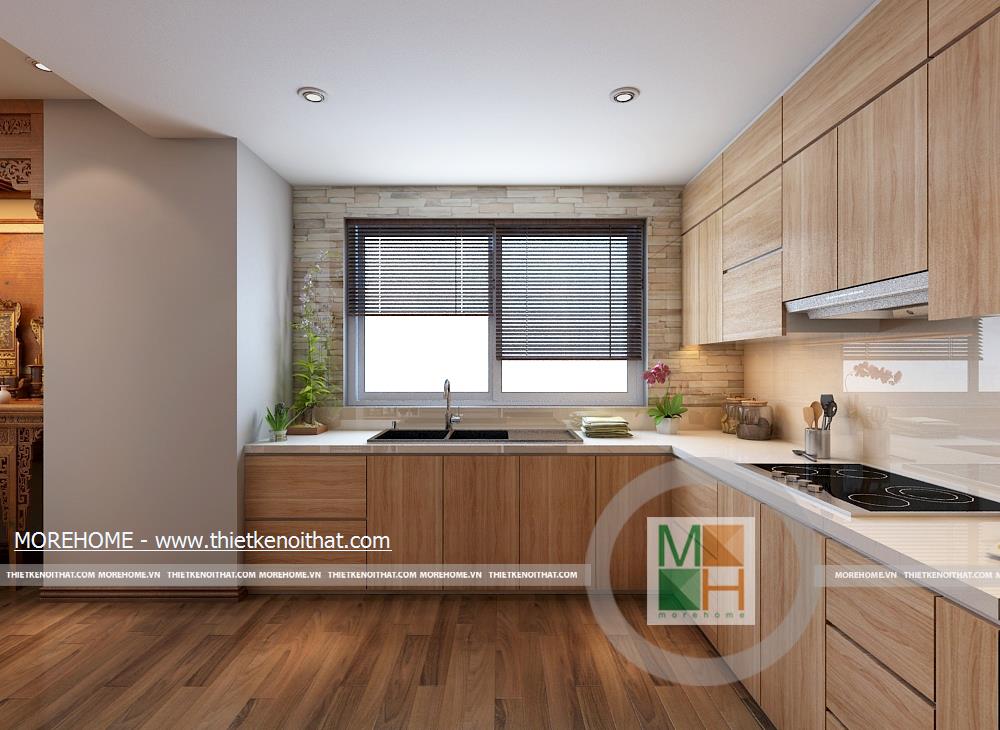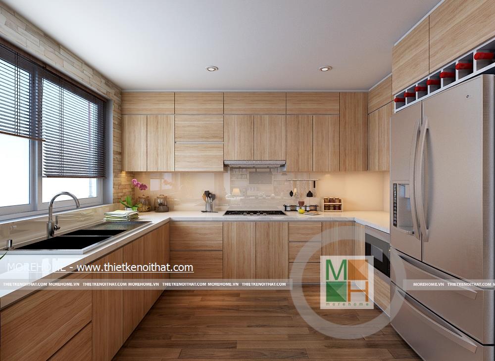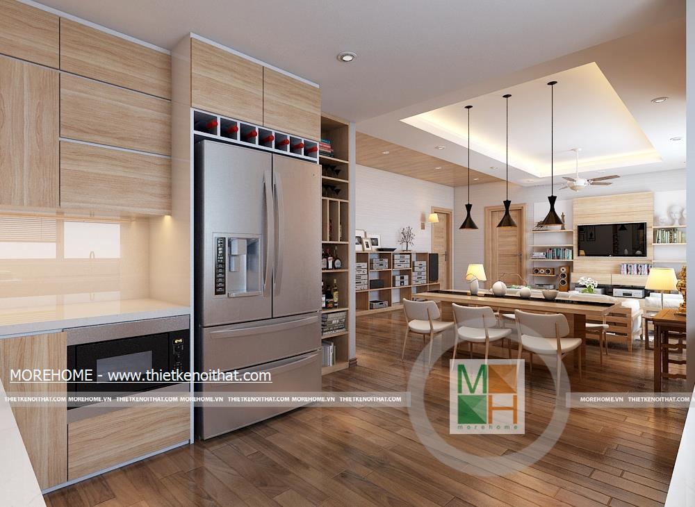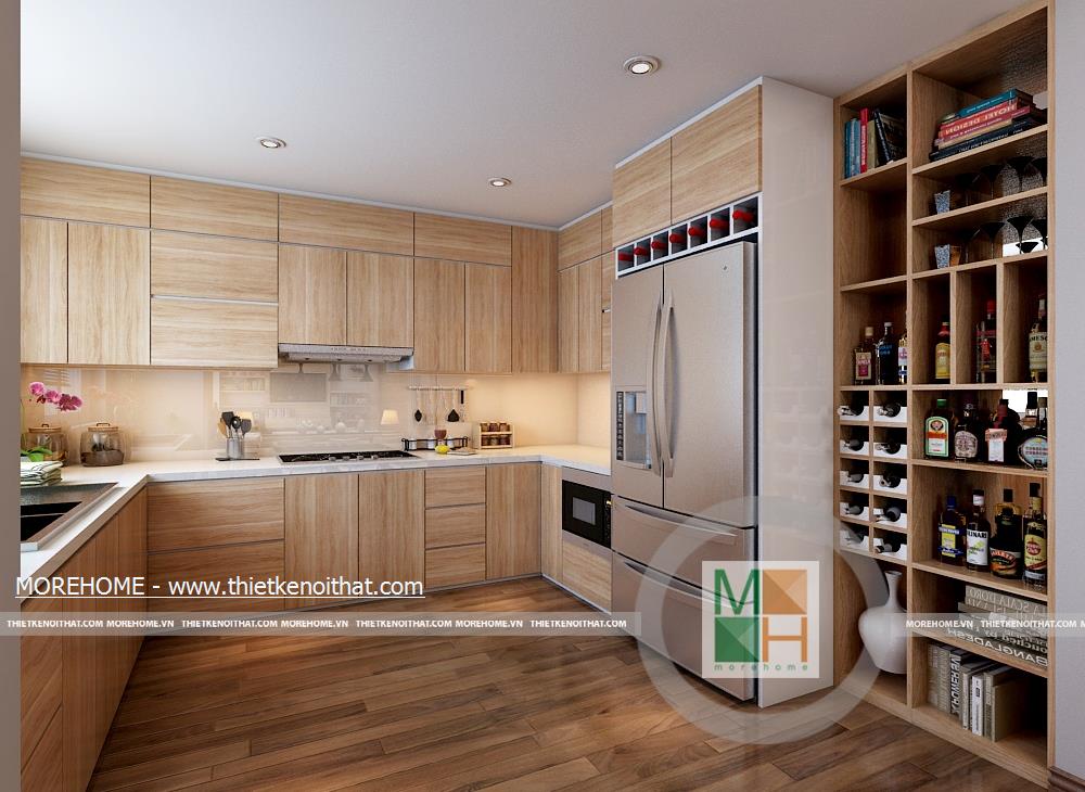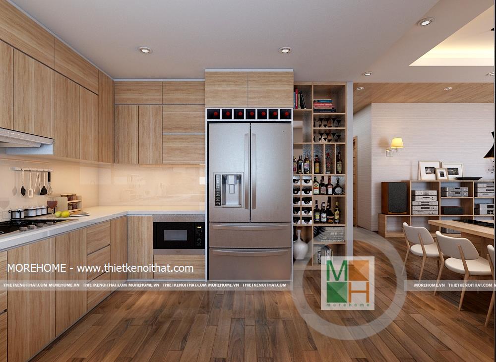 Khi thiết kế nội thất cho căn hộ này các kiến trúc sư đã gặp phải một điều khá khó khăn là diện tích căn hộ khá nhỏ. Bởi vậy không gian dành cho gian bếp cũng không có nhiều. Trong khi đó phòng bếp thường là nơi chứa khá nhiều đồ đạc và vật dụng linh tinh. Phải làm sao cho căn bếp vẫn gọn gàng mà vẫn có tính thẩm mỹ. Dưới con mắt thẩm mỹ và thiết kế chuyên nghiệp các kiến trúc sư đã sắp xếp các ngăn tủ và thiết bị điện lại mang đến sự thoáng đãng và tiện dụng. Mặt tủ làm bằng gỗ vân tạo cho không gian những hình khối vuông vức, gọn gàng. Tủ rượu cũng được lắp đặt âm tường nhưng rất dễ nhìn, giúp gia chủ có thể trưng bày những chai rượu quý của mình.