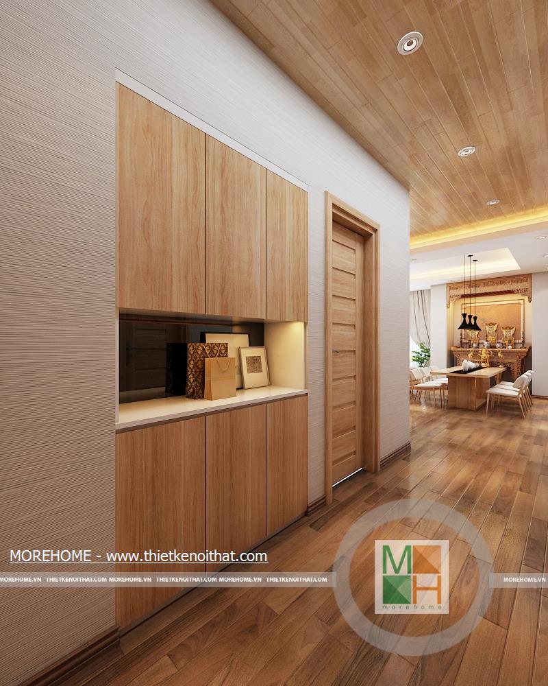 Bộ bàn ghế ăn được thiết kế cùng tông màu với phòng khách để tạo sự đồng bộ trong phong cách thiết kế. Điểm nhấn ở đây là những chiếc đèn thả màu đen độc đáo. Sự xuất hiện của những chiếc đèn này không chỉ bổ sung ánh sáng mà còn giúp không khí bữa ăn thêm đầm ấm, vui vẻ. Hốc tường trống bên cạnh bàn ăn được tận dụng để kê bàn thờ rất tiện lợi và không làm ảnh hưởng đến việc giao thông trong nhà. Thiết kế bàn thờ và các chi tiết phụ xung quanh được tính toán kĩ lưỡng với những nét khắc, nét chạm đẹp mắt. Họa tiết trang trí bàn thờ mang đậm phong cách Á đông, thể hiện lòng thành kính của gia chủ.
