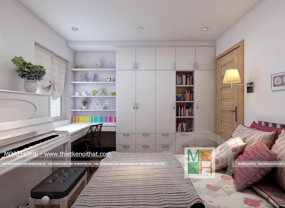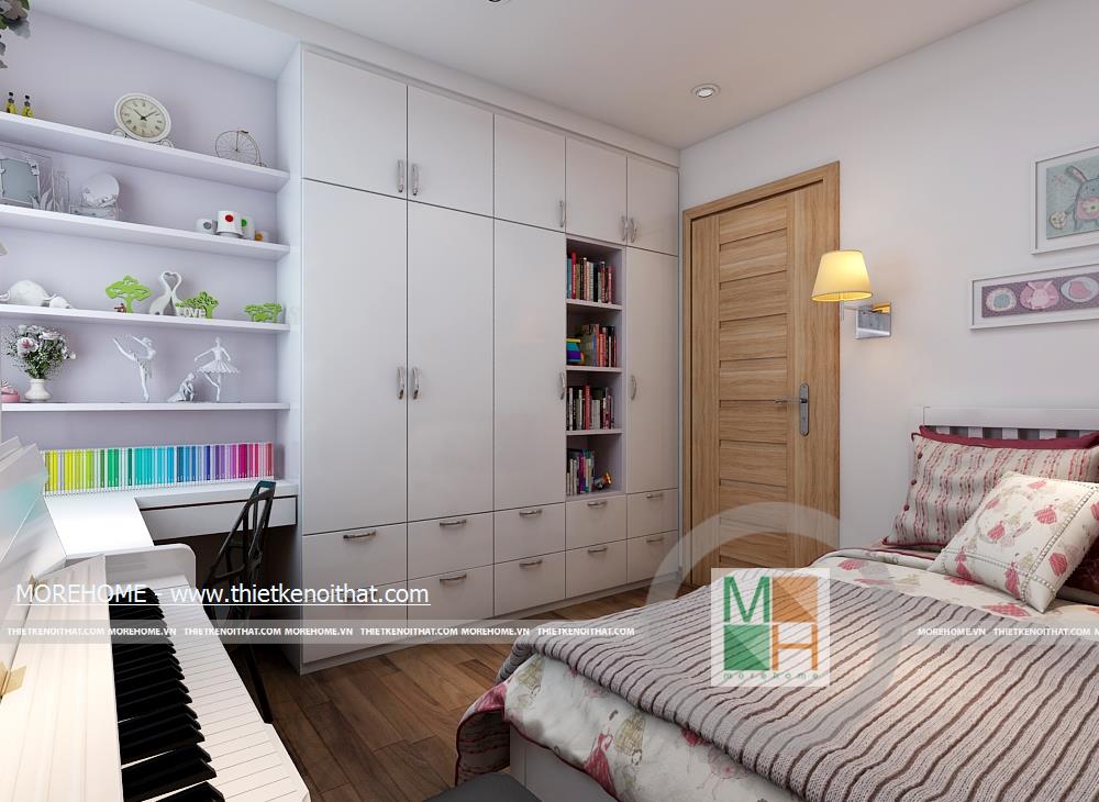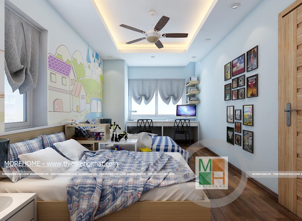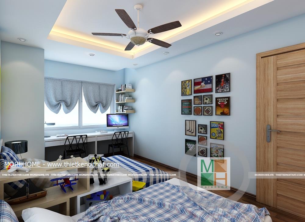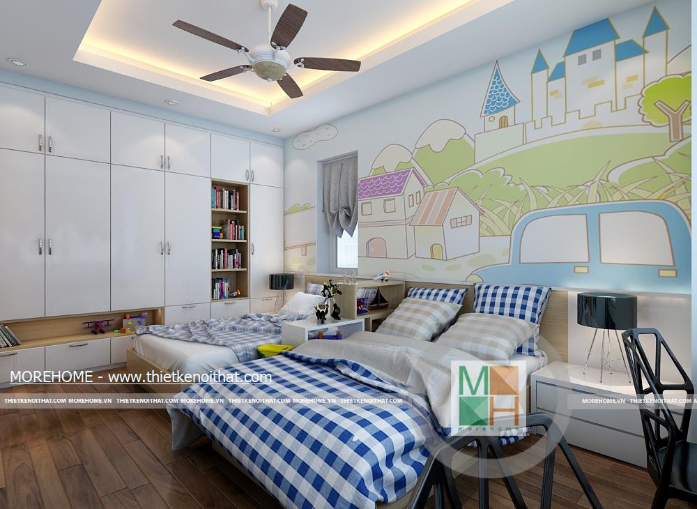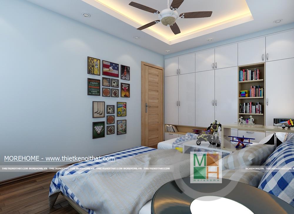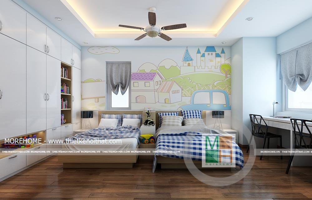 Phòng ngủ của hai cậu con trai sử màu xanh da trời làm nền để thể hiện sự năng động, sáng tạo. Ngăn cách giữa hai chiếc giường là một chiếc kệ nhỏ để các bé có thể đặt những món đồ chơi ngộ nghĩnh lên trên. Bàn học đảm bảo đủ cho hai người ngồi và được đặt sát cửa sổ để tận dụng ánh sáng. Tủ đồ âm tường giống phòng bố mẹ để hai bé có thể thoải mái hoạt động và vui chơi.