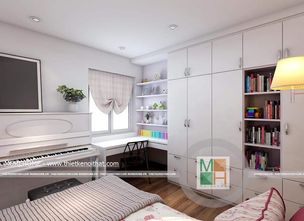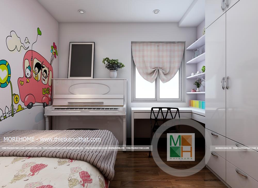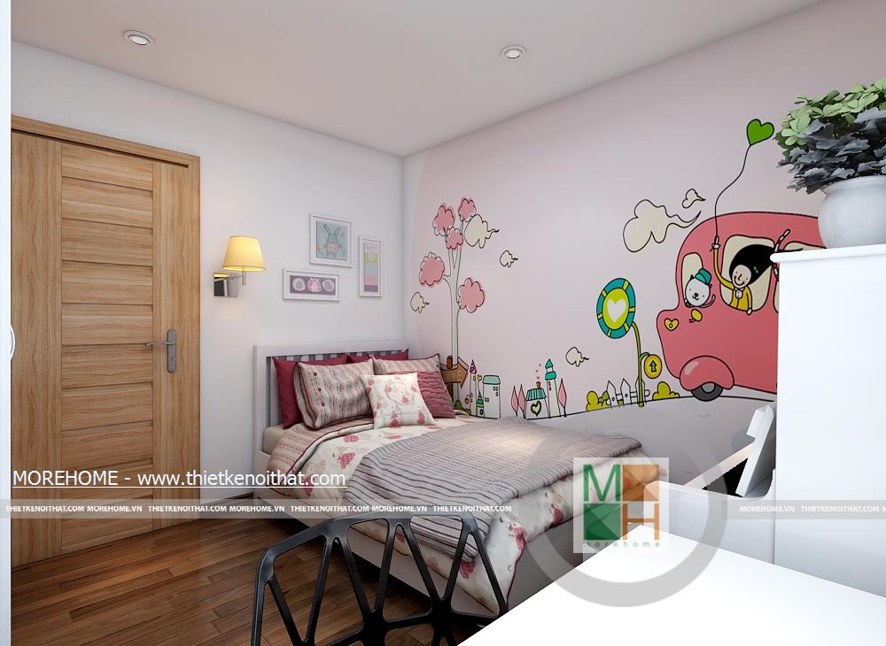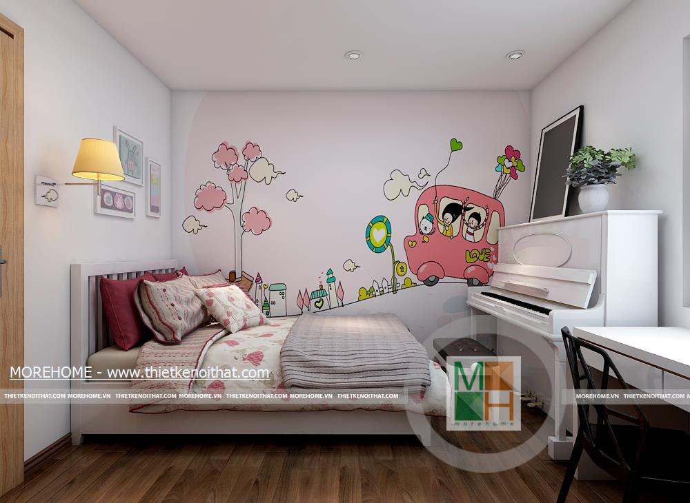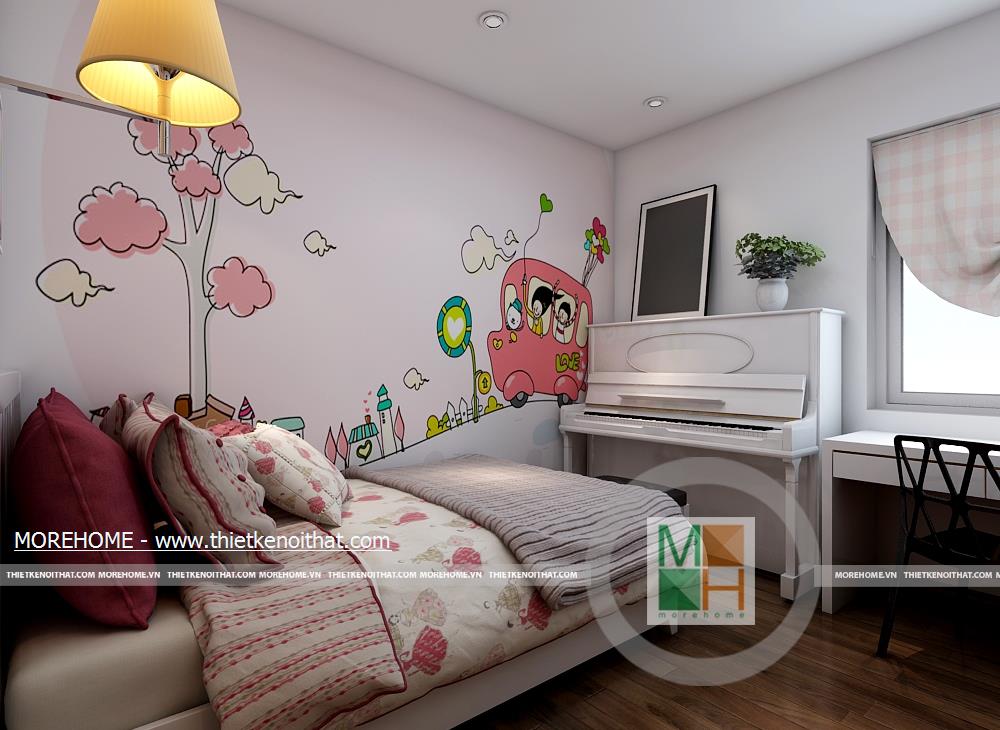 Phòng ngủ con gái có cách bài trí khá giống với phòng của con trai nhưng màu sắc trang trí chính lại là màu hồng. Mảng tường bên cạnh giường sử dụng giấy dán khổ lớn với những họa tiết vui nhộn, tạo không khí sinh động cho căn phòng. Chiếc piano trắng ở cuối giường vừa có tác dụng trang trí lại giúp cho con được gần gũi với âm nhạc, nghệ thuật từ khi còn bé.
