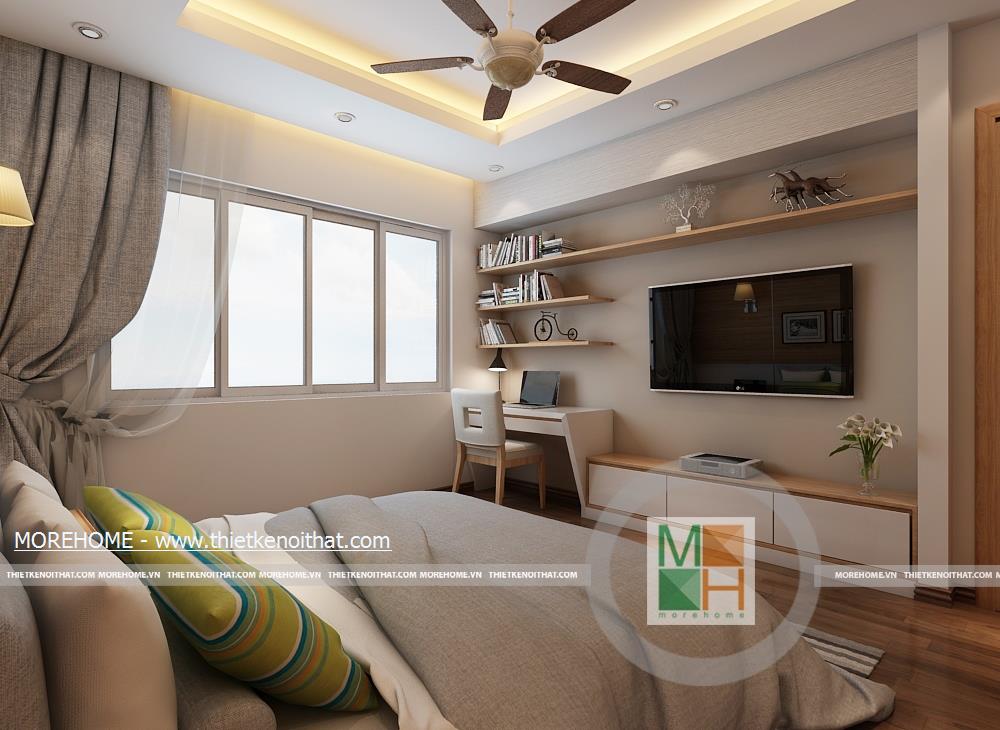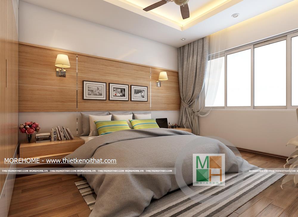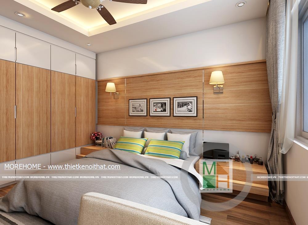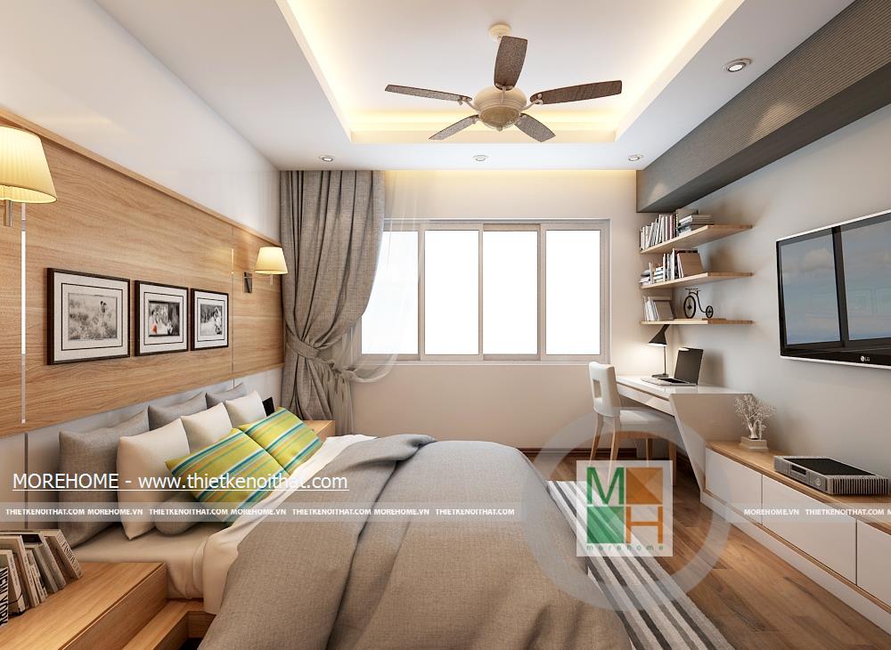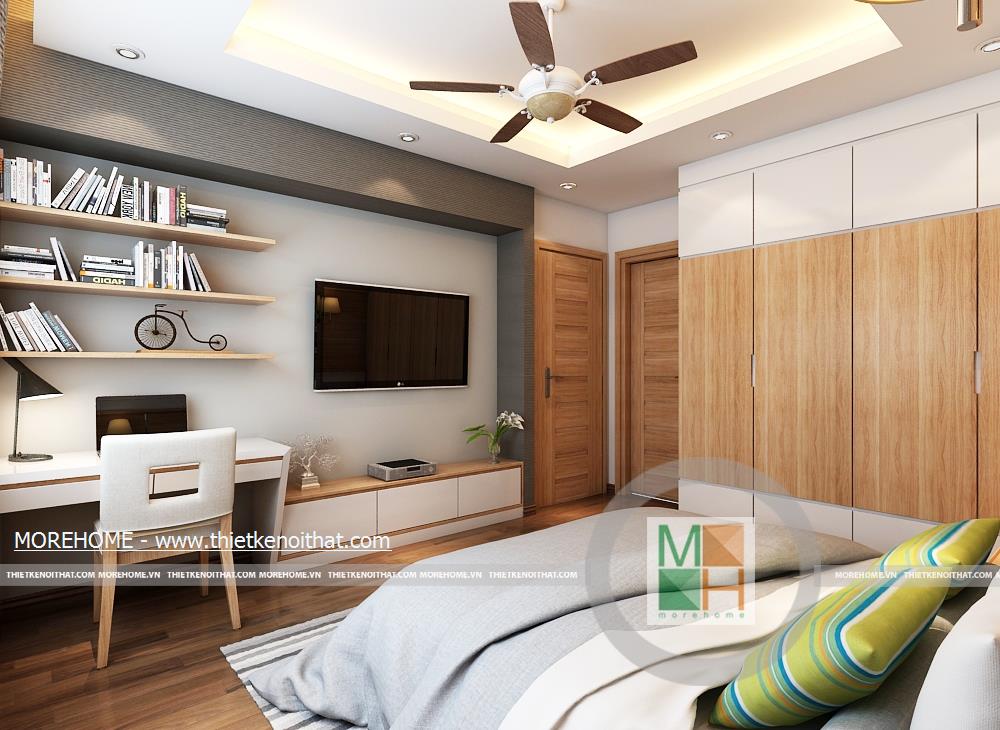 Phòng ngủ chính được thiết kế chắc chắn, phù hợp với những người chỉn chu và yêu thích sự tĩnh lặng. Cách bố trí đèn ngủ và táp ở hai bên giường thu hút được thị giác vào chính giữa phòng. Mảng tường ốp gỗ đầu giường làm nổi bật những bức tranh nền trắng được treo ở trên. Tủ quần áo đặt âm tường vừa tiết kiệm diện tích lại tăng phần không gian lưu trữ bên trong lên đáng kể. Bàn làm việc và kệ tivi kê sát nhau, đem đến cảm giác an toàn khi dùng.