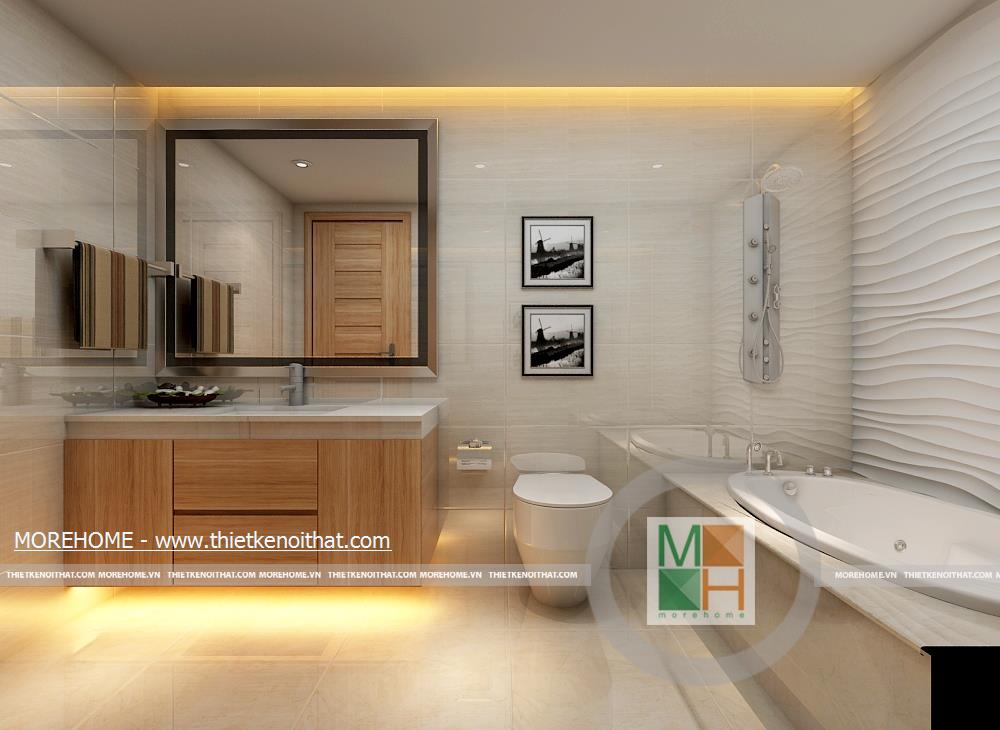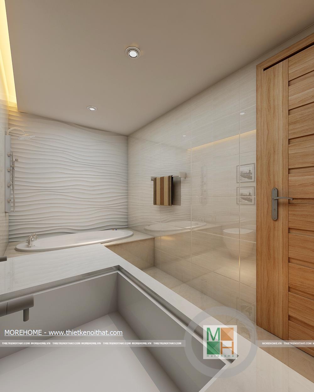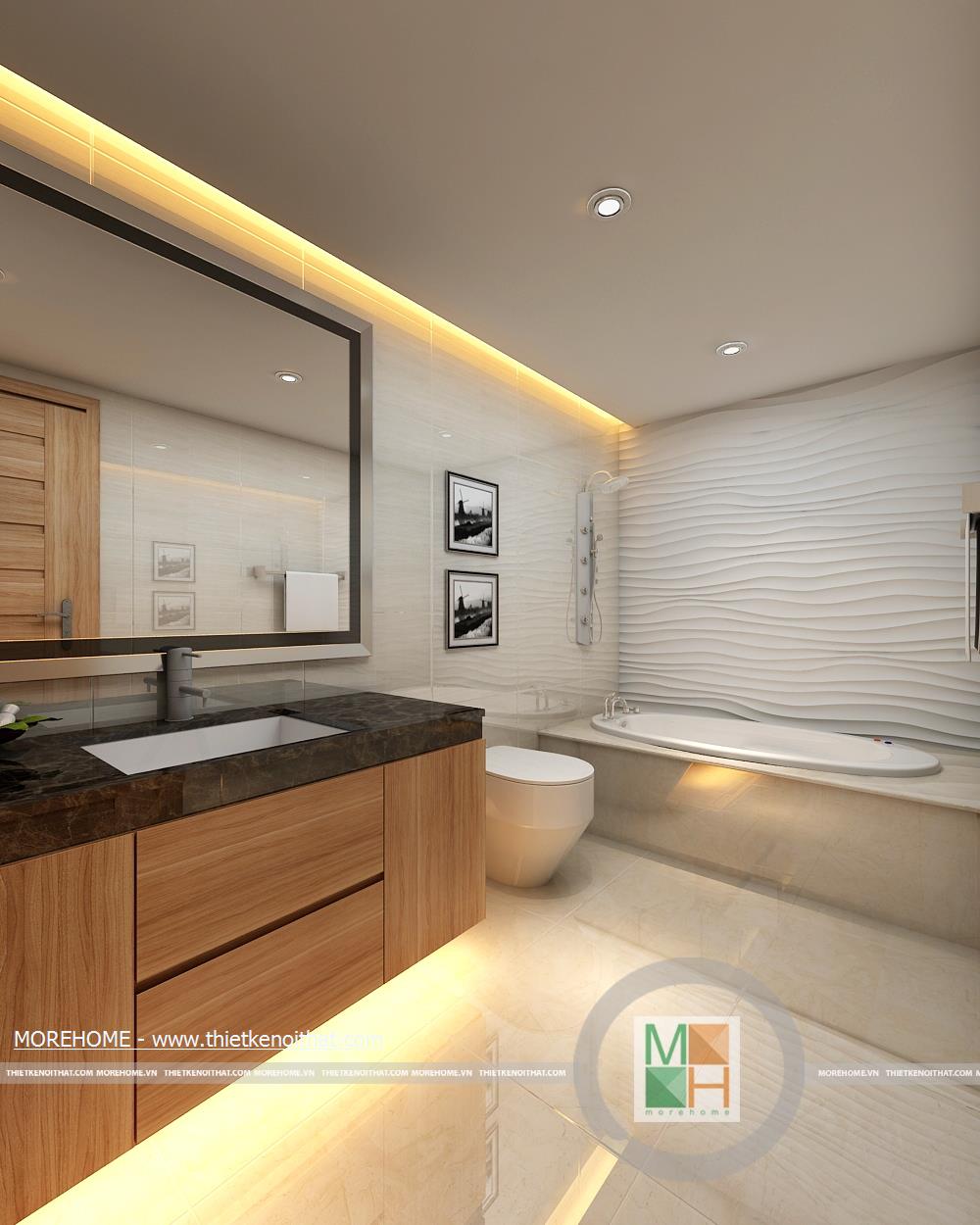 Phòng tắm của căn hộ sử dụng kính và những vật liệu có độ bóng cao để tạo cảm giác sạch sẽ và hiện đại. Phòng tắm master có trang bị bồn tắm nằm để gia chủ có thể ngâm mình trong nước ấm sau một ngày làm việc căng thẳng.